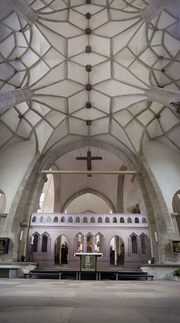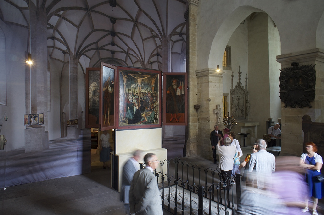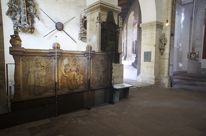 Zwischen den Westpfeilern der Vierung im Dom trennte bis zur endgültigen Einführung der Reformation ein steinerner Lettner den Chor vom Hauptschiff als kulissenartige Raumtrennung, die 1588 abgerissen wurde. Einige Fragmente des steinernen Ensembles sind noch erhalten, woraus sich eine virtuelle Rekonstruktion in Form eines Theaterprospekts herstellen ließ. Das leicht transparente und bedruckte Textil soll die ehemalige Architektur in einer realistischen Darstellung mit passenden Licht- und Schatteneffekten erkennbar machen. Gleichzeitig werden auf dem Prospekt die heute noch erhaltenen Fragmente in einem kühlen Grauton als farblicher Kontrast markiert und verweisen so auf die Originale. Da während der Ausstellungsdauer Gottesdienste, Konzerte sowie die Orgelfestspiele weiterhin stattfinden, ist es möglich, den Prospekt per Seilzug temporär hochzuziehen.