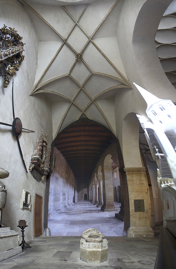 Das Besondere an der Ausstellung ›1000 Jahre Kaiserdom Merseburg‹ ist, dass manche Kausalitäten des Erzählstrangs, gerade bei frühen, fragmentarischen Quellen, anstelle mit Originalobjekten mit Inszenierungen zu vermitteln sind: Die schmucklose Ostwand direkt am Eingang aus dem Kassenraum in der Vorhalle des Domes ist vollflächig mit einem Illusionsbild bespannt, das den Einblick in eine romanische Basilika zeigt, das mit elektronischer Bildbearbeitung des Seitenschiffs der Quedlinburger Stiftskirche St. Servatius erzeugt wurde. Ein noch größeres Bild ist an der benachbarten großen mittleren Ostwand in der Vorhalle zu sehen. Seit 1700 zeigt sich dort die Rückwand der gigantischen Orgel in der Art einer stilisierten Hausfassade mit Fenstern und Baudekoration. Bei der Ausstellung erscheint der einstige Blick in den Hauptraum des Merseburger Doms unverbaut – ebenfalls durch ein Illusionsbild, das vom Publikum in der Rundgangsfolge durchschritten, wird um in die Haupthalle zu gelangen.