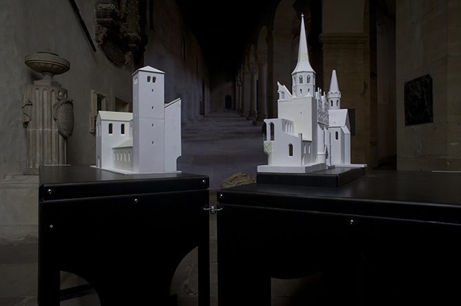 Ein Doppelmodell veranschaulicht zwei Bauphasen des Doms. Während die eine Hälfte den Dom in seiner romanischen Ausformung präsentiert, gibt die andere Hälfte Einblick in den weitgespannten spätgotischen Bau mit Ansätzen des Kreuzgangs ohne die Einbauten nach der Reformation, so wie sie heute noch in situ erlebbar sind. So stehen sich Basilika und Hallenkirche klappbar gegenüber und erlauben einen direkten Vergleich.