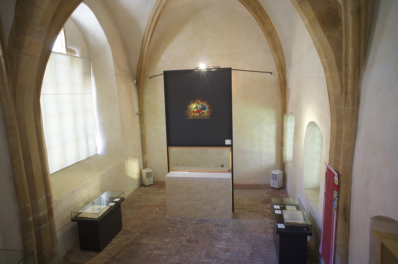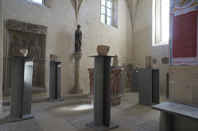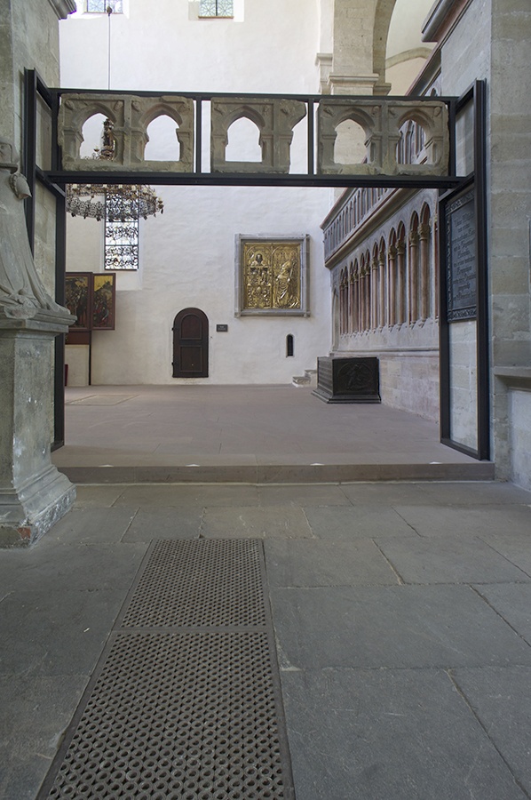 Ebenfalls im Mittelschiff der Vorhalle stehen Abbilder der steinernen Schranken im Originalmaßstab, die beim Betreten des Hauptschiffes aus der Vorhalle rechts und links zu sehen sind. Diese Drucke auf Glas sind in der Vorhalle so angeordnet, dass das Publikum dahinter treten kann, da wo einst wohl Gestühl aufgestellt war.