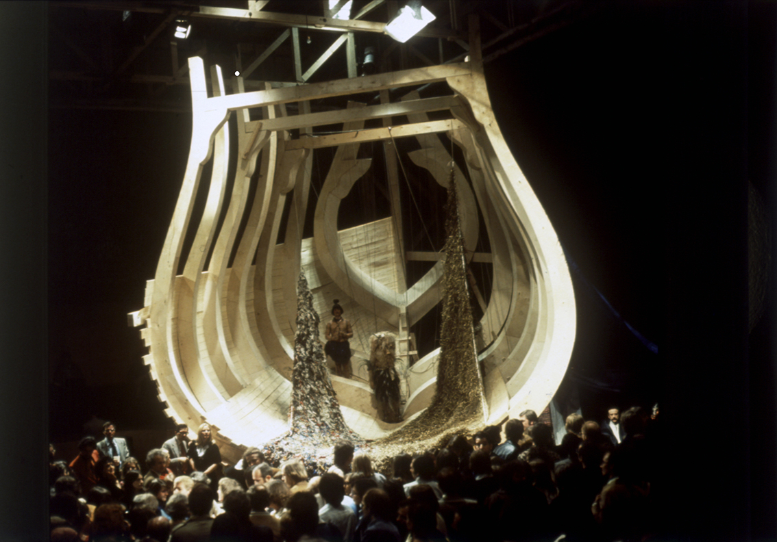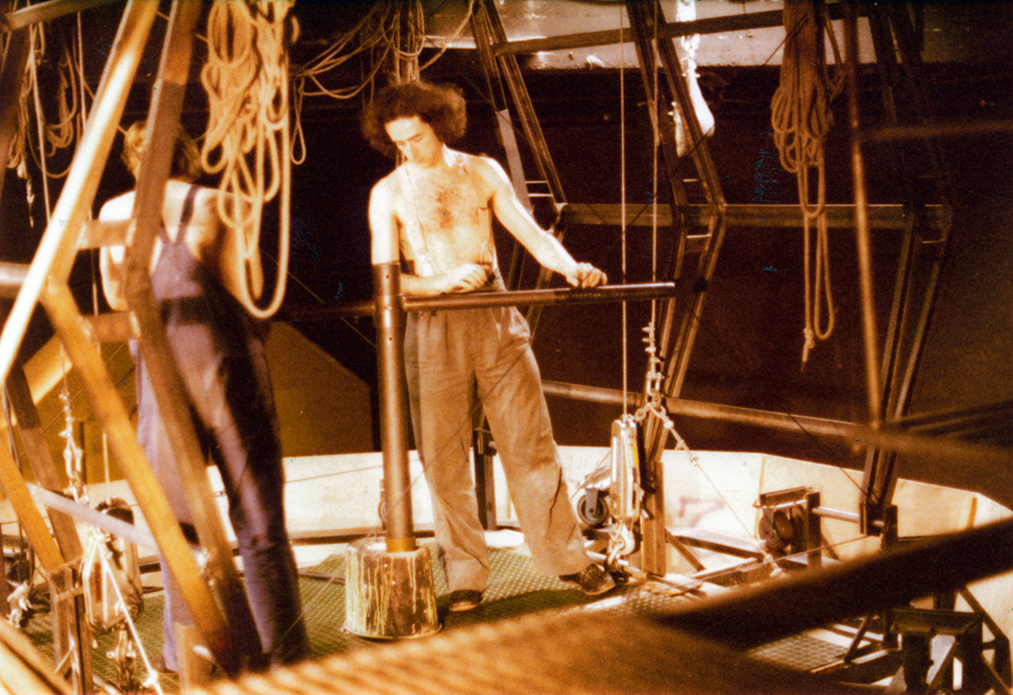 Das erste Foto zeigt eine Szene, die das zeitliche Zusammentreffen damaliger Entdeckungen in einem Bühnenbild von Karl-Ernst Herrmann vergegenwärtigte. Dafür wurde ein Schiffsrumpf auf Rollen in die richtige Position unter das Spielgerüst gebracht. Jürg Steiner konstruierte diesen nach Plänen historischer Schiffe. Die theatermäßig als »Rohre aus Sperrholz« hergestellten Spanten waren wegen ihrer wechselnden Querschnittsflächen eine besondere Herausforderung für die Tischlerei. Im zweiten Bild folgt das Publikum dem Spiel von Wolf Redl.