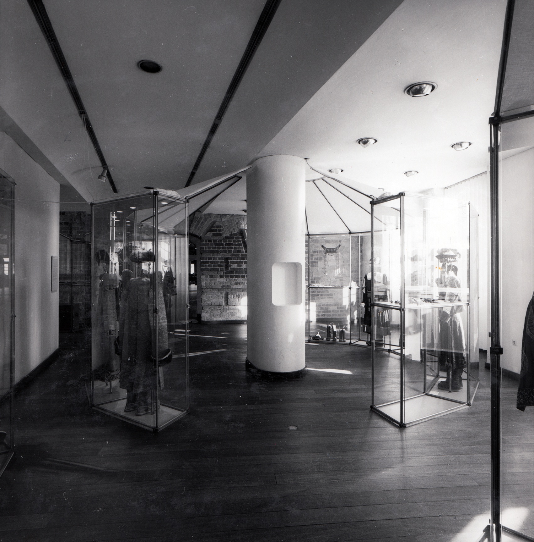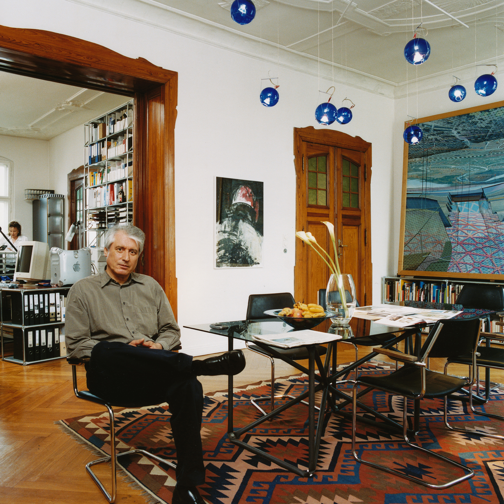 Eigens für das System 180 wurde dieses Tischuntergestell konzipiert. Statik und freie Wahl von Winkeln harmonieren mit der formalen Gestaltung des Gestells, auf das üblicherweise eine Glasplatte gelegt wird. Während bei den Beinen jeweils beide Rohre, die zu einem Fusspunkt laufen, schräg nach oben führen, verläuft bei den oberen Rohrpaaren das obere waagrecht, so dass nicht nur die äusseren Punkte, sondern auch die vier inneren die Glasplatte tragen.