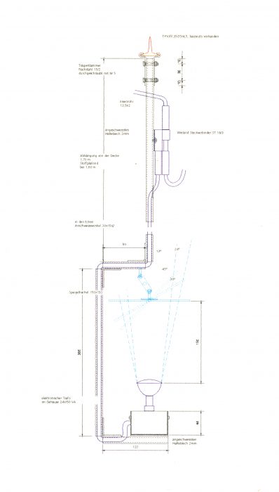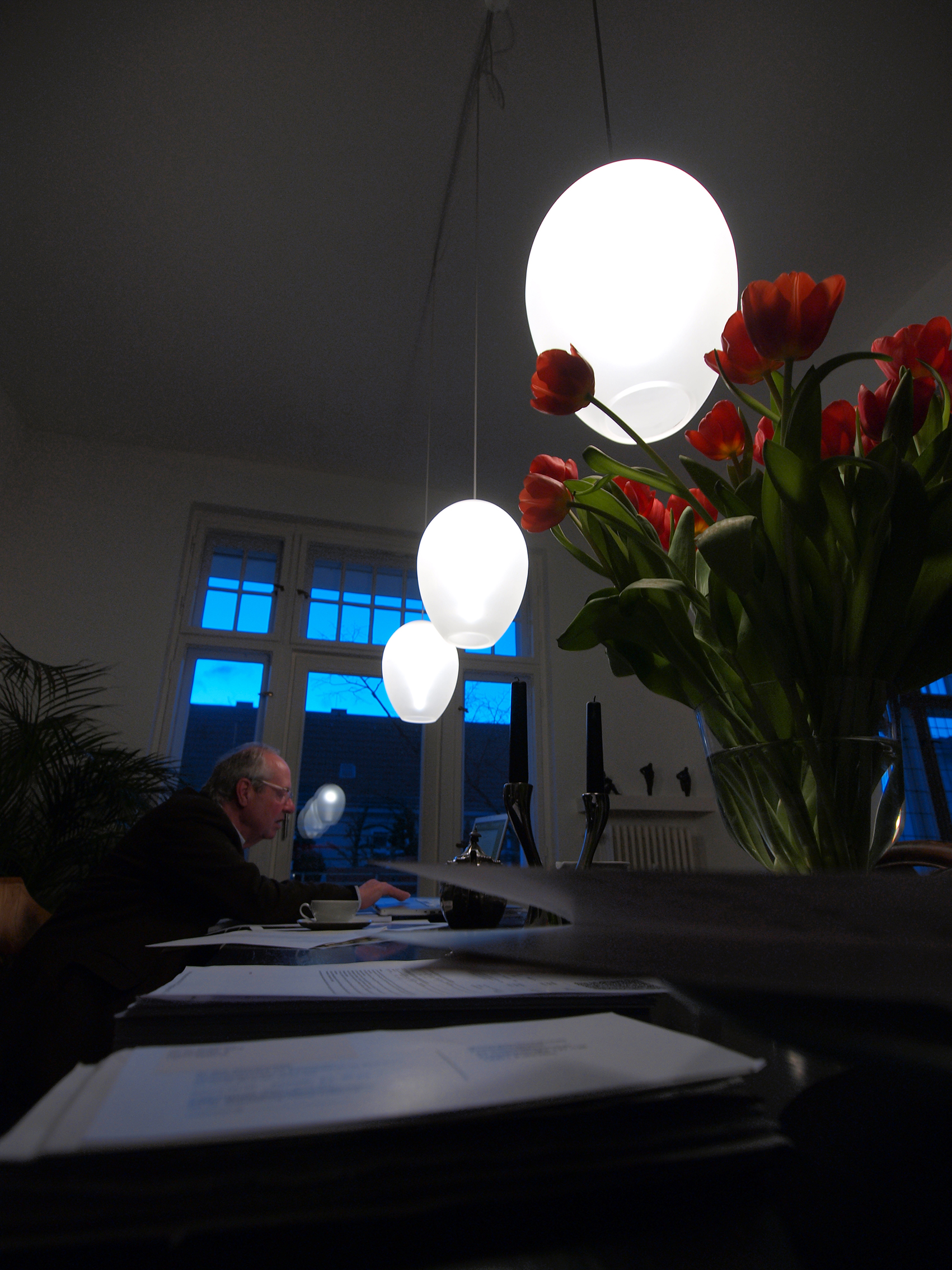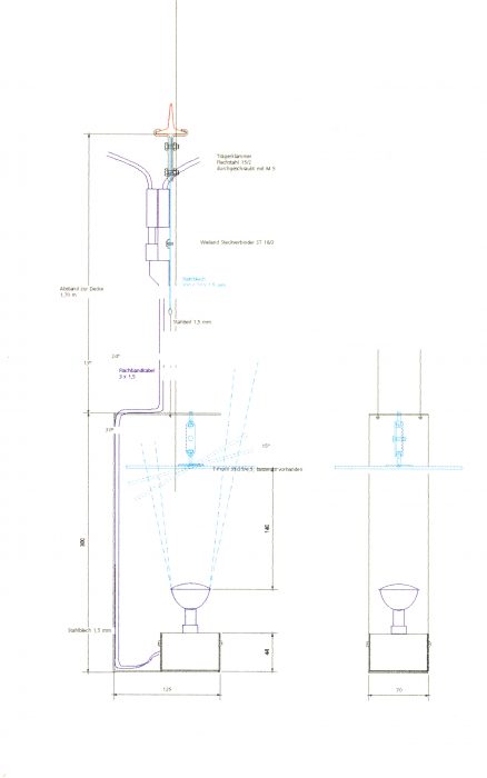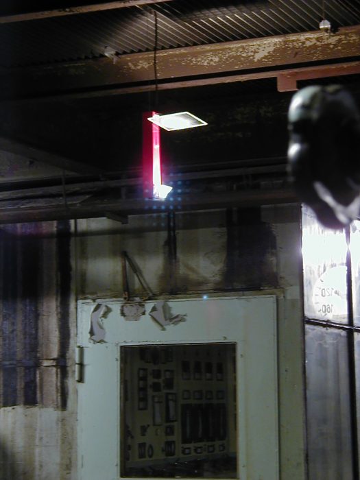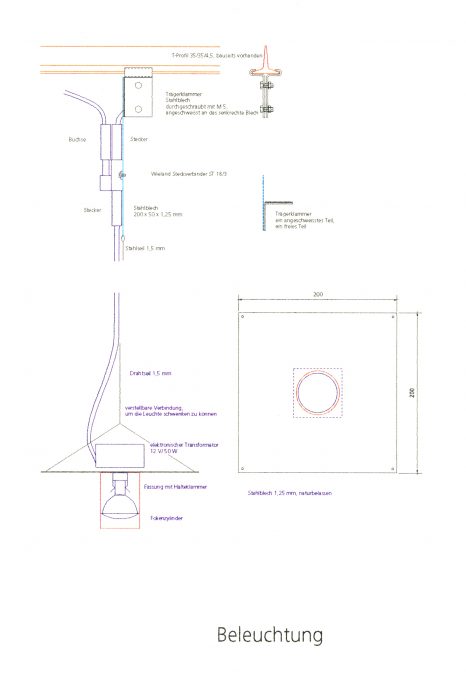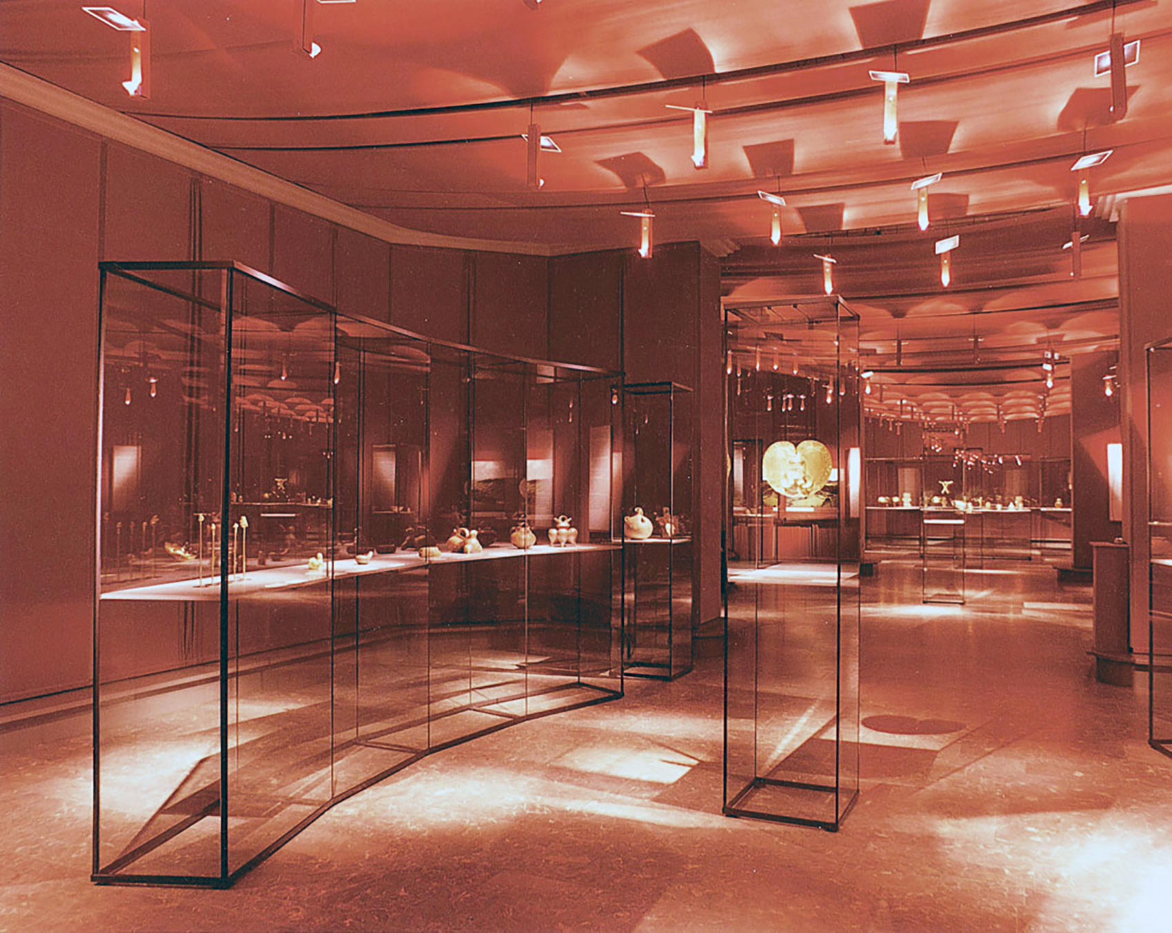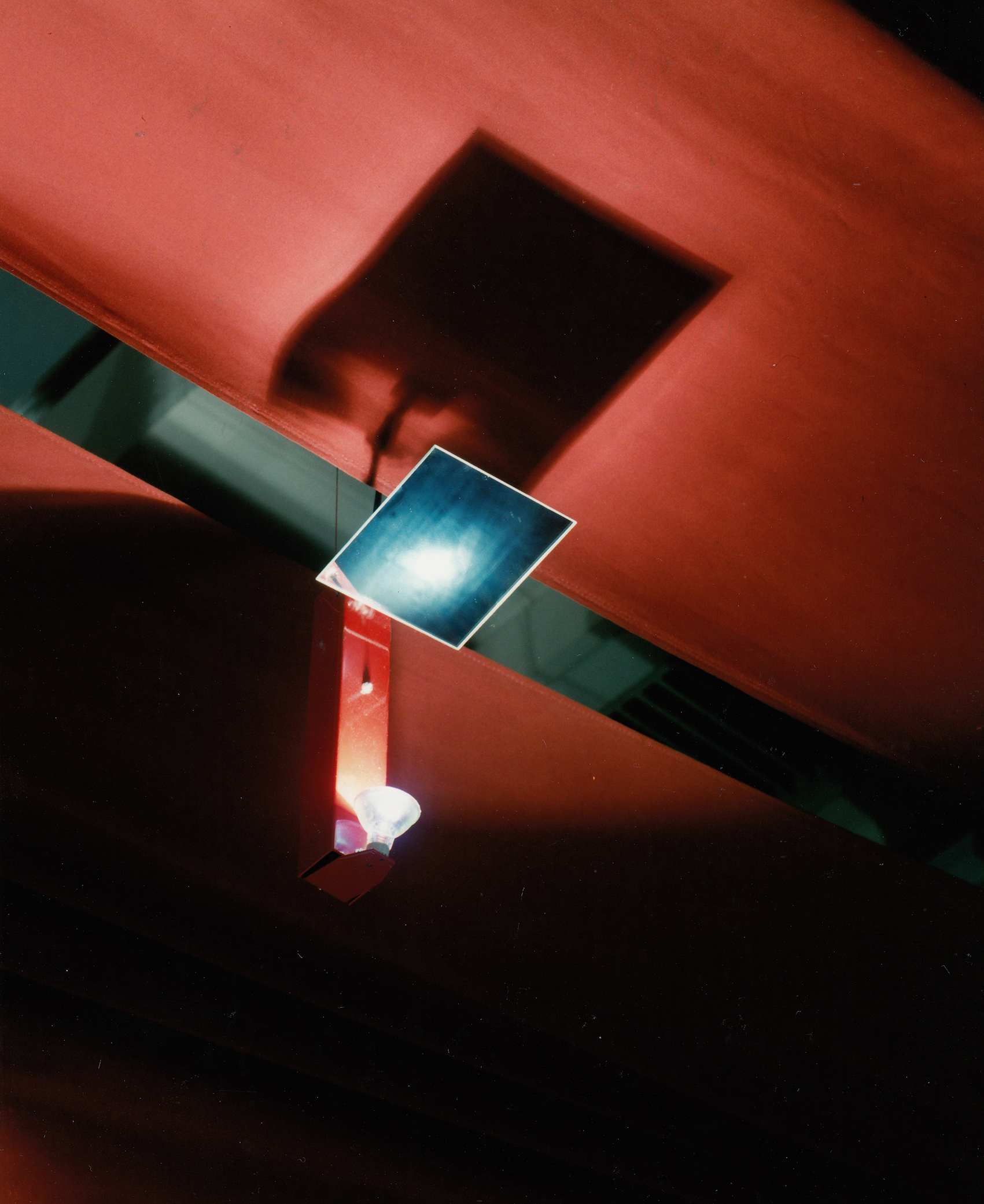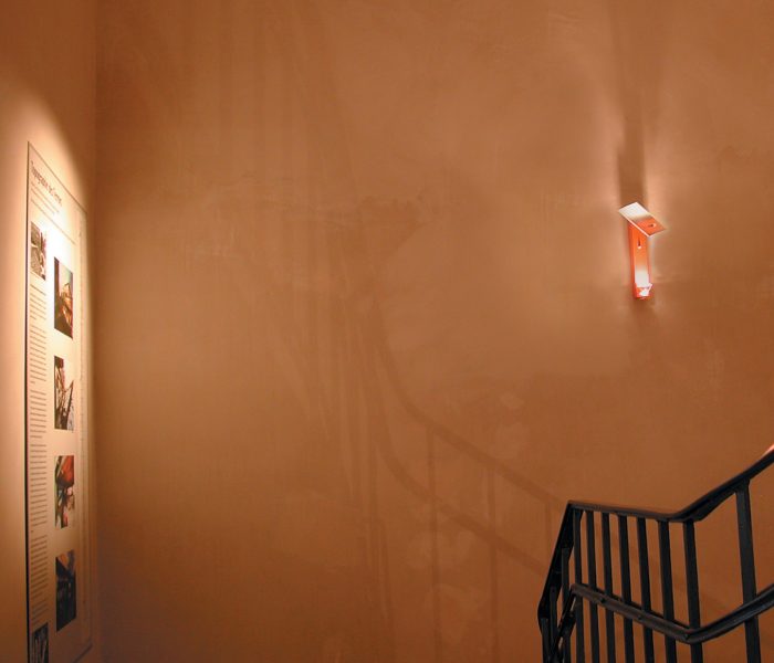 Die Leuchte wurde zusammen mit der Museumstechnik GmbH in Berlin für die Ausstellung ›El Dorado – das Gold der Fürstengräber‹ im Alten Museum in Berlin-Mitte entwickelt. In der Ausstellung hing sie an zwei Stahlseilen von der Decke ab. Im lackierten Blechkörper ist ein Transformator untergebracht. Die Kaltlichtspiegellampe strahlt nach oben, das gebündelte Licht wird über den ausrichtbaren Spiegel szenisch eingesetzt, das Restlicht zeichnet sich an Wand und Decke ab. Über Jahre fragte man sich, warum diese einfache, sinnfällige Leuchte kaum verkauft werden konnte. Sie hätte wohl konsequenter als Wandleuchte angeboten werden müssen. Womöglich hinderte die rote Farbe – für die Ausstellung richtig – den Verkauf.