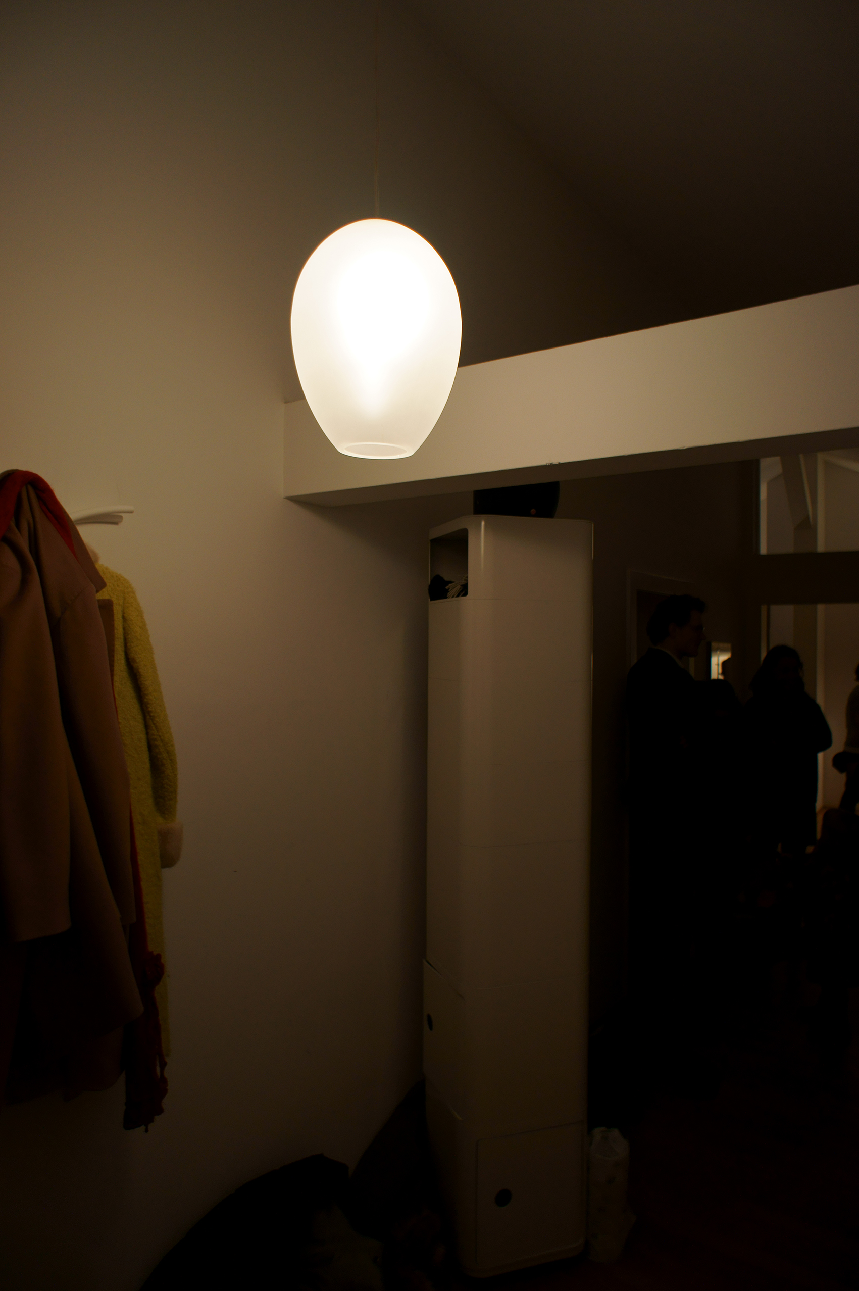 Die Leuchte wurde im Zuge der Vorbereitung der Ausstellung ›Feuer und Flamme – 200 Jahre Ruhrgebiet‹ 1994 entwickelt. Der Erstausstellung im Gasometer Oberhauseen lag ein anspruchsvolles Beleuchtungskonzept zu Grunde mit unterschiedlichen Leuchten mit verschiedenen Lampen in den einzelnen Kapiteln. Die Idee hinter der Eierleuchte lässt sich als Zeichen umschreiben, das selbst leuchtet und im Stande ist, bei entsprechender Lampenbestückung, ein darunter stehendes Objekt punktförmig anzustrahlen. In einem „musée sentimental“ als Auftakt der Ausstellung bildeten Vitrinen und Eierleuchten ein ideales Präsentationsumfeld für die erinnerungsschwangeren Objekte. In der ursprünglichen Fassung leuchtete eine Halogenreflektorlampe mit Stiftsockel senkrecht nach unten. Das Nebenlicht erhellte den eiförmigen Körper, dessen unteres Ende zum direkten Lichtaustritt und zum Lampenwechsel kreisrund ausgeschnitten ist. Später kamen Varianten mit einer E27-Fassung dazu, die früher mit Kompaktleuchtstofflampen oder Glühlampen bestückt werden konnten. Heute kommen als weitere Lichtquelle so genannte LED-Retrofit-Leuchtmittel hinzu.