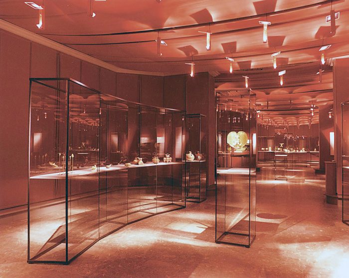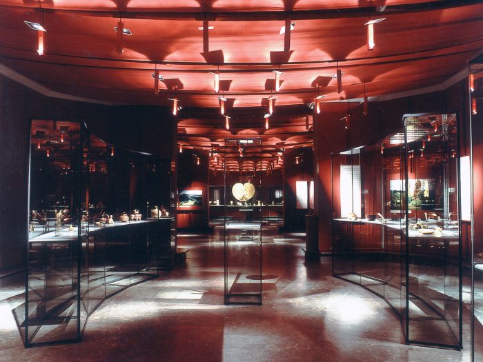 Manuela Fischer konzipierte die Schau für das Berliner Völkerkunde-Museum. Der schmucklose Innenraum des Alten Museums aus den 1950er Jahren rückten wir durch die Abhängung mit roten Stoffbahnen in den Hintergrund.