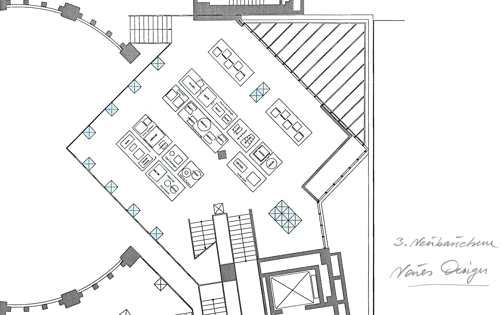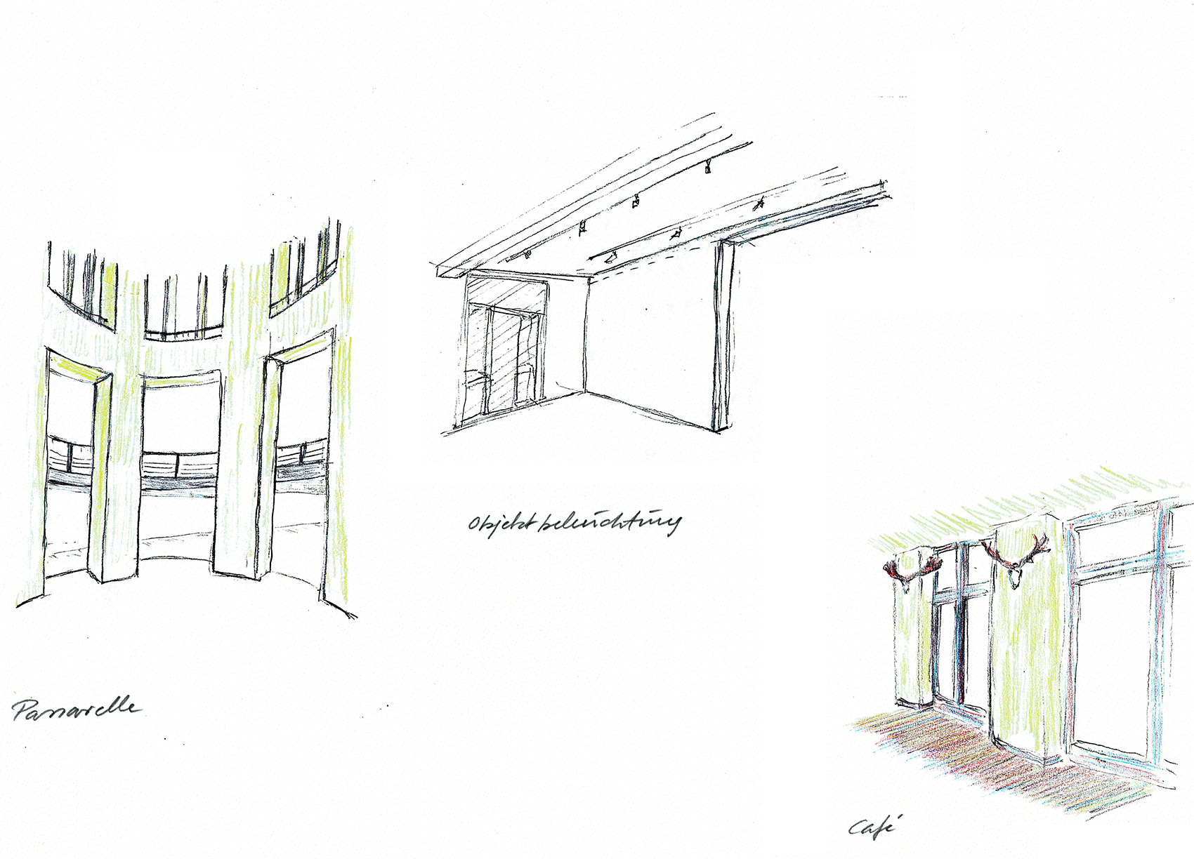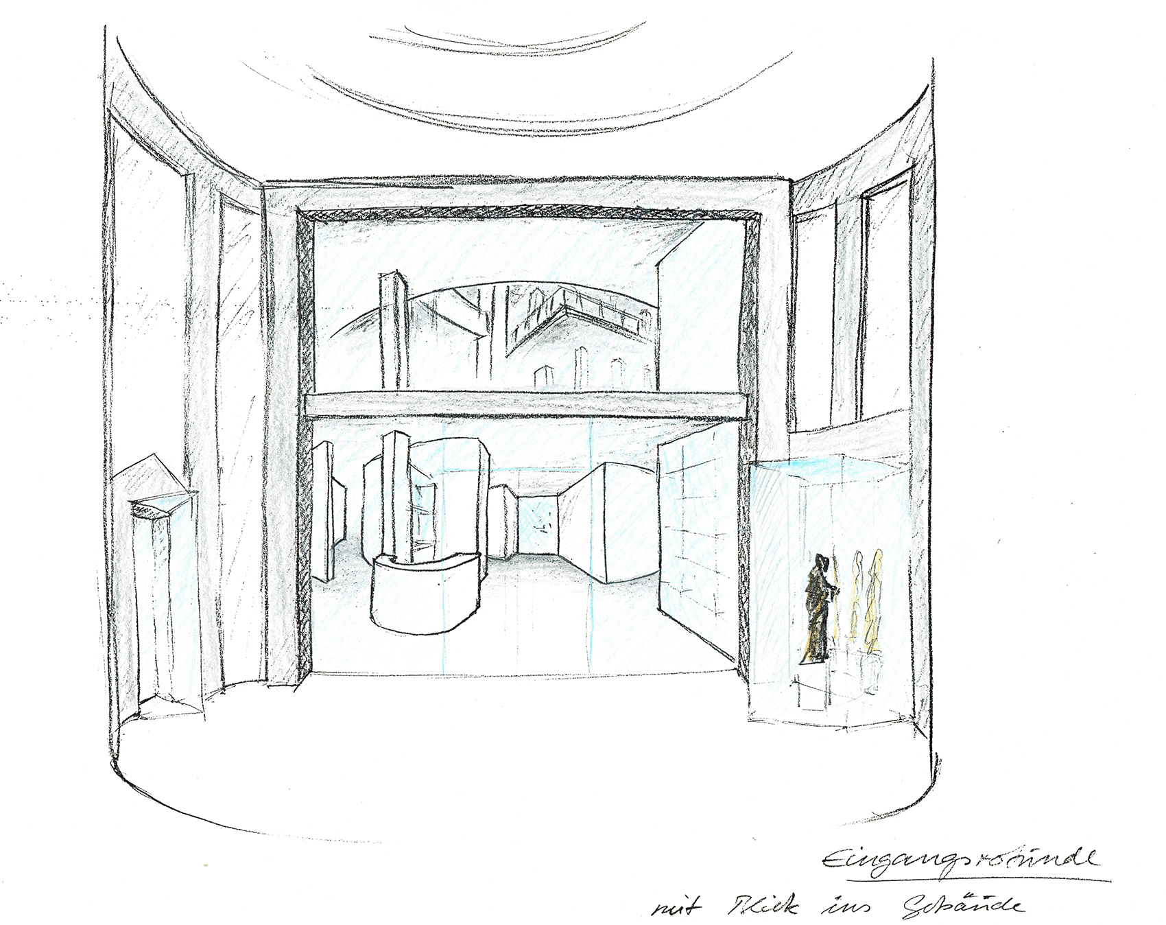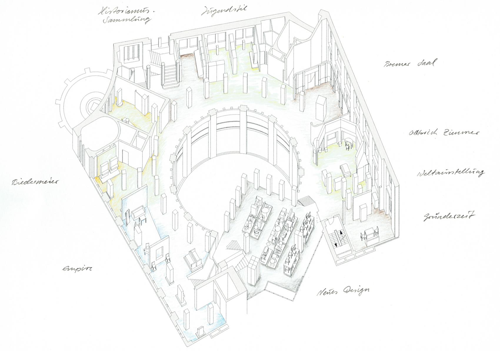 Bei der jetzigen, dritten Phase des Wettbewerbs, haben wir den Wunsch berücksichtigt, den Haupteingang an der bisherigen Stelle in der Südostecke des Museums zu belassen. Die selbstgestellte Forderung, einen Rundgang durch die Abteilungen des Museums gewährleisten zu können, hat unser Konzept weitgehend bestimmt. Grundlage ist hierbei nicht eine strenge und formale chronologische Reihenfolge, sondern die Abfolge einzelner Themen, die jeweils einen Teilbereich hervorheben und sich logisch in die Reihung, die durch den Rundgang vorgegeben wird, einpassen.