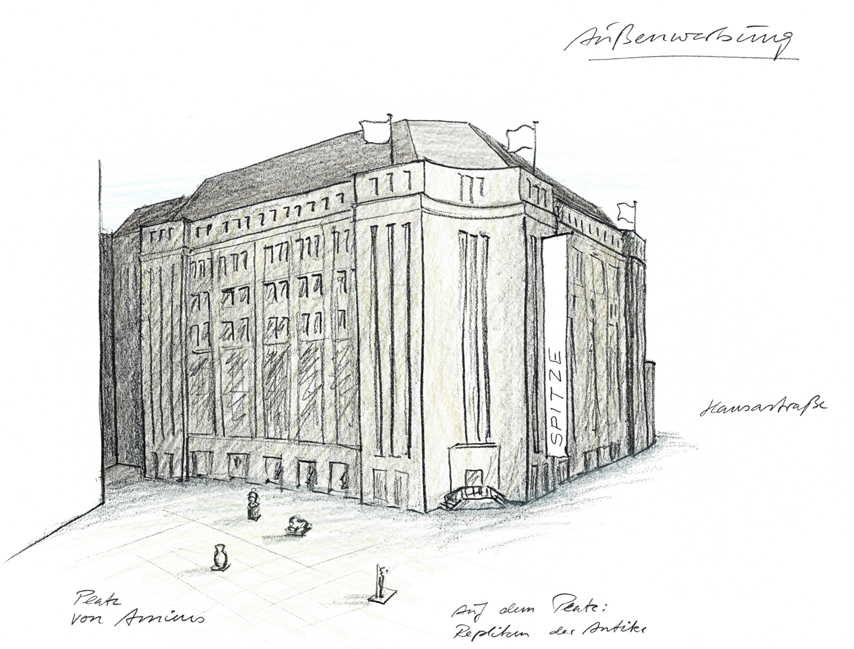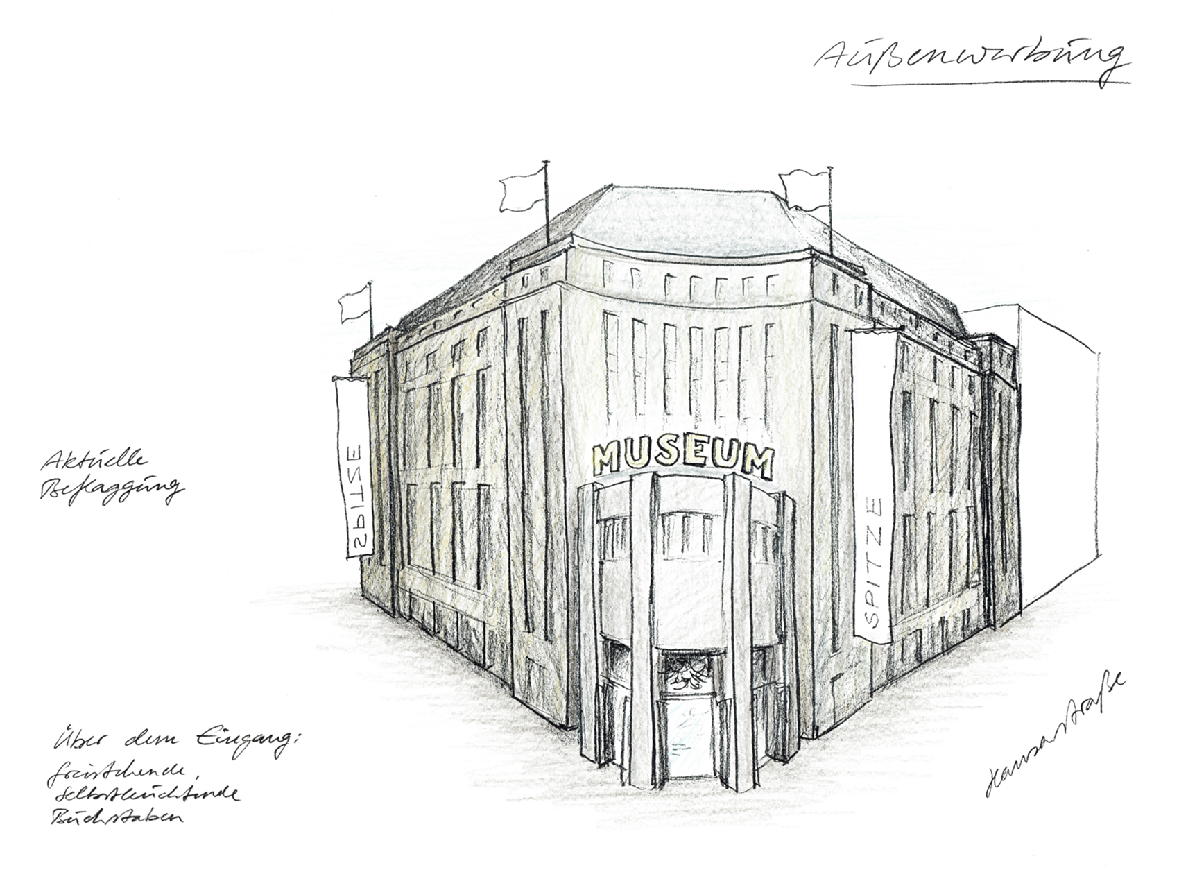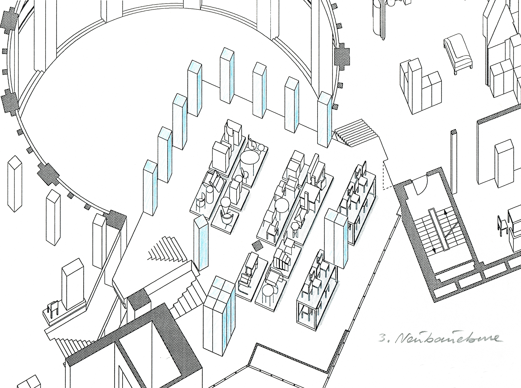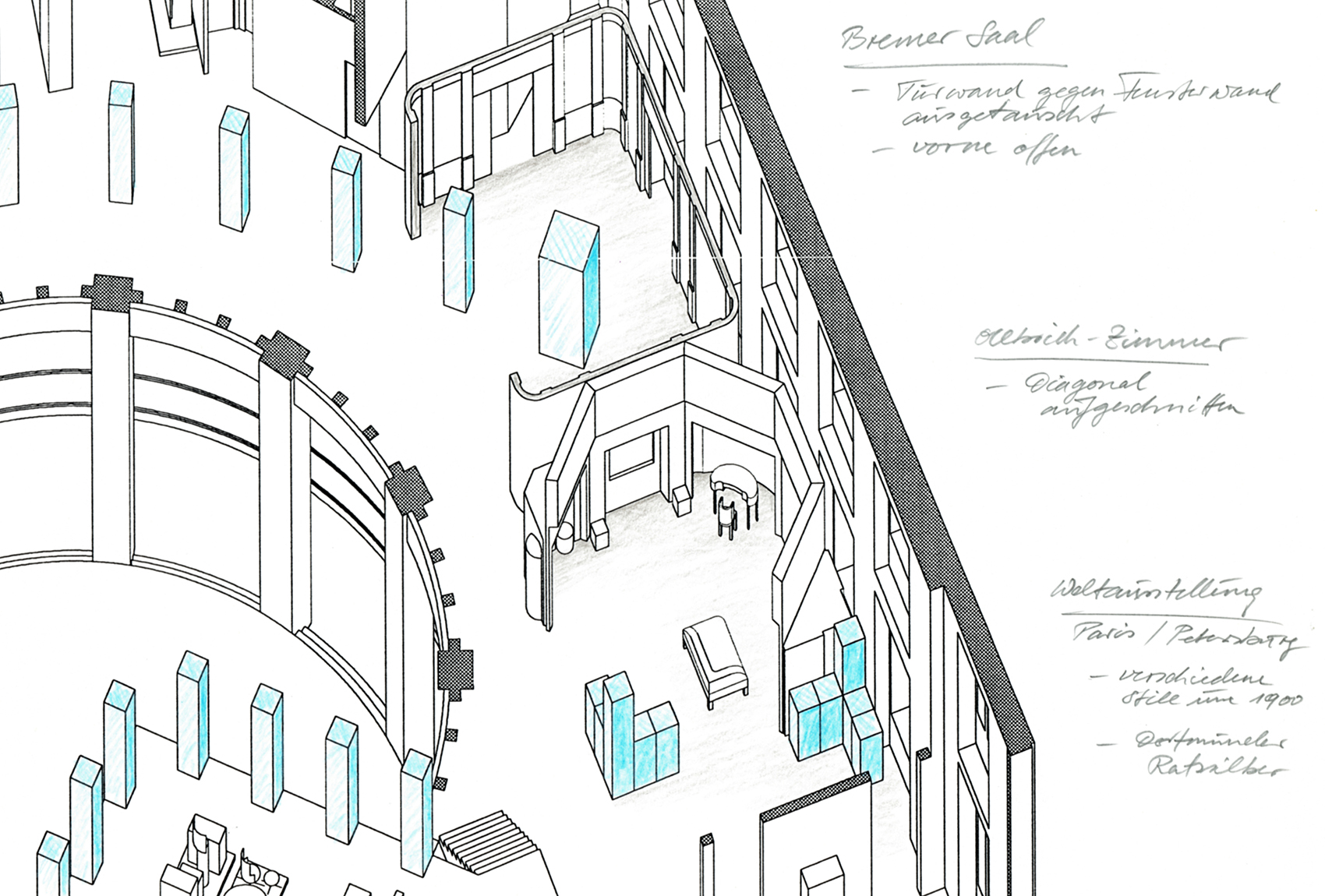 Bei der jetzigen, dritten Phase des Wettbewerbs, haben wir den Wunsch berücksichtigt, den Haupteingang an der bisherigen Stelle in der Südostecke des Museums zu belassen. Die selbstgestellte Forderung, einen Rundgang durch die Abteilungen des Museums gewährleisten zu können, hat unser Konzept weitgehend bestimmt. Grundlage ist hierbei nicht eine strenge und formale chronologische Reihenfolge, sondern die Abfolge einzelner Themen, die jeweils einen Teilbereich hervorheben und sich logisch in die Reihung, die durch den Rundgang vorgegeben wird, einpassen.