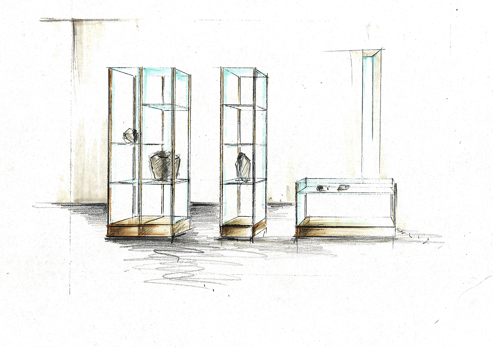Die Halle gliedert sich in drei klar definierte Bereiche: den verglasten Eingangs- und Foyerbereich, die großflächige Ausstellungshalle mit hochwertigen, klimastabilen Vitrinen sowie einen abgetrennten Videobereich. Besonders markant sind die gebogenen Innenwände, die architektonisch sowie funktional für eine klare Raumstruktur sorgen. Materialien wie Sichtbeton, Kalksteinmauerwerk und ein gewölbtes Oberlichtdach aus Brettschichtholz prägen das Erscheinungsbild.