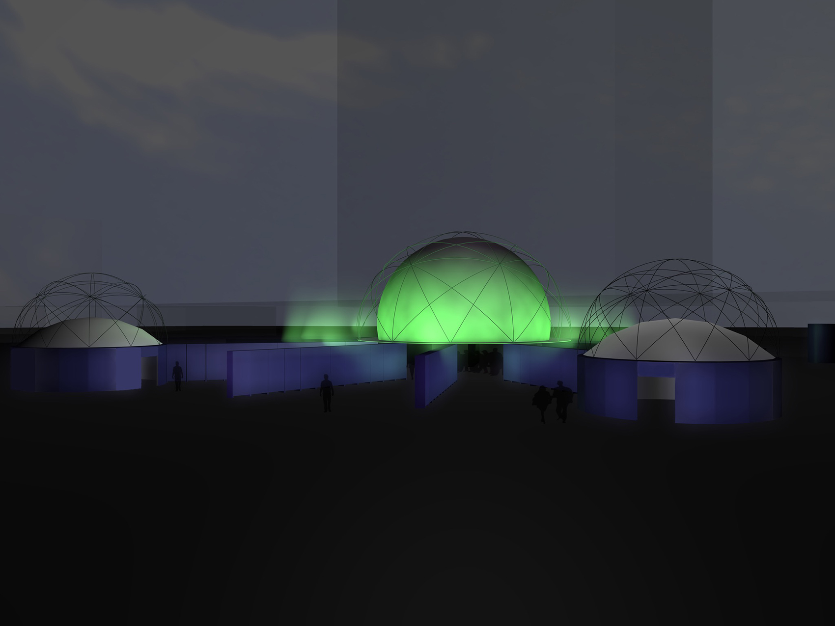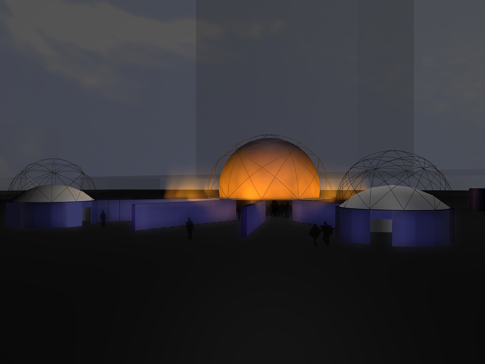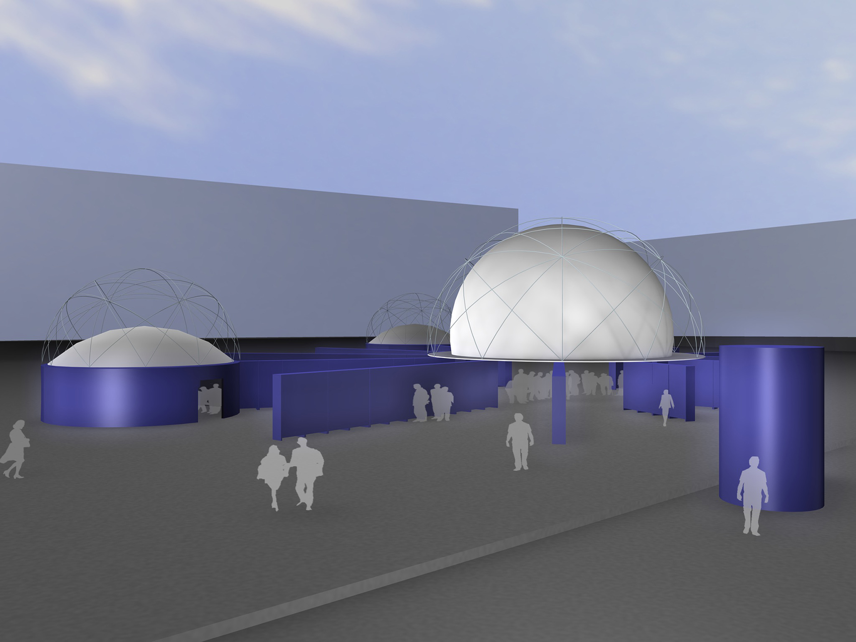 Es werden in sich abgeschlossene Kapitel dargestellt, so dass das Publikum an jeder Stelle mit dem Ausstellungsrundgang beginnen kann. Unter der Kuppel angelangt, ist der Weg zum nächsten Strahl nicht weit, der dann von innen nach außen begangen wird. Gleichzeitig besteht die Möglichkeit im öffentlichen Raum und dennoch geschützt, unter der Kuppel des Projektionsrundes, eine zentrale, bewegte Bildprojektion zu zeigen und die Ausstellung so zu einem medialen Ereignis zu machen. Diese zentrale Kuppel dient gleichzeitig auch als temporärer Veranstaltungsort mit einer Fläche von 200 qm für gut 300 Personen. Hier können die Eröffnungsveranstaltung, Medientermine, Filmvorführungen, sowie szenische Auftritte stattfinden, da die Kuppel wetterunabhängig nutzbar ist.