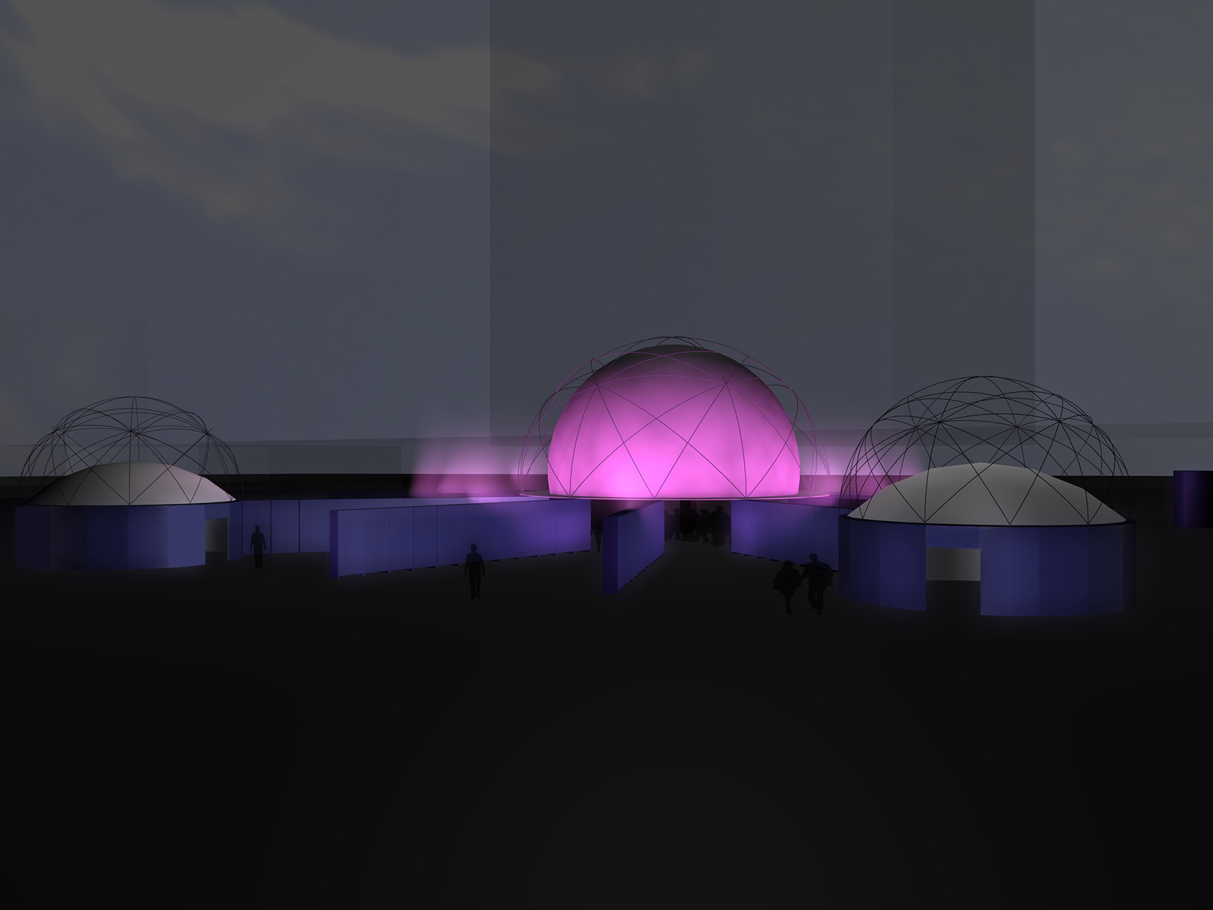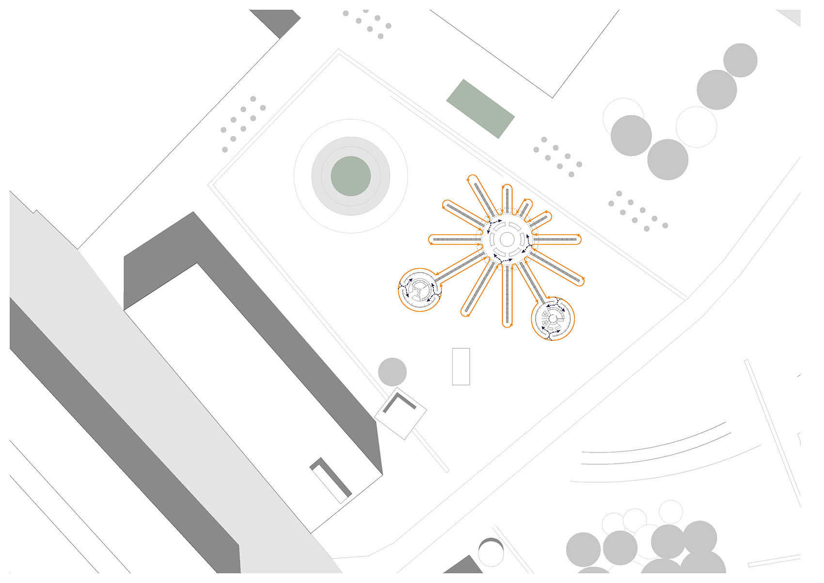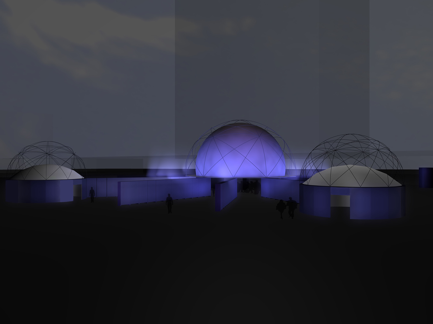 Es werden in sich abgeschlossene Kapitel dargestellt, so dass das Publikum an jeder Stelle mit dem Ausstellungsrundgang beginnen kann. Unter der Kuppel angelangt, ist der Weg zum nächsten Strahl nicht weit, der dann von innen nach außen begangen wird. Gleichzeitig besteht die Möglichkeit im öffentlichen Raum und dennoch geschützt, unter der Kuppel des Projektionsrundes, eine zentrale, bewegte Bildprojektion zu zeigen und die Ausstellung so zu einem medialen Ereignis zu machen. Diese zentrale Kuppel dient gleichzeitig auch als temporärer Veranstaltungsort mit einer Fläche von 200 qm für gut 300 Personen. Hier können die Eröffnungsveranstaltung, Medientermine, Filmvorführungen, sowie szenische Auftritte stattfinden, da die Kuppel wetterunabhängig nutzbar ist.