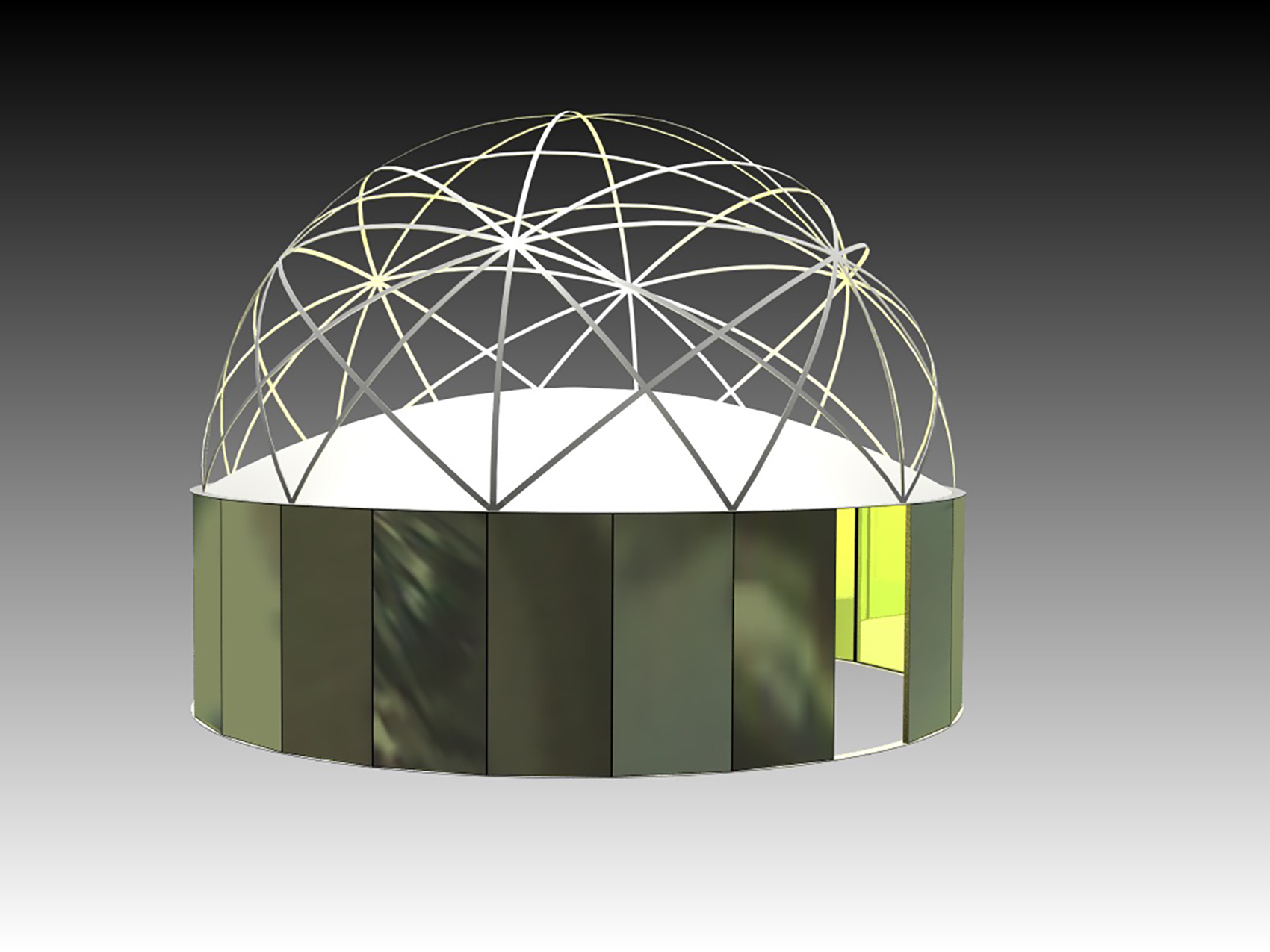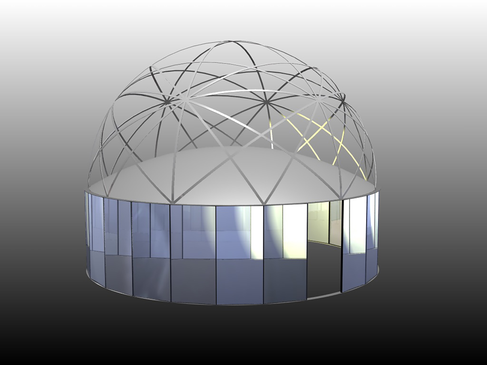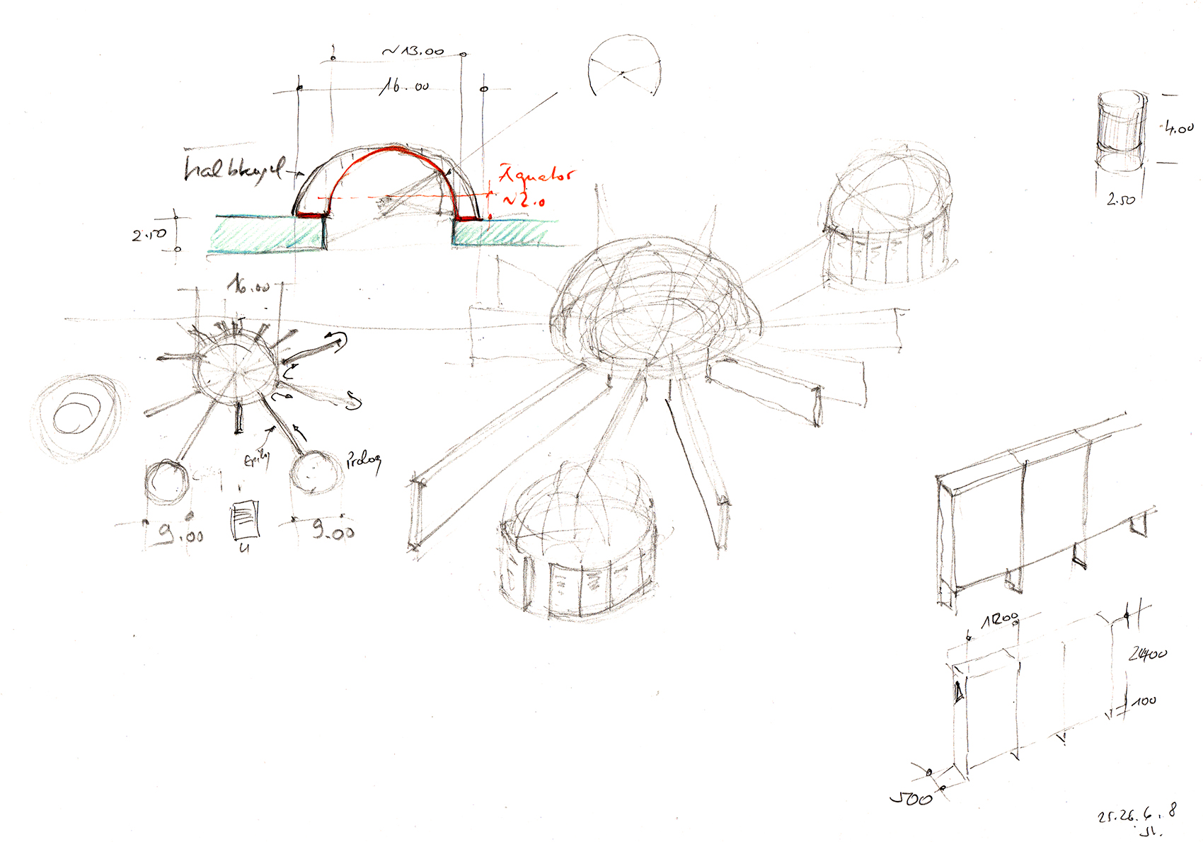 Das tragende Netz der Kuppel misst 16,00 m im Durchmesser und ragt mit seiner Oberkante 10,50 m über den Platzboden. Die innere Projektionskalotte hat einen Durchmesser von 12,00 m bei einer Höhe von 7,50 m. Die kleineren Zylinder haben einen Durchmesser von 9,00 m. Die eine zeigt auf den Außenwänden den Prolog und markiert somit den Anfang der Ausstellung.
