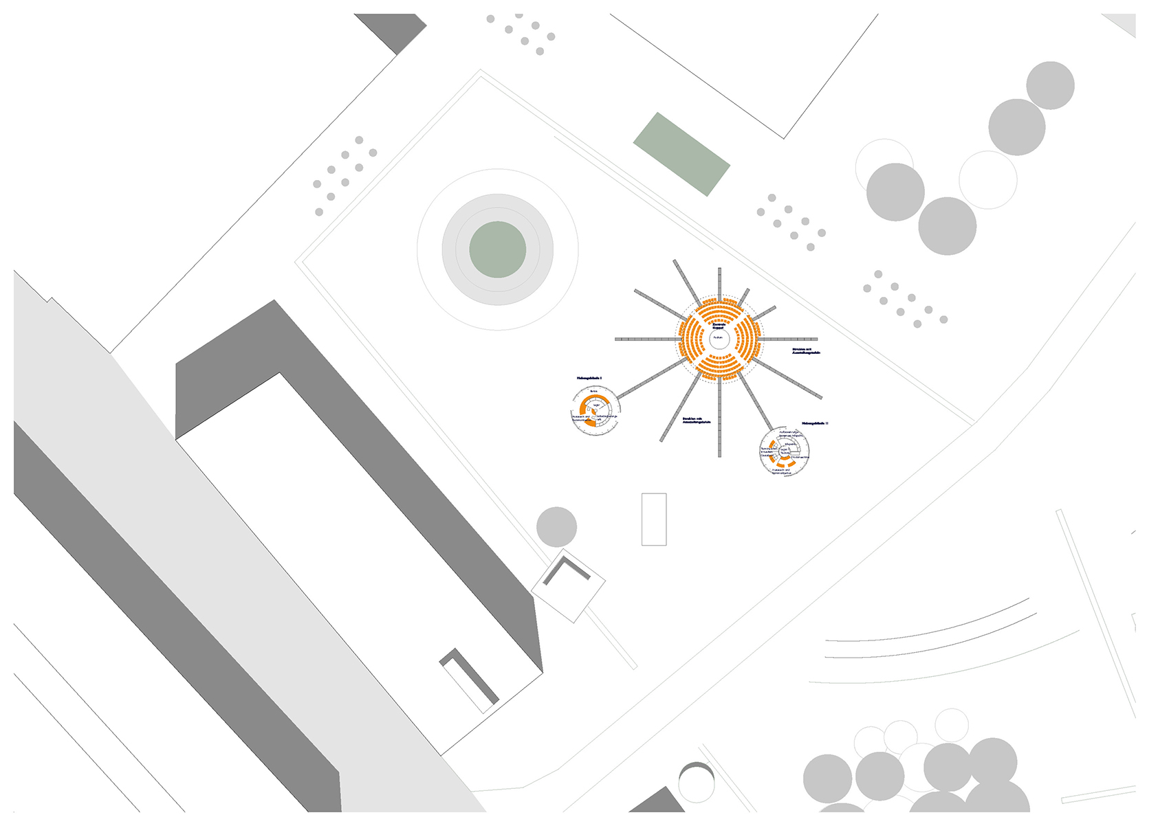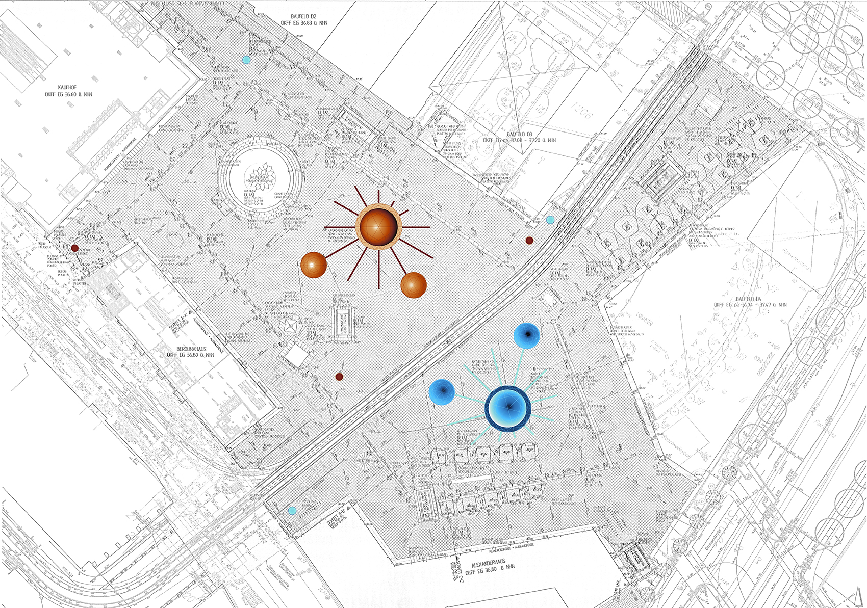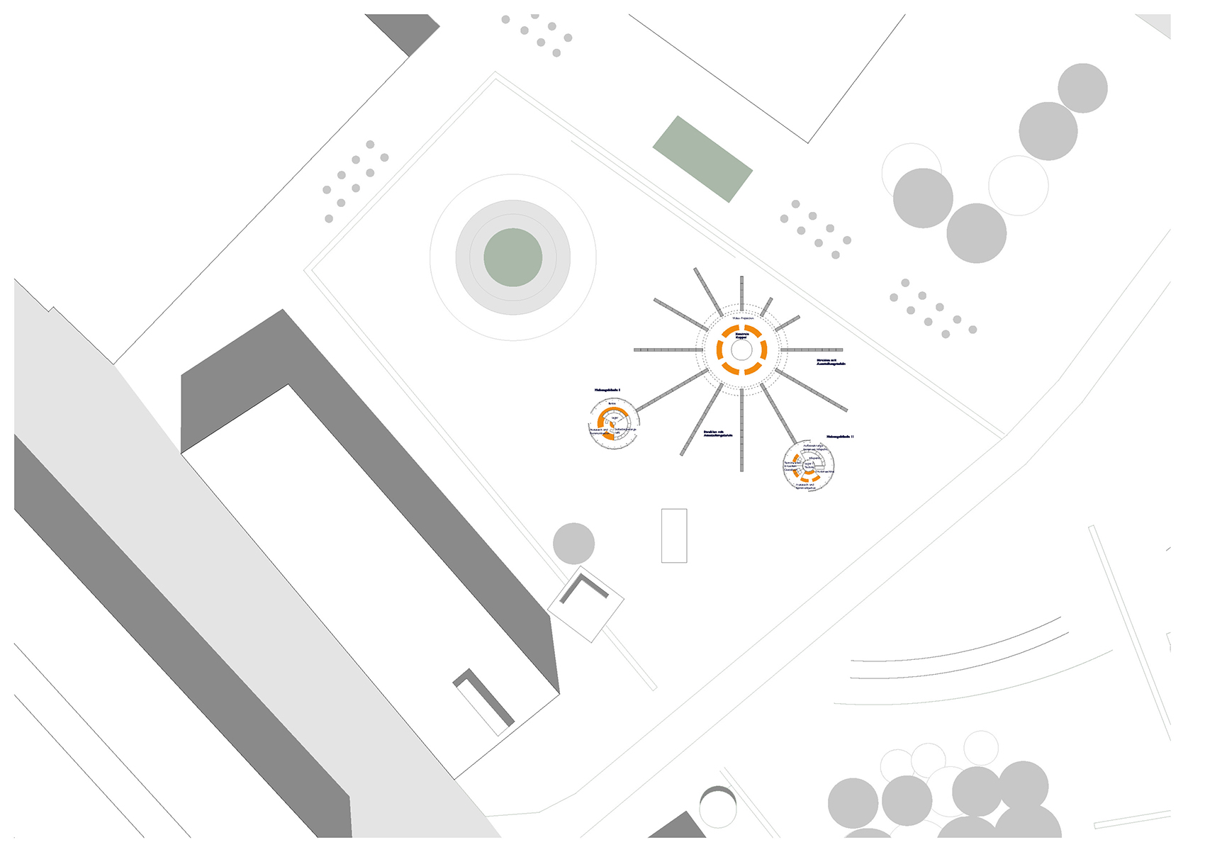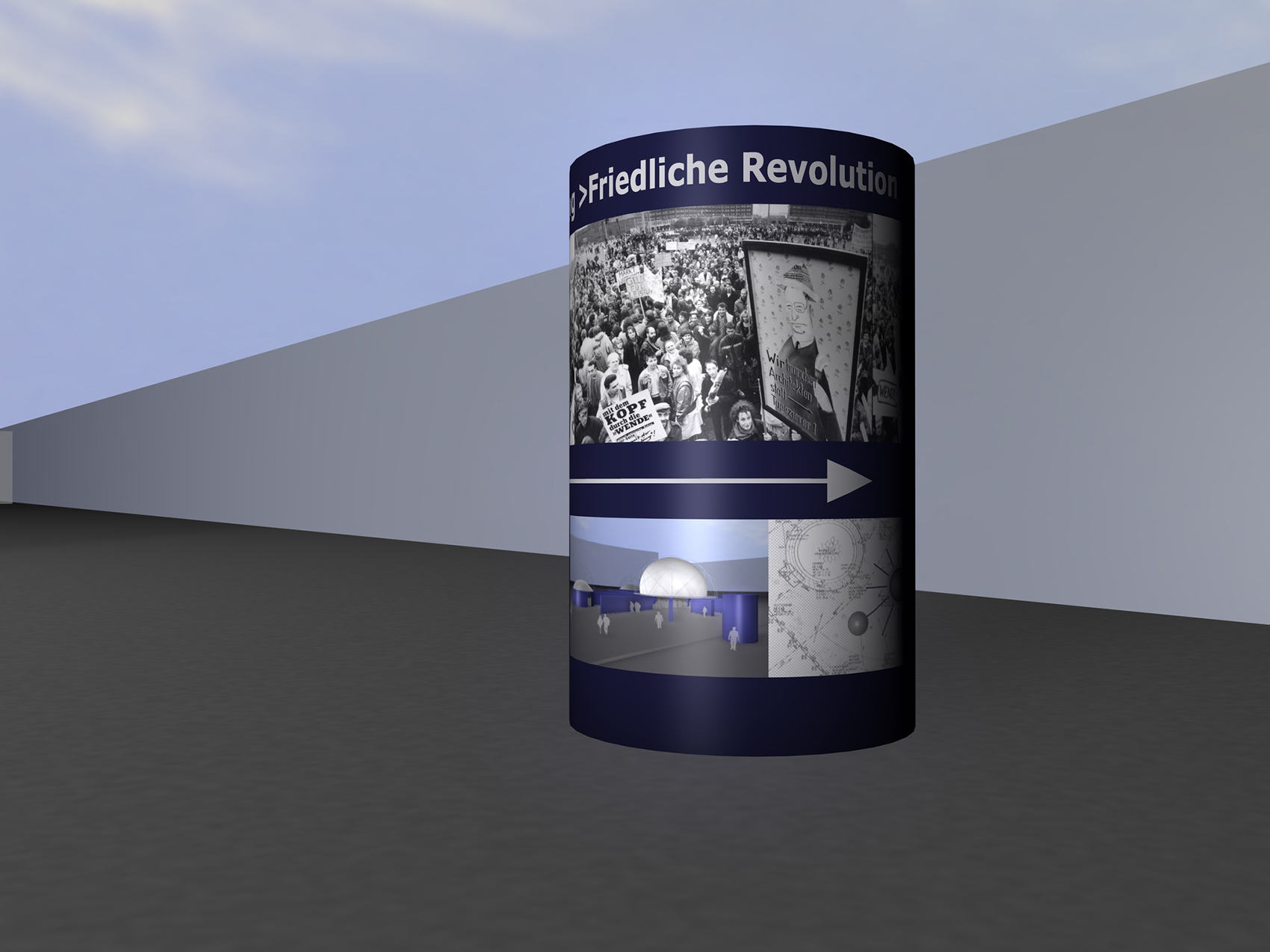 Vorliegender Entwurf ist so auf den Alexanderplatz angepasst, dass dieser einen neuen Charakter erhält. Die Strahlen der Ausstellungswände, sowie die zentrale Kuppel und die beiden kleineren zylinderförmigen Nebengebäude der Ausstellung prägen den Alexanderplatz visuell und zitieren sichtbare und vergangene Leitbilder; sie ergänzen so die vorhandenen Architektur und Möblierung des ausgedehnten Platzes. Durch die Anordnung der Strahlen ist die Wegeführung auf dem Platz nicht eingeschränkt, vielmehr führen einige Wege direkt durch die Ausstellung, die sich dadurch unaufdringlich in die Publikumswege einpasst, ohne diese zu behindern, so dass auch Passanten mit in die Ausstellung hineingezogen werden und bei Interesse länger verweilen können. Die einzelnen Strahlen sind unterschiedlich lang, je nach inhaltlichen Erfordernissen und stadträumlichen Gegebenheiten.