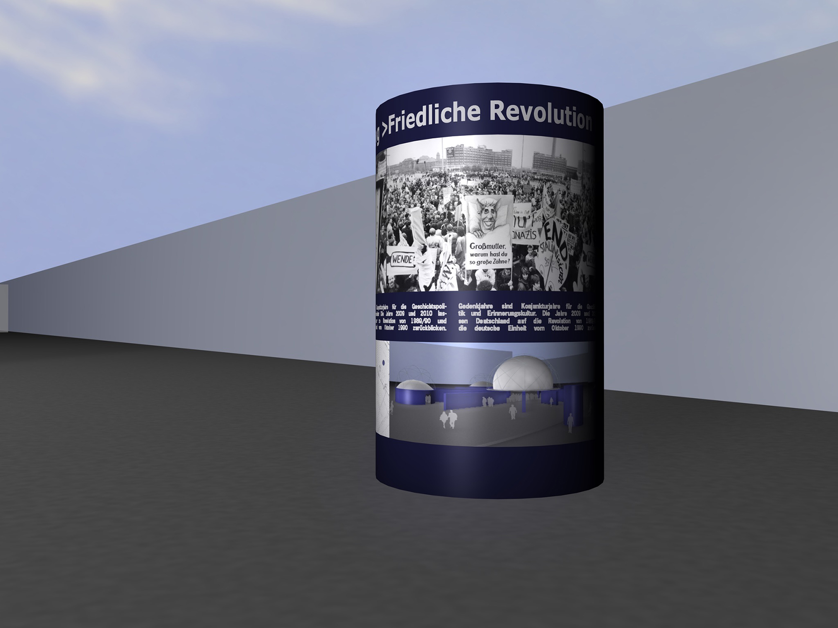 2009 stand Berlin im Zeichen des 20. Jahrestages des Mauerfalls und hatte diesen im Rahmen eines Themenjahres würdevoll zu begehen. Die Umsetzung des Gesamtprojekts des Berliner Themenjahrs 2009 ›20 Jahre Mauerfall – 20 Jahre Berlin im Wandel‹ hat die gemeinnützige landeseigene Kulturprojekte Berlin GmbH übernommen. Ein Höhepunkt und zentrale Veranstaltung des Themenjahres war die Open-Air-Ausstellung ›Friedliche Revolution 89/90‹ der Robert-Havemann-Gesellschaft. Als eindrucksvolle Inszenierung soll die Ausstellung auf dem Alexanderplatz zum Fokus und zentralen Anlaufpunkt des gesamten Themenjahres werden. Siehe auch den von uns gewonnenen Wettbewerb von 2007.