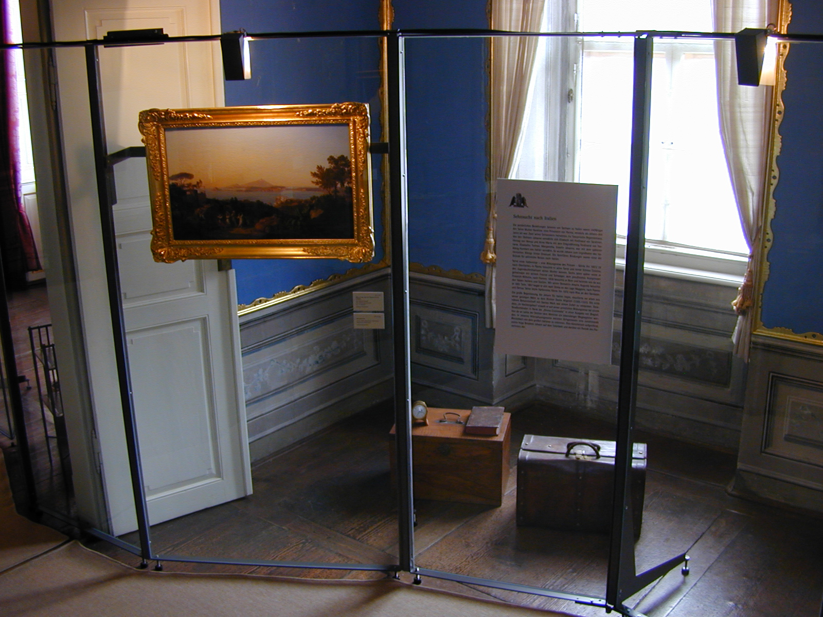 Zwei Ausstellungsprinzipien galt es für diese Ausstellung zusammenzufügen: Im Unterschloss wurden durch gläserne Stellwände mit integrierter Beleuchtung die Privaträume mit der Darstellung Leben und Wirken Johanns gleichsam in von innen begehbare Vitrinen verwandelt.