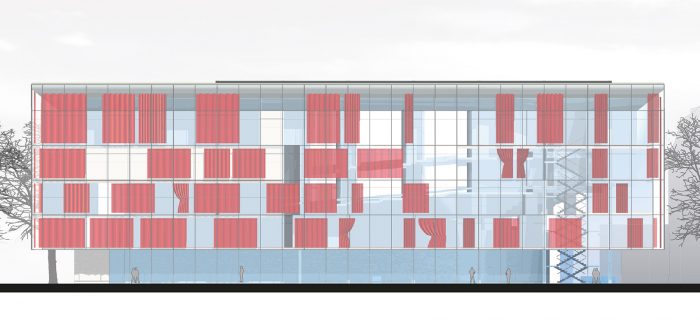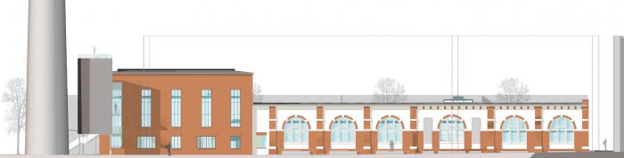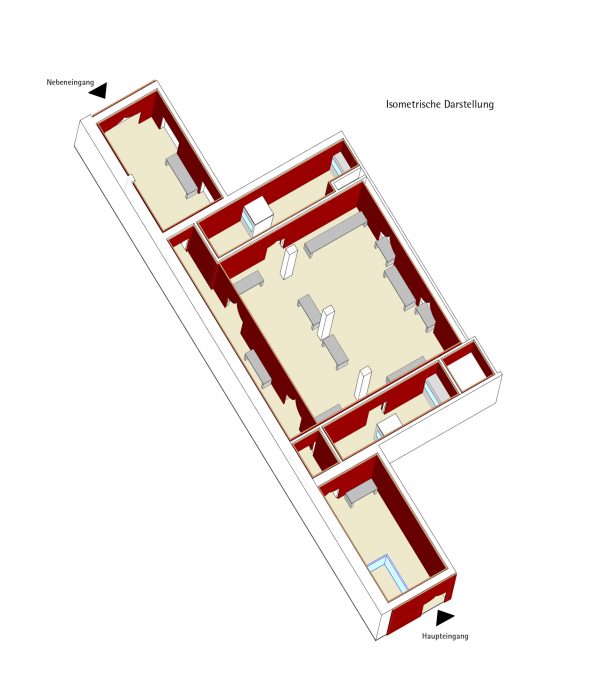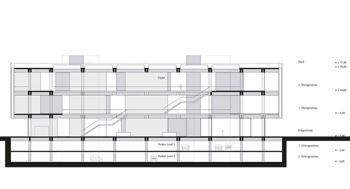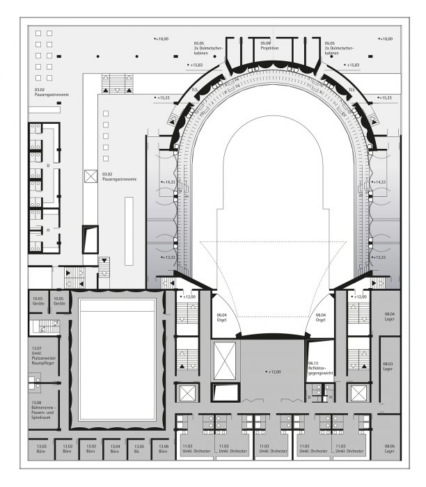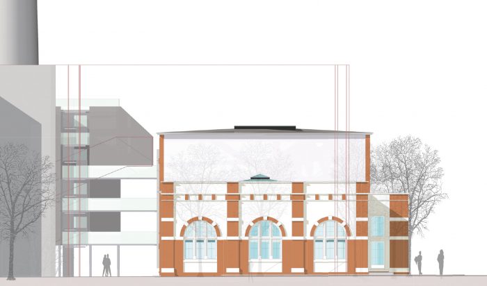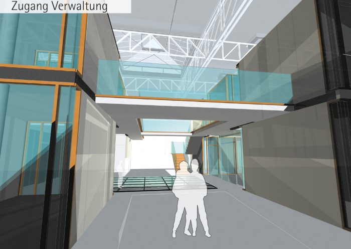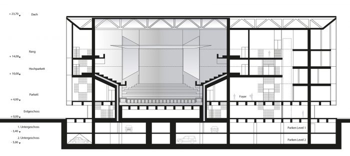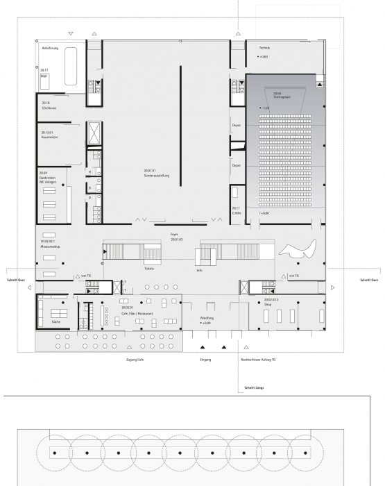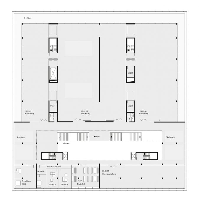 Damit ein neuer Platz entstehen kann, verlangen die beiden den Platzraum einfassenden Fassaden eine vergleichsweise hohe und möglichst breite Ausführung. Auf Grund des Raumprogramms empfiehlt sich die Konzeption von zwei annähernd quadratischen Baukörpern. Eine Annäherung an klassische Platzgestaltung legt eine ausgeprägte Sockelzone nahe, deren zeitgenössische Antwort wegen der Mehrfachnutzung und engen Beziehung der drei nun neu entstehenden Plätze, als Form einer Einschnürung der Baukörper auf Platzniveau lautet. So erhöht sich die nutzbare Fläche und es entsteht gleichzeitig ein Forum, also wörtlich ein Marktplatz. Die Überstände von 5.00 m rundherum bieten Schutz vor Wetter und vereinfachen so die Wege zwischen den Plätzen. Während des Send werden die Überstände Ort für kleinere Schaustellungen. Die Ausführung mit stützen- und vorsprunglosem Überstand soll die Verschmutzung und den unerwünschten Daueraufenthalt behindern. In den Zeiten zwischen dem Send dienen die verglasten Sockelzonen als Werbeträger durch Rückprojektionen oder ermöglichen den Einblick in dahinter liegende Funktionen. Das Anheben des Hauptgeschosses um 4,00 m versinnbildlicht nur nebenbei den Niveauunterschied zwischen Hochkultur und Jahrmarkt; hauptsächlich ermöglicht er eine sinnvolle Trennung und bietet dem Publikum in der Musikhalle und dem Museum einen reizvollen Überblick auf die 4,00 m niedriger liegende Platzgeschehen.