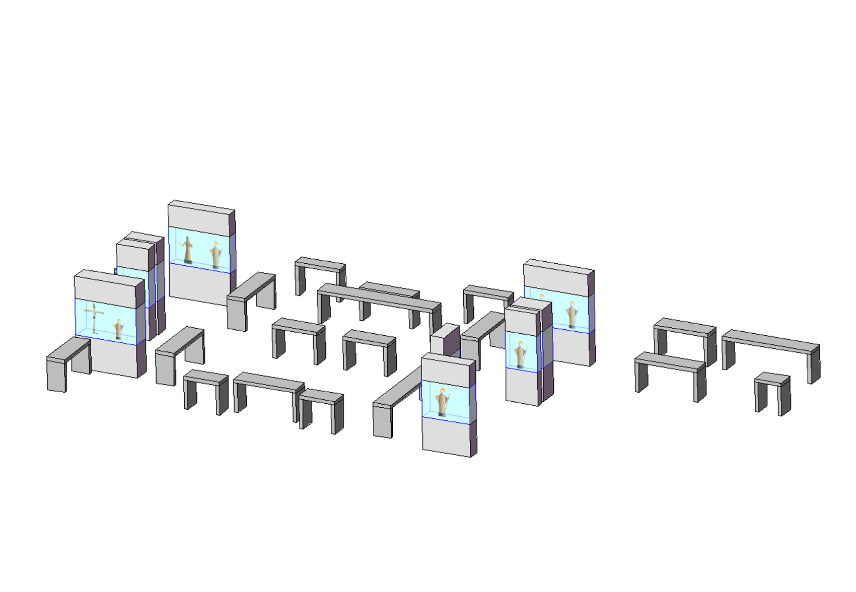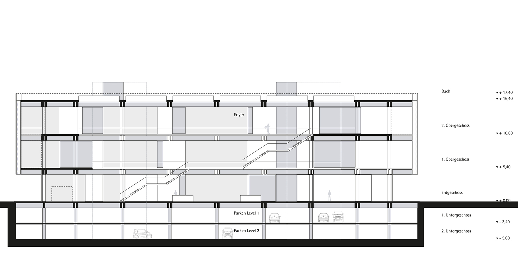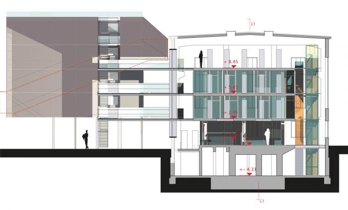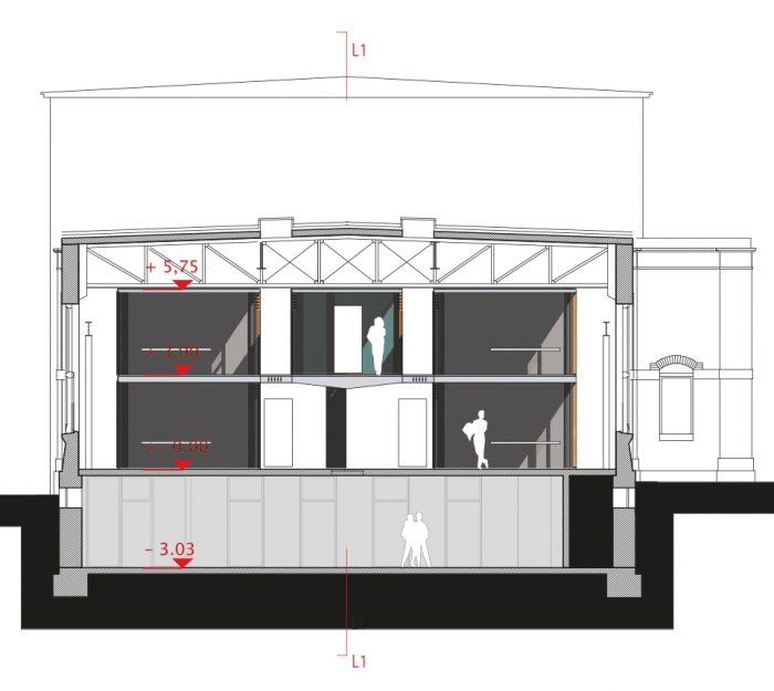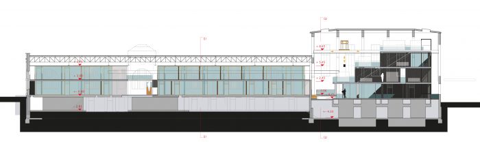 Damit ein neuer Platz entstehen kann, verlangen die beiden den Platzraum einfassenden Fassaden eine vergleichsweise hohe und möglichst breite Ausführung. Auf Grund des Raumprogramms empfiehlt sich die Konzeption von zwei annähernd quadratischen Baukörpern. Eine Annäherung an klassische Platzgestaltung legt eine ausgeprägte Sockelzone nahe, deren zeitgenössische Antwort wegen der Mehrfachnutzung und engen Beziehung der drei nun neu entstehenden Plätze, als Form einer Einschnürung der Baukörper auf Platzniveau lautet. So erhöht sich die nutzbare Fläche und es entsteht gleichzeitig ein Forum, also wörtlich ein Marktplatz. Die Überstände von 5.00 m rundherum bieten Schutz vor Wetter und vereinfachen so die Wege zwischen den Plätzen. Während des Send werden die Überstände Ort für kleinere Schaustellungen. Die Ausführung mit stützen- und vorsprunglosem Überstand soll die Verschmutzung und den unerwünschten Daueraufenthalt behindern. In den Zeiten zwischen dem Send dienen die verglasten Sockelzonen als Werbeträger durch Rückprojektionen oder ermöglichen den Einblick in dahinter liegende Funktionen. Das Anheben des Hauptgeschosses um 4,00 m versinnbildlicht nur nebenbei den Niveauunterschied zwischen Hochkultur und Jahrmarkt; hauptsächlich ermöglicht er eine sinnvolle Trennung und bietet dem Publikum in der Musikhalle und dem Museum einen reizvollen Überblick auf die 4,00 m niedriger liegende Platzgeschehen.