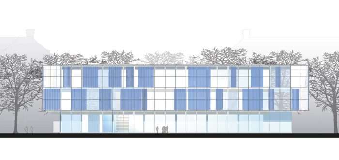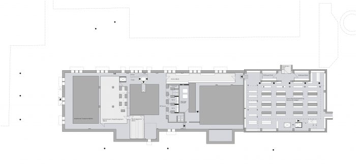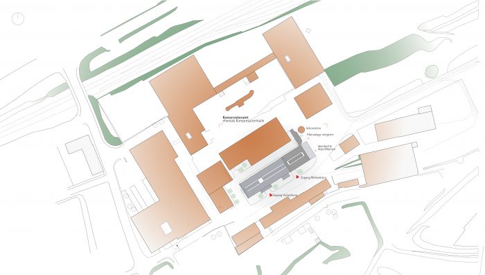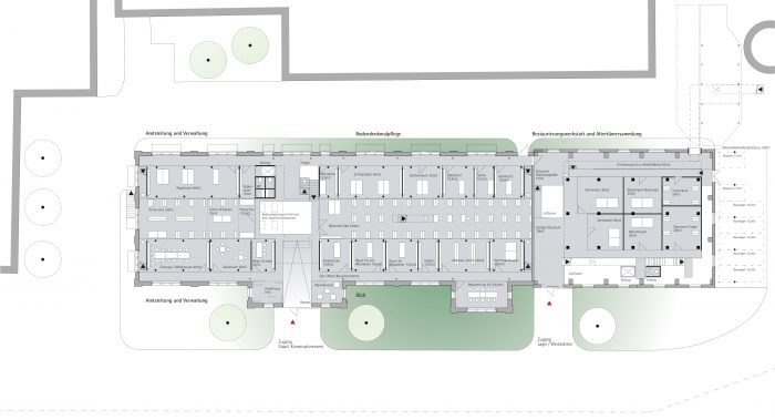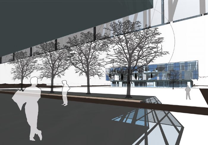 Der Neuplatz sollte mit Pflastersteinen belegt werden, durchaus als Anlehnung an den Cour d’Honneur (ganz nebenbei wäre dann die Nutzung als Skater-Bahn eingeschränkt). Der Entwurf beabsichtigt je eine Baumreihe vor den Hauptfassaden auf dem Neuplatz zu pflanzen um die Weichheit der Kanten im Freiraum dem inneren Fluss anzugleichen. Das wegen der Mehrfachnutzung sinnfällige Maß an bedingter Versiegelung wird durch die weitere Anordnung von Baumreihen in nord-südlicher Richtung hinter den beiden neuen Gebäuden kompensiert und die Plätze dadurch stadträumlich aufgewertet.