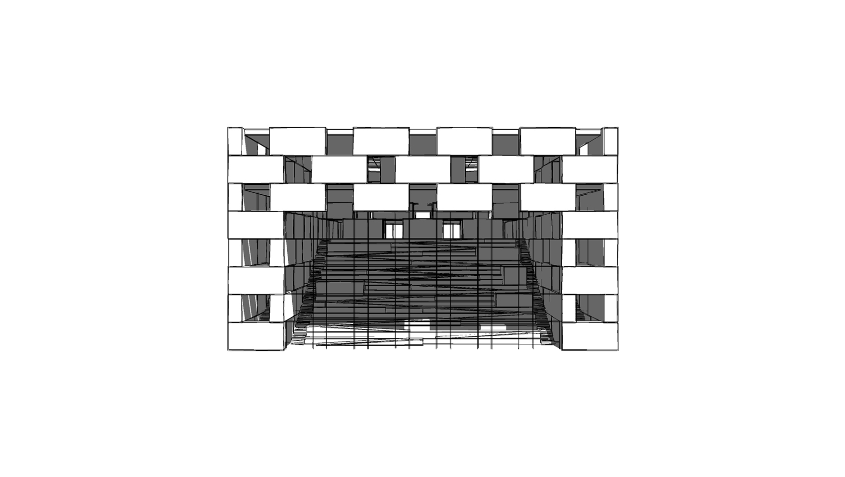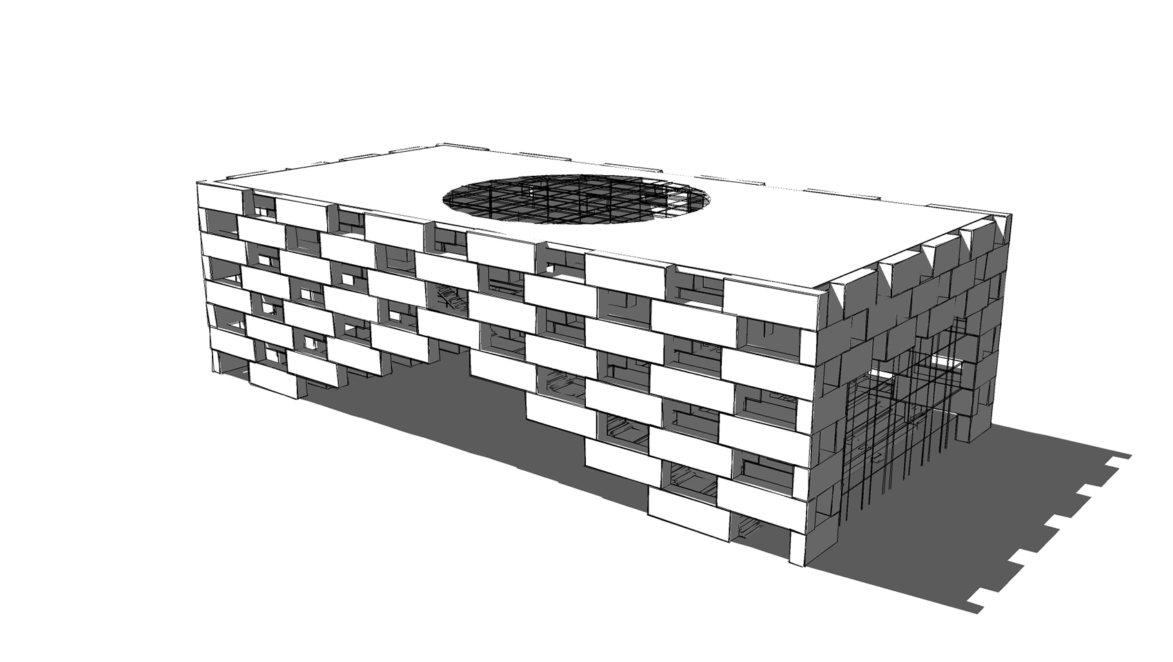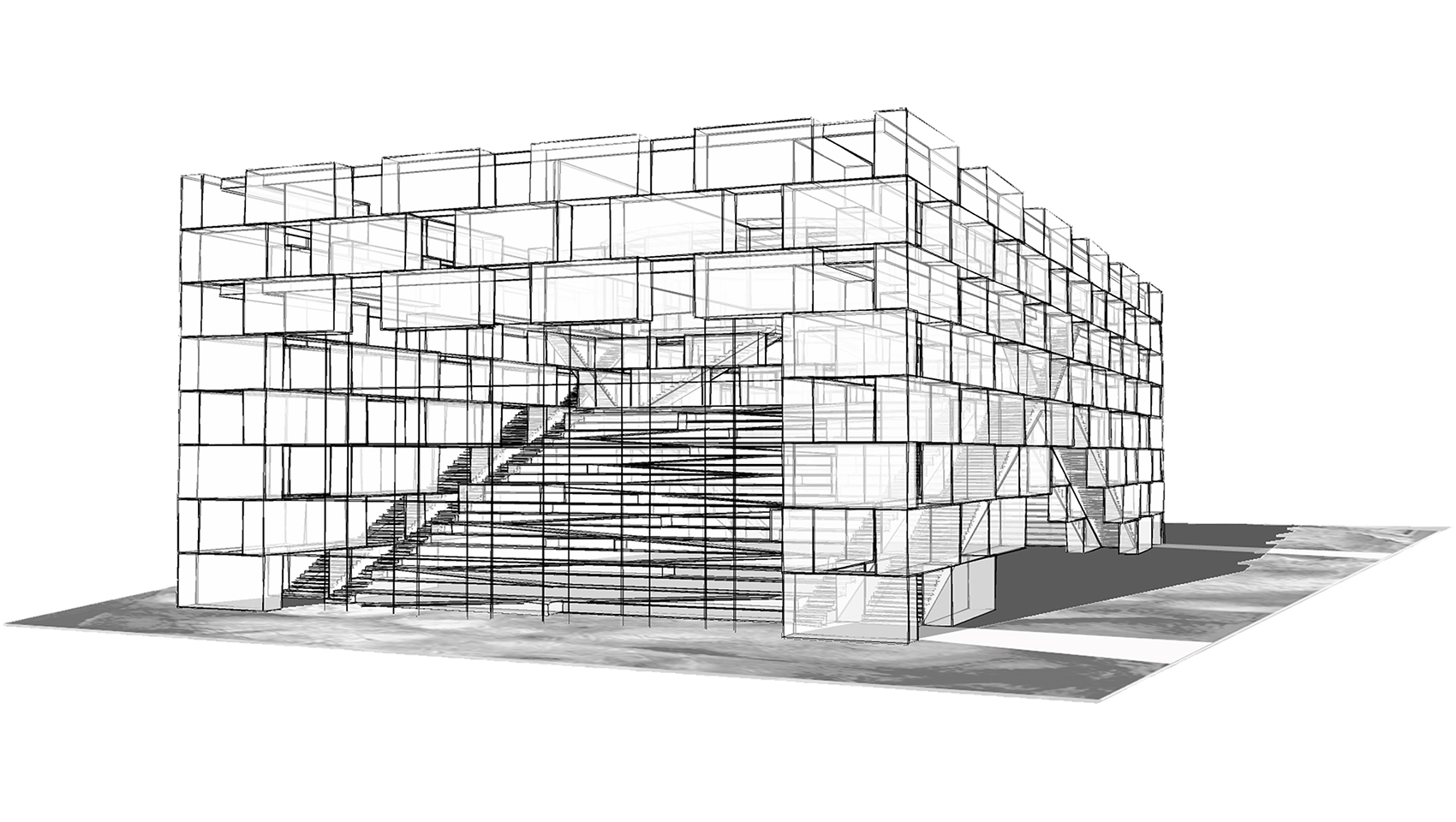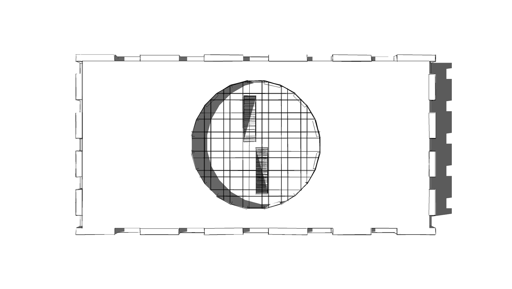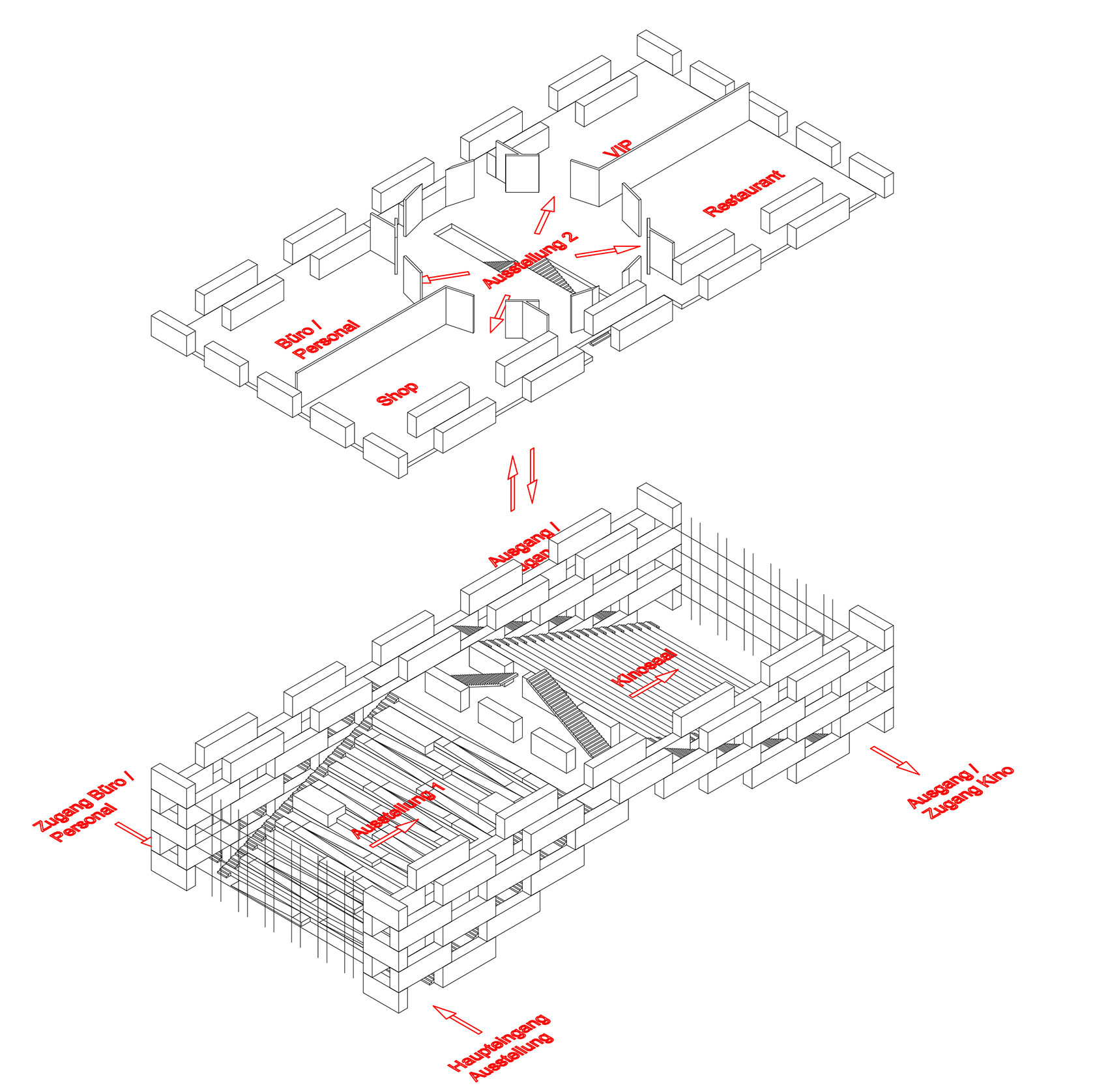 Das Publikum betritt das Gebäude durch den Einschnitt in der Freitreppe und gelangt in ein kreisförmiges Foyer, an welchem sämtliche dienenden Funktionen direkt andocken. Die Bildungseinrichtungen liegen im hinteren Teil und können bei Bedarf durch einen aufgeständerten Anbau ergänzt werden; der zur Erschließung notwendige Flur ist im Obergeschoss bereits vorgesehen.