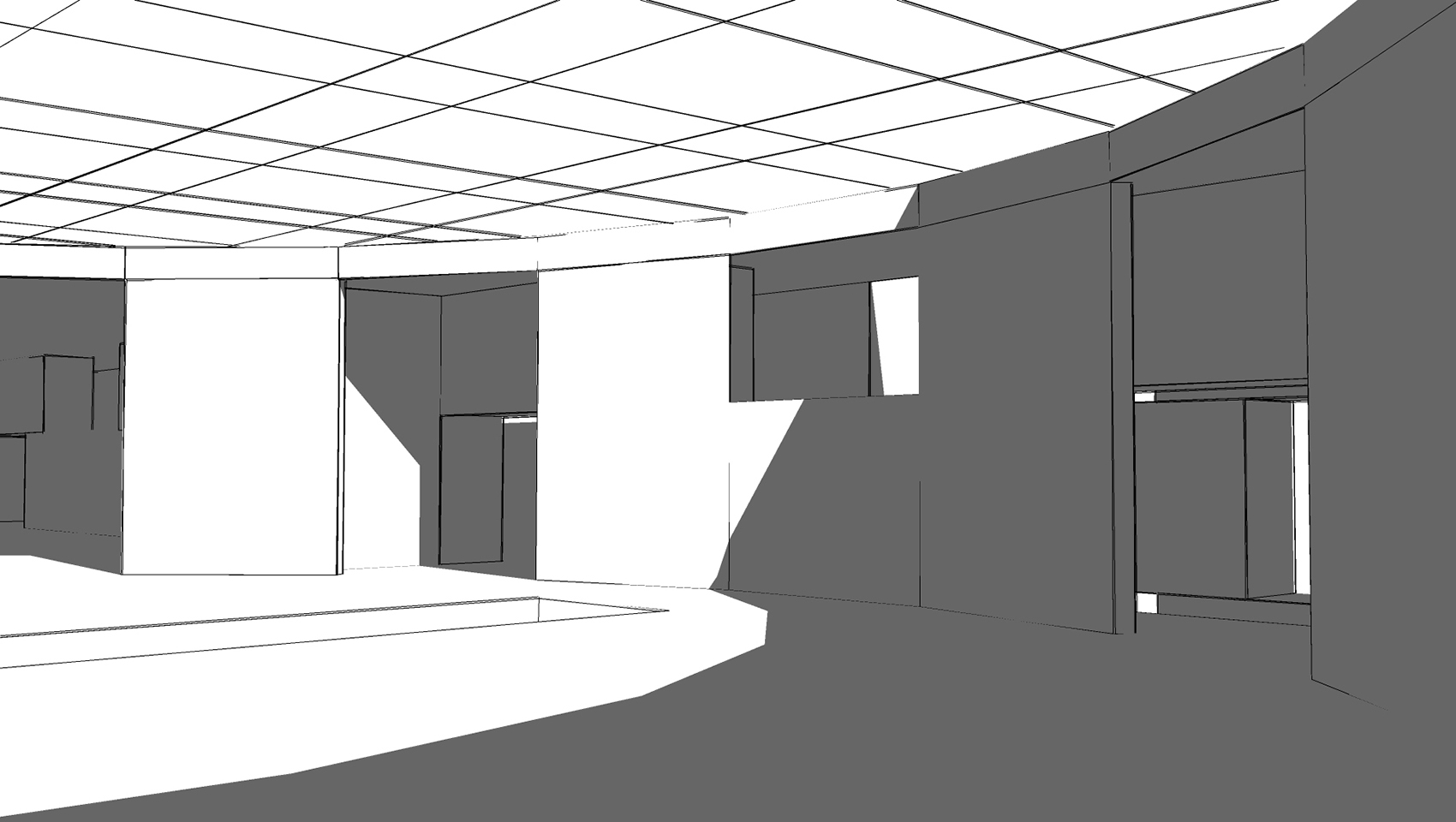 Der anthrazitfarbene Linoleumboden korrespondiert mit dem dunklen Schotter der Freiflächen. Die Innenwände bestehen aus Gipskartonplatten und sind vollflächig gespachtelt. Die Ausführung als Holzständerkonstruktion in einem Raster von 0,90 m mit zwischen den Ständern liegender Wärmedämmung macht eine geringe Wandstärke von 0,225 m bei bestem Vollwärmeschutz möglich und erlaubt eine zügige Errichtung des Bauwerks.