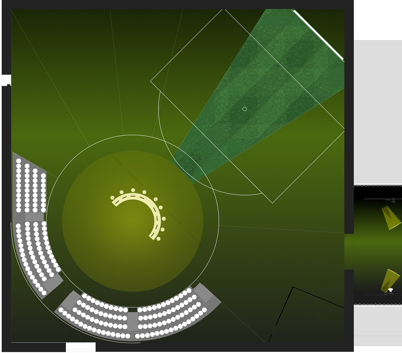 Für die Firmenpräsentation im neu bezogenen Produktions- und Verwaltungsgebäude der traditionsreichen Uhrenmanufaktur Tutima in Glashütte galt es einen Vorschlag zu entwicken. Als zentraler Punkt innerhalb eines integrierten Konzeptes stößt ein als interaktive Fahrkunst entwickeltes Objekt mit Einzelvitrinen bis in den 10 Meter hohen Dachraum vor. Weiter wird das Publikum entlang der Wandflächen an einem selbstleuchtenden Zeitband im Uhrzeigersinn durch die Geschichte der Zeit und der Marke Tutima geführt. Am Ende dieses Zeitbandes gibt eine begehbare Glasscheibe den Blick in Teile der Produktionsstätte frei. Es kann hier eine interaktive Projektion aktiviert werden und die Vorgänge aus der Uhrenfertigung darstellt.