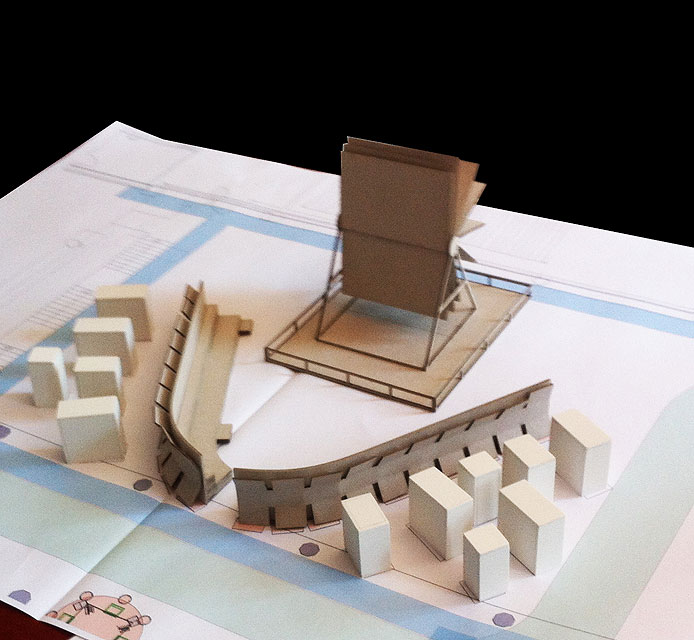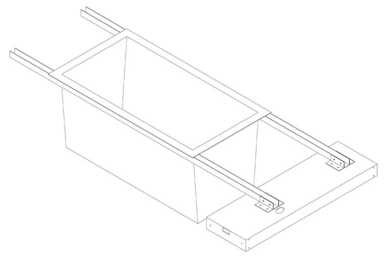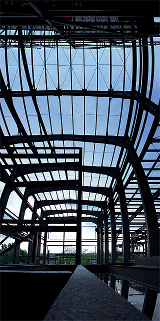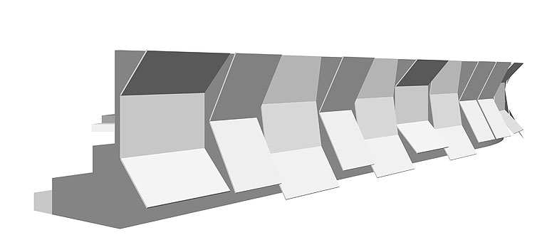 In Anlehnung an die Dachkonstruktion von vier Ausstellungsschiffen für die Ausstellung ›Wasser~Fälle. An Rhein und Maas‹ im Medienhafen Düsseldorf entwickelten wir eine Möbelserie aus gekantetem und genietetem Stahlblech.