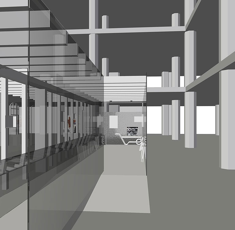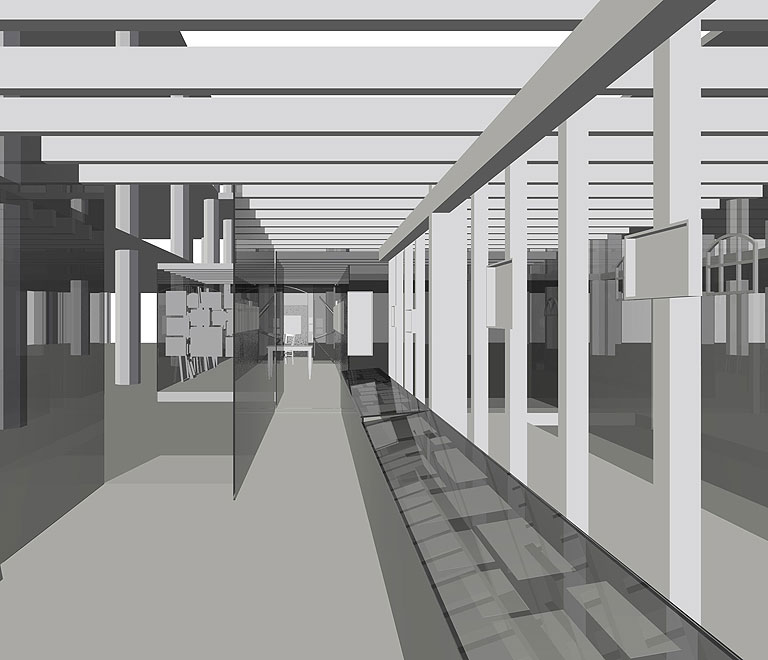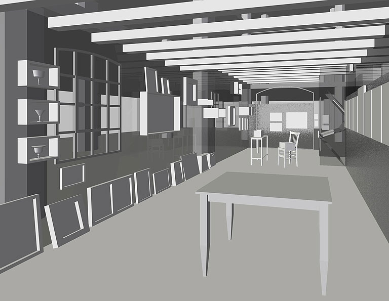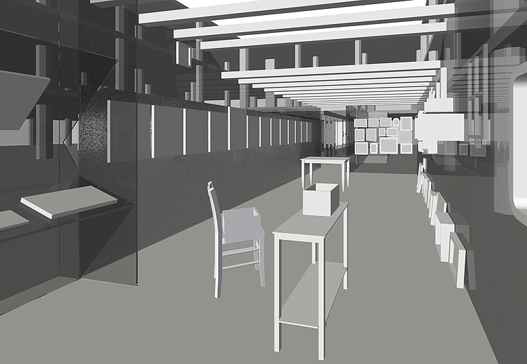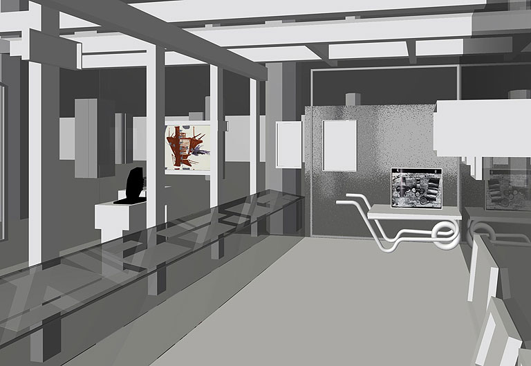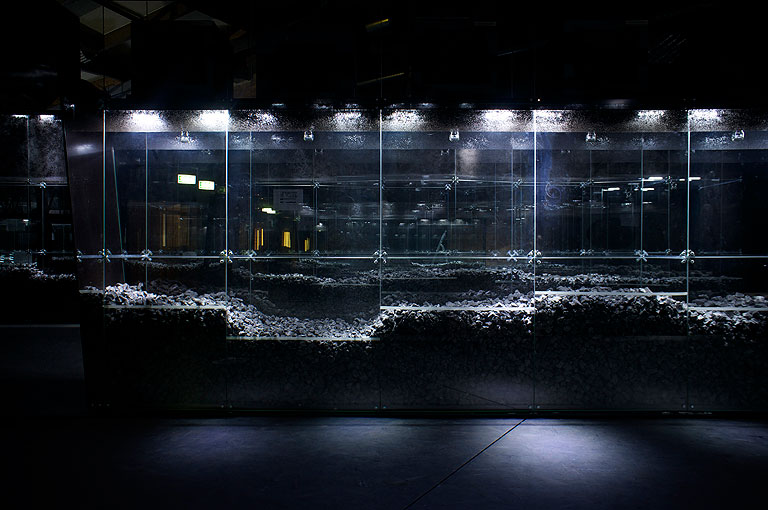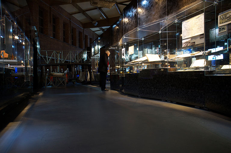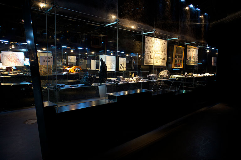 Wir fanden zu Beginn unser Planungen in der ehemaligen Waschkaue des Bergwerks Reden einen lieblos sanierten und prosaischen Ausstellungsraum vor. Daher entwickelten wir Glaswände, die zusätzlich zur Grundaufgabe des Ausstellens von Objekten die Ausstellungsatmosphäre maßgeblich prägen sollten.
