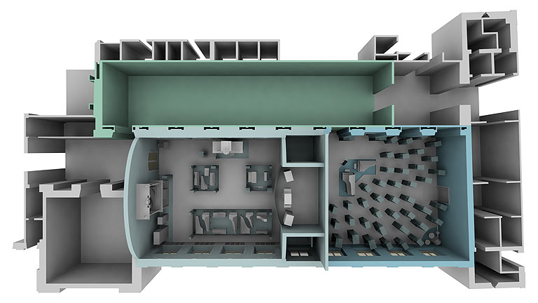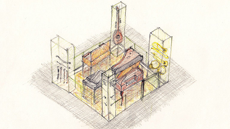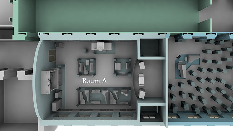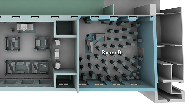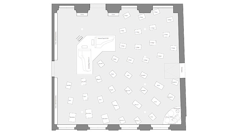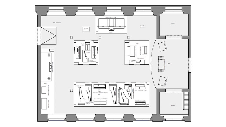 Die Grundzüge der Ausstellungsgestaltung sind in einem dualen Prinzip zu erkennen: An erster Stelle stehen die Exponate, die in den drei Ausstellungssälen gemäß unserem Prinzip ›Ausstellungs- gestaltung ist die Verschmelzung von Thema mit Objekten und Ort‹ integriert und verortet werden.