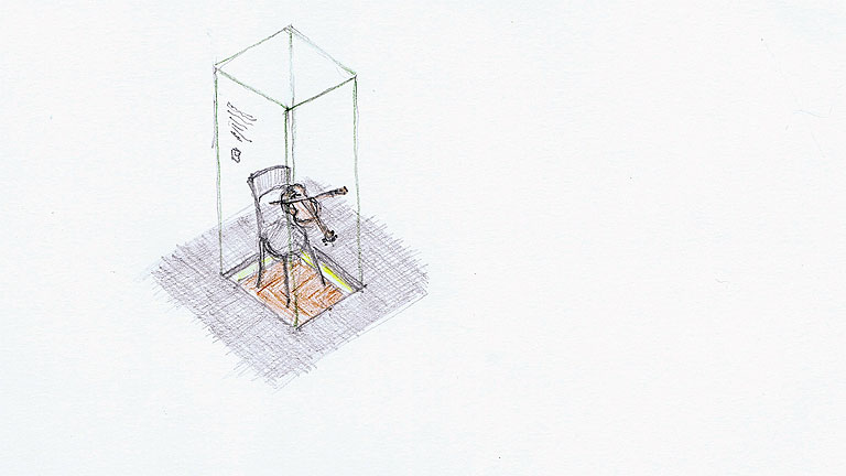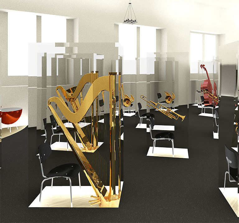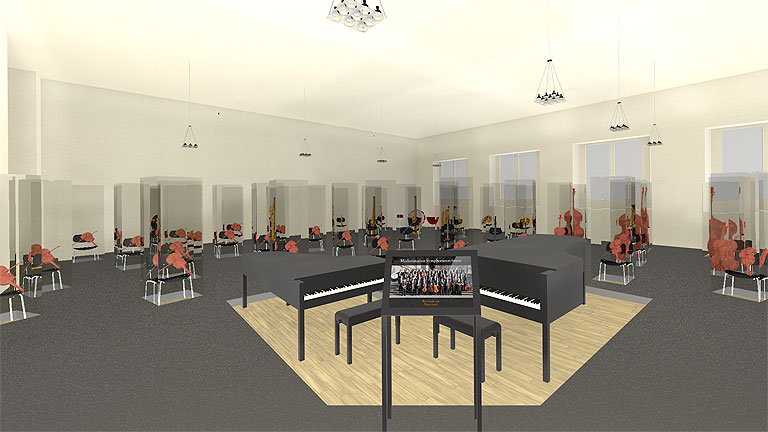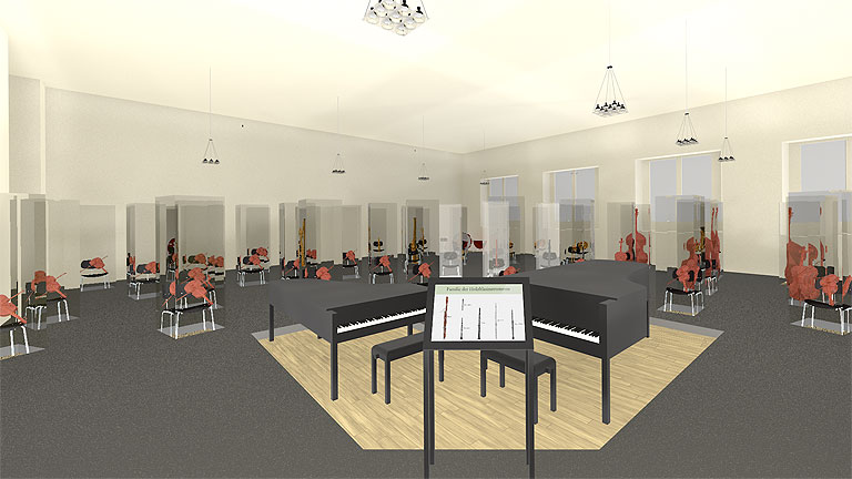 Die mit den Händen gehaltenen und mit Händen oder Mund gespielten Instrumente sollten wo möglich in Ihrer richtigen Lage im Bezug auf den abwesenden Musiker gezeigt werden. Hier verweisen wir auf das Konzept von Georges Henri Rivière (1897–1985) genannt ›le magicien des vitrines‹ (der Zauberer der Vitrinen). Er kreierte in Frankreich im Zusammenhang mit ethnologischen Sammlungen in der ersten Hälfte des 20. Jahrhunderts ›La muséographie du fil de Nylon‹ (Museologie des Nylonfadens) zur Erläuterung von musealisiertem Gebrauchszusammenhang ›Ce sont les objets qui ont la parole‹ (Den Objekten gehört die Ansprache): Dieses Konzept ist am deutlichsten im Raum B zu erkennen, in dem ein Symphonieorchester nachzuempfinden ist, indem Instrumente – wo nötig auch Hilfsmittel wie Geigenbogen oder Trommelstöcke – unterstützt durch textliche und mediale Erläuterungen zum Sprechen gebracht werden.