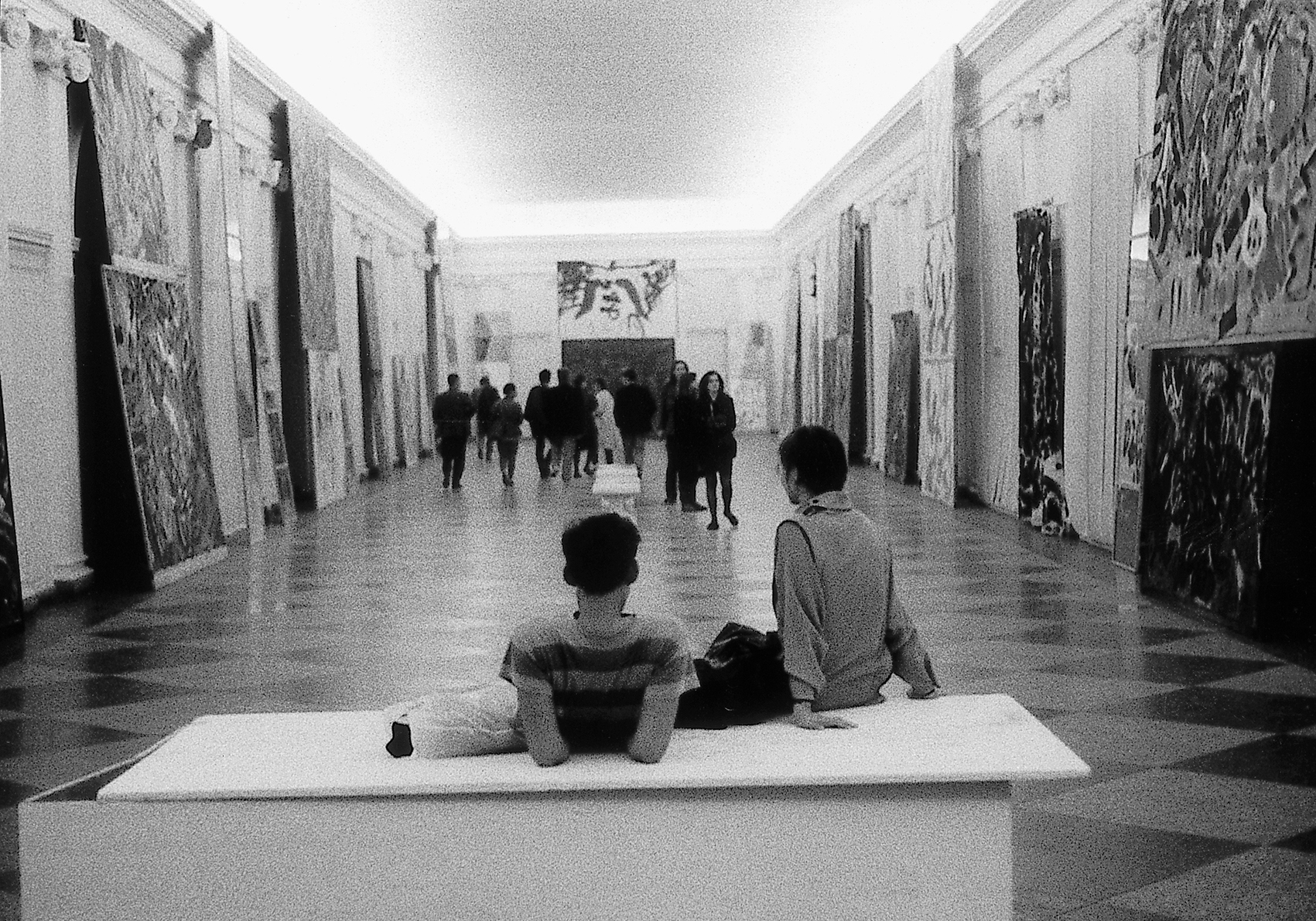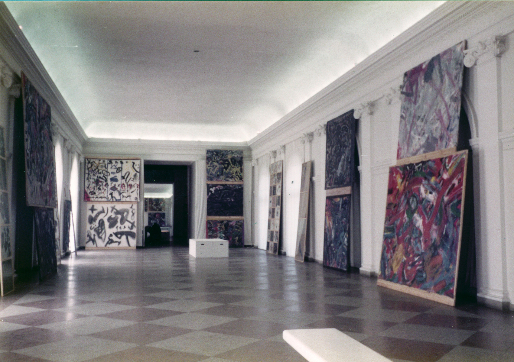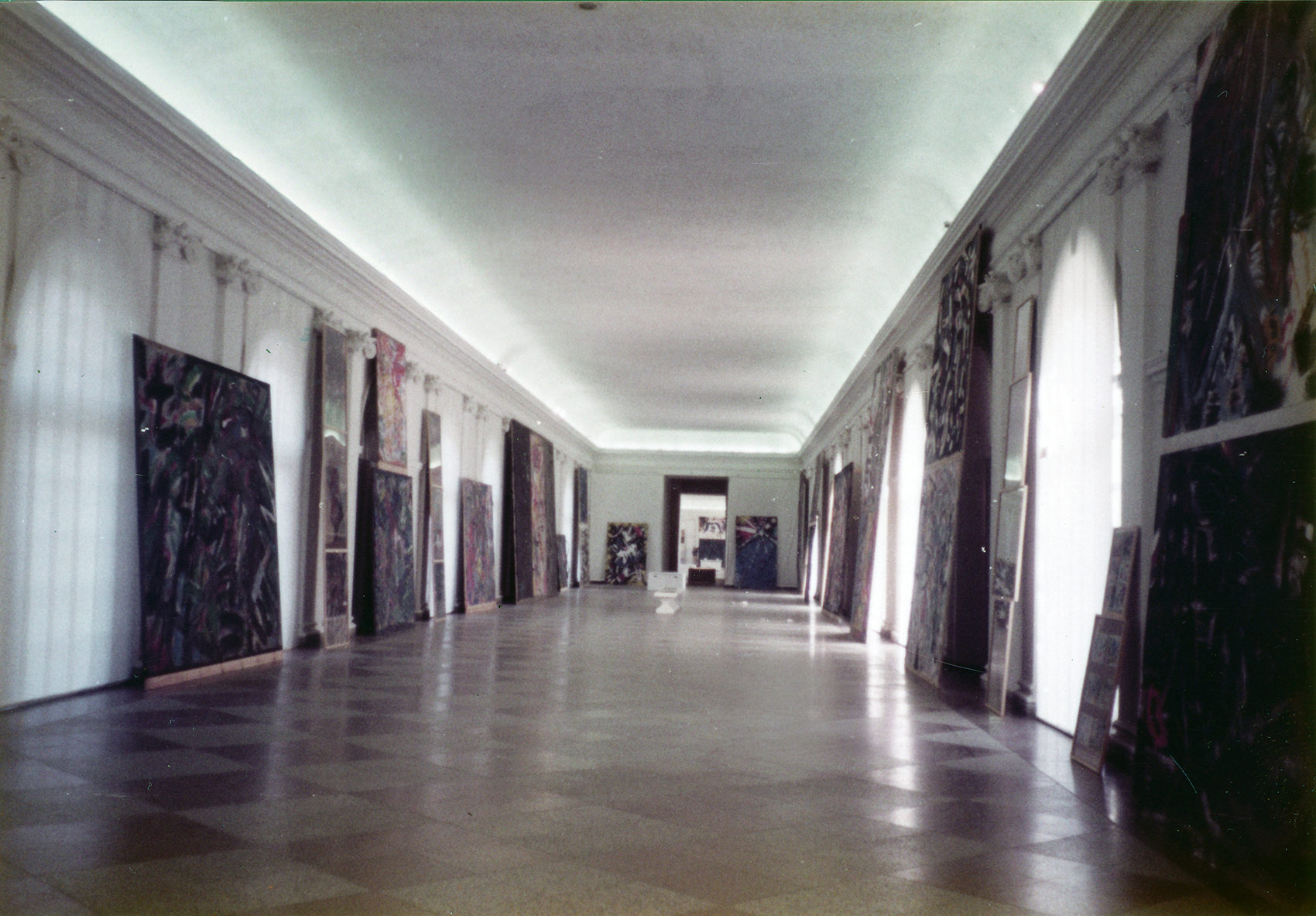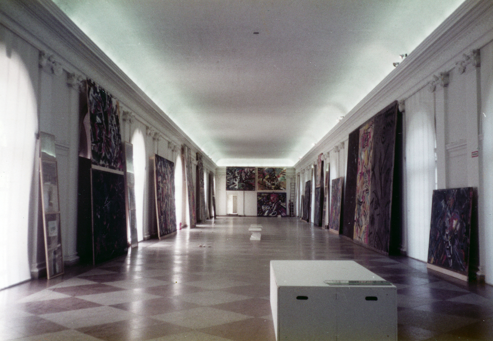Zwei Bilder wurden auf Latten übereinander fixiert und an das obere Stuckprofil der Wände gelehnt. Diese unkonventionelle Präsentation – die Fenster blieben frei und der Raum leer – war die kreative Antwort auf einen Raum, den nur wenige meistern. Die Ausstellungstechnik erregte Aufsehen und wurde von der Presse gelobt.
