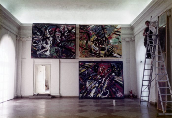 Zwei Bilder wurden auf Latten übereinander fixiert und an das obere Stuckprofil der Wände gelehnt. Diese unkonventionelle Präsentation – die Fenster blieben frei und der Raum leer – war die kreative Antwort auf einen Raum, den nur wenige meistern. Die Ausstellungstechnik erregte Aufsehen und wurde von der Presse gelobt.