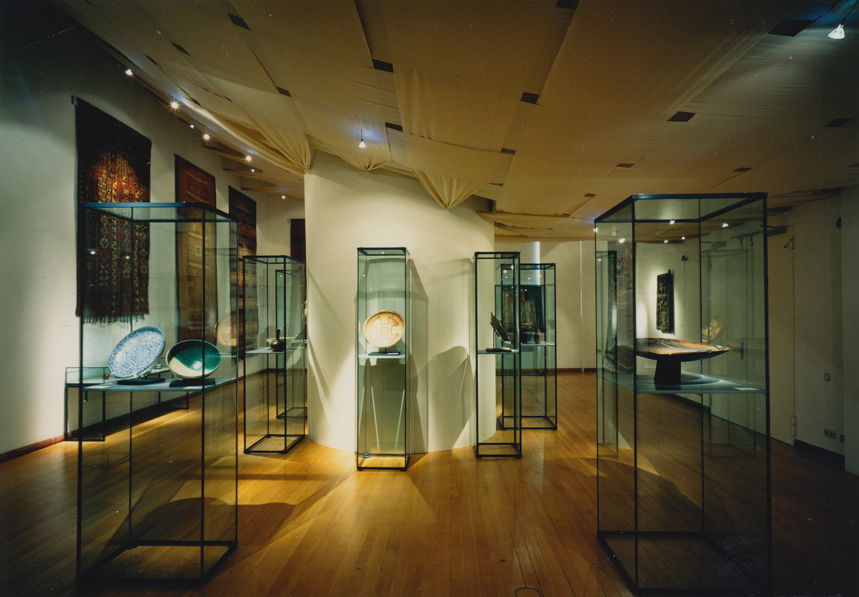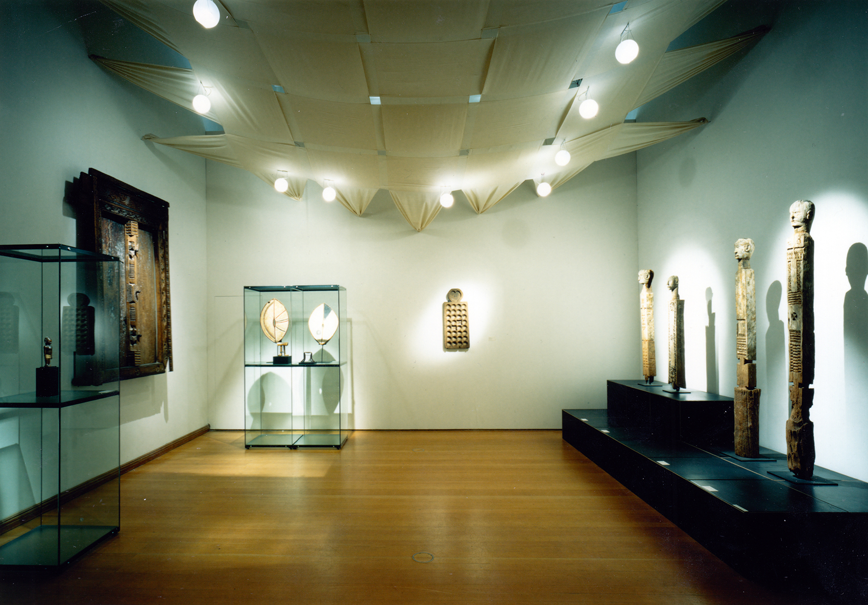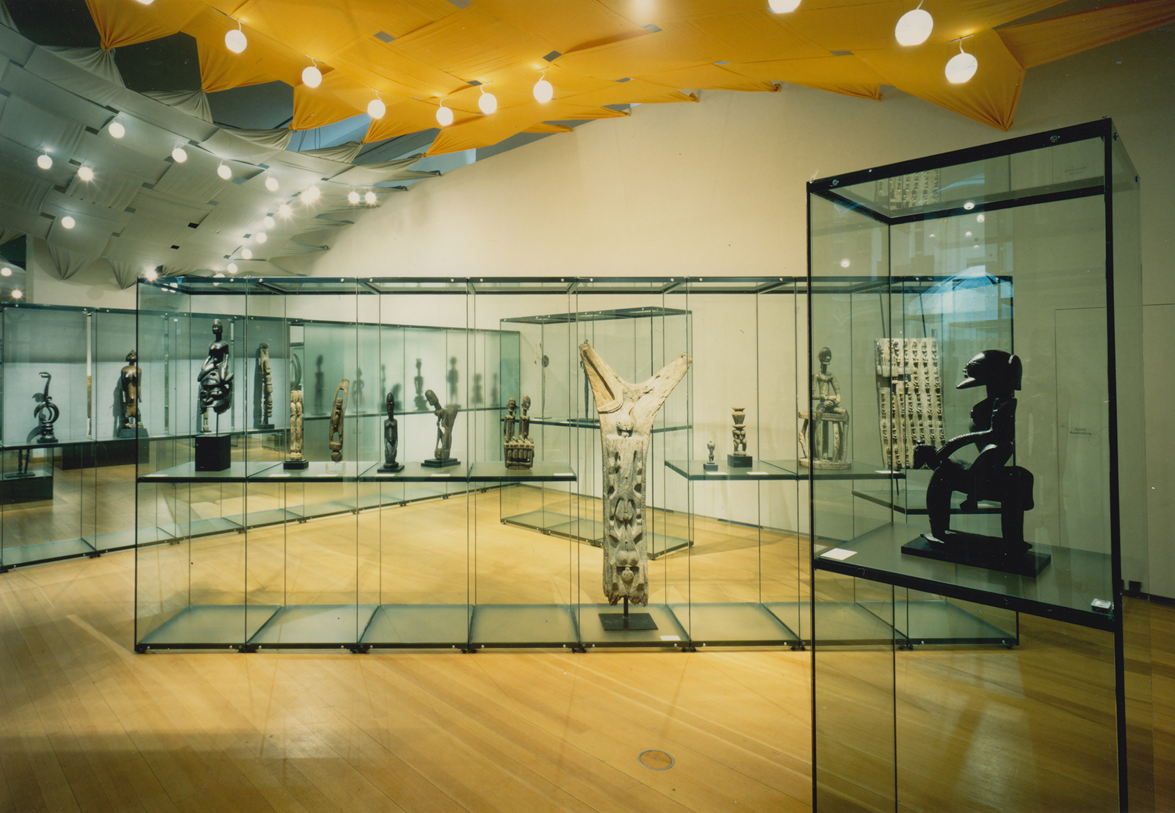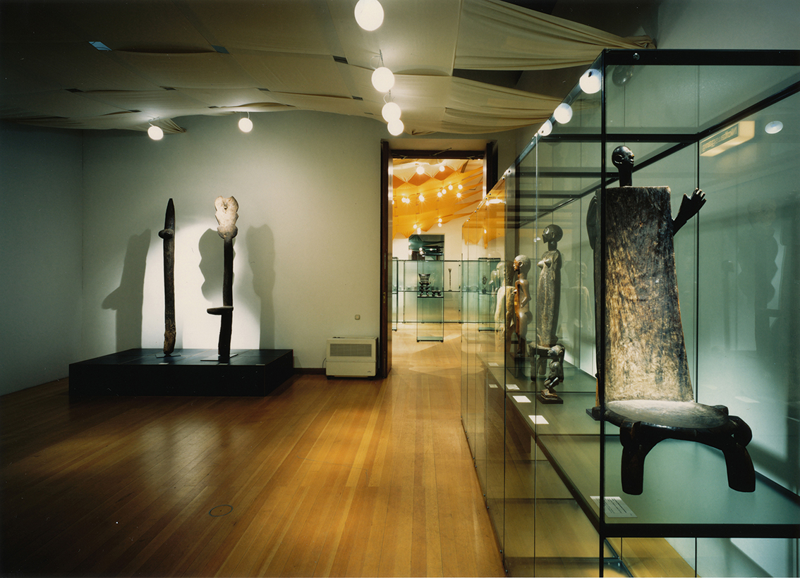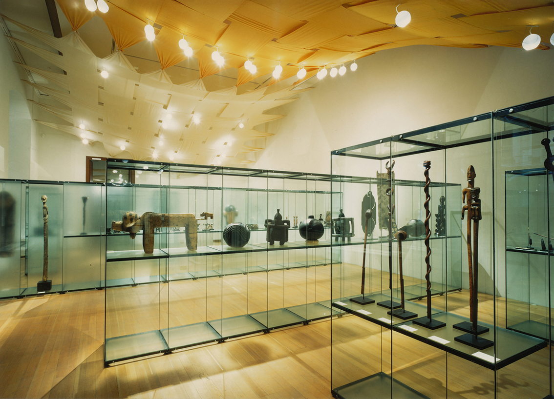 Die zum Teil historischen und zum Teil technischen Decken der Räume hätten die vornehmlich in Vitrinen präsentierten Objekte gleichsam allein gelassen, auch die Raumproportionen galt es anzupassen. Durch Vorbilder westafrikanischer Textilkunst entstand die Idee, eine Zwischendecke einzuweben, in die auch die Leuchtampeln an der jeweils richtigen Position eingehängt werden konnten.