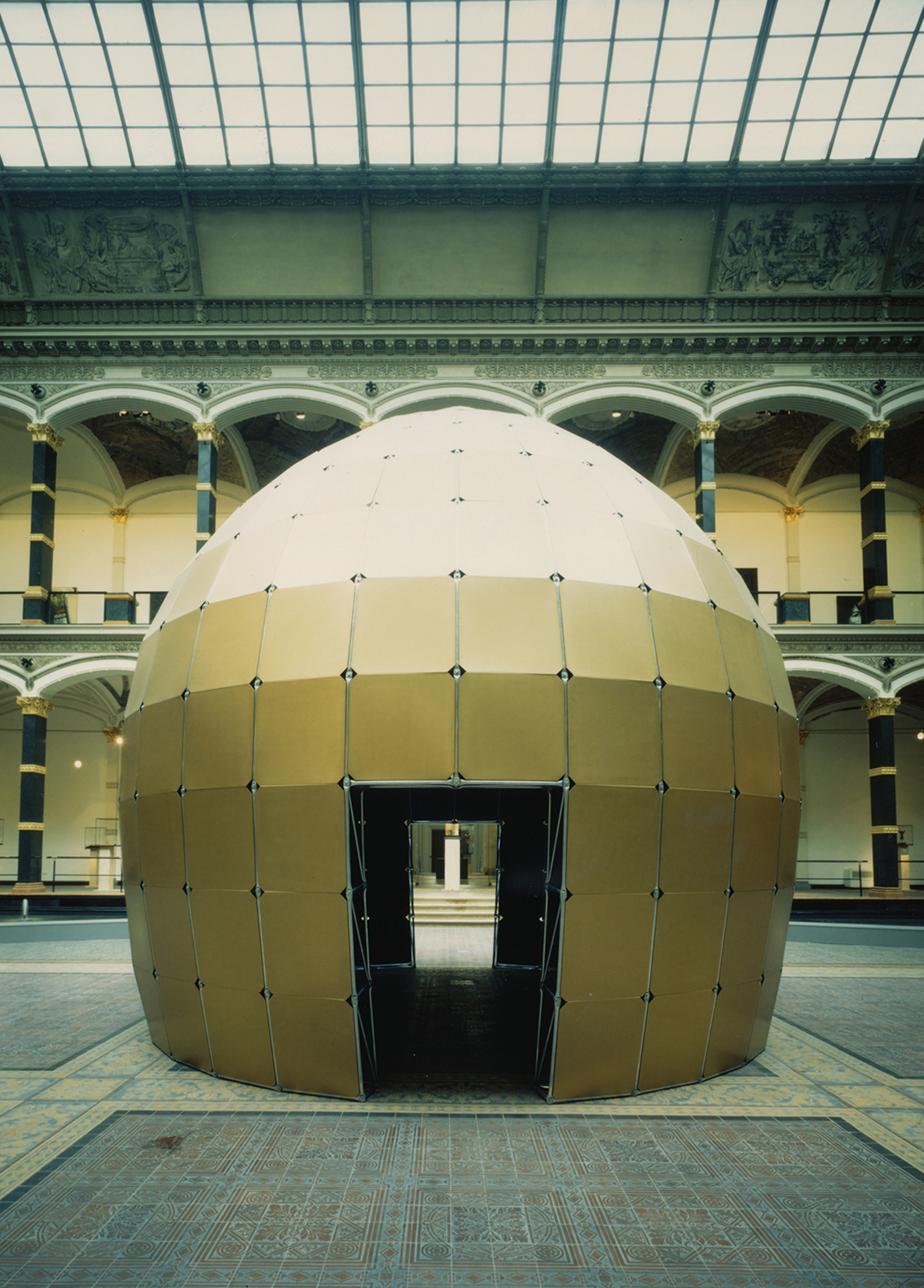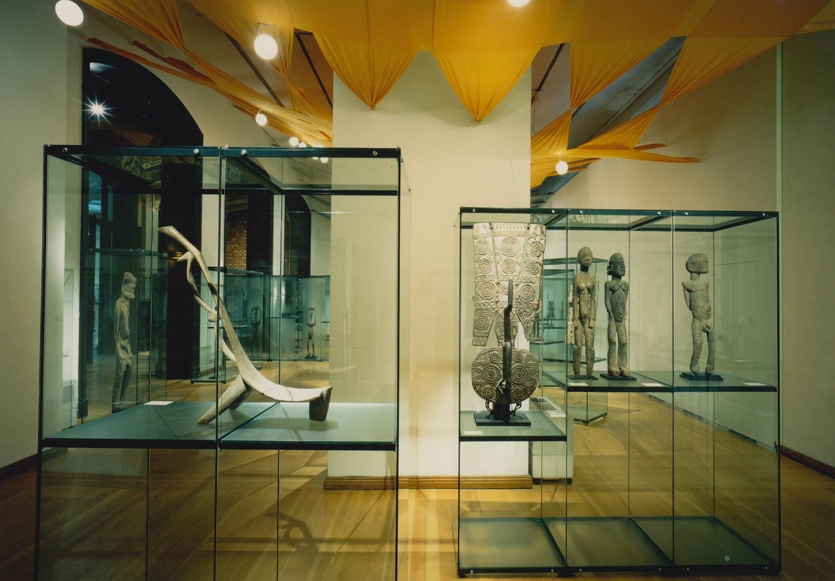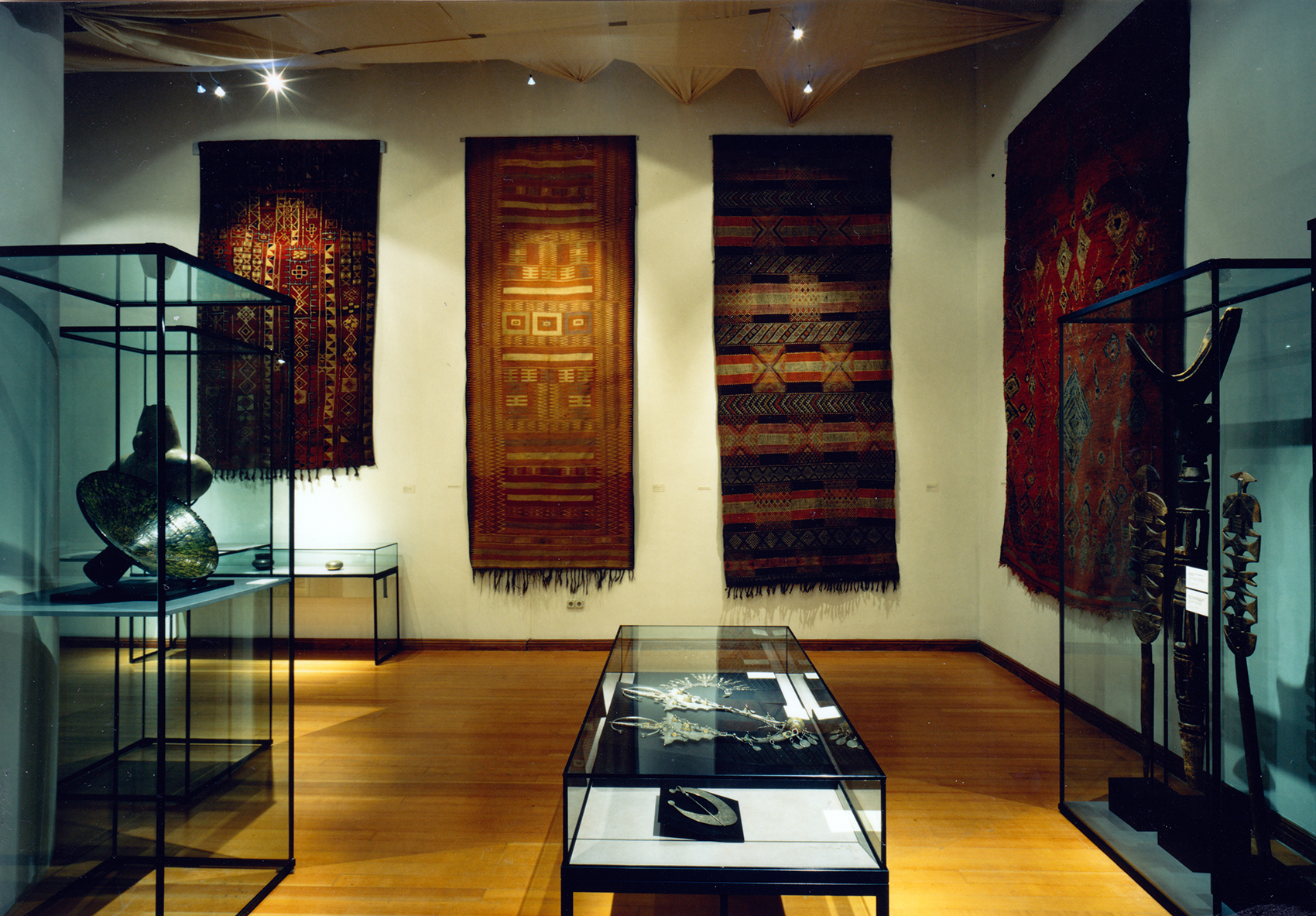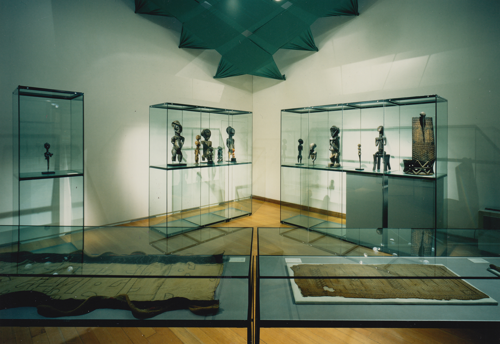 Die zum Teil historischen und zum Teil technischen Decken der Räume hätten die vornehmlich in Vitrinen präsentierten Objekte gleichsam allein gelassen, auch die Raumproportionen galt es anzupassen. Durch Vorbilder westafrikanischer Textilkunst entstand die Idee, eine Zwischendecke einzuweben, in die auch die Leuchtampeln an der jeweils richtigen Position eingehängt werden konnten.