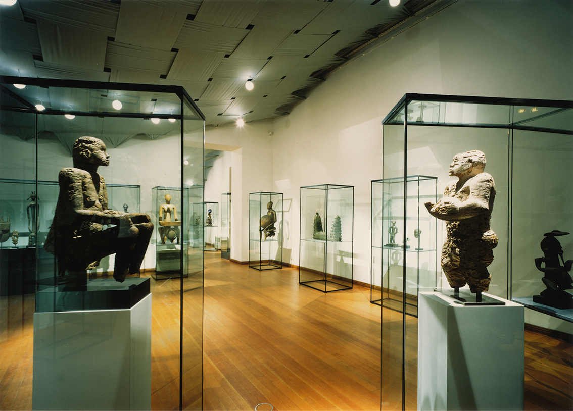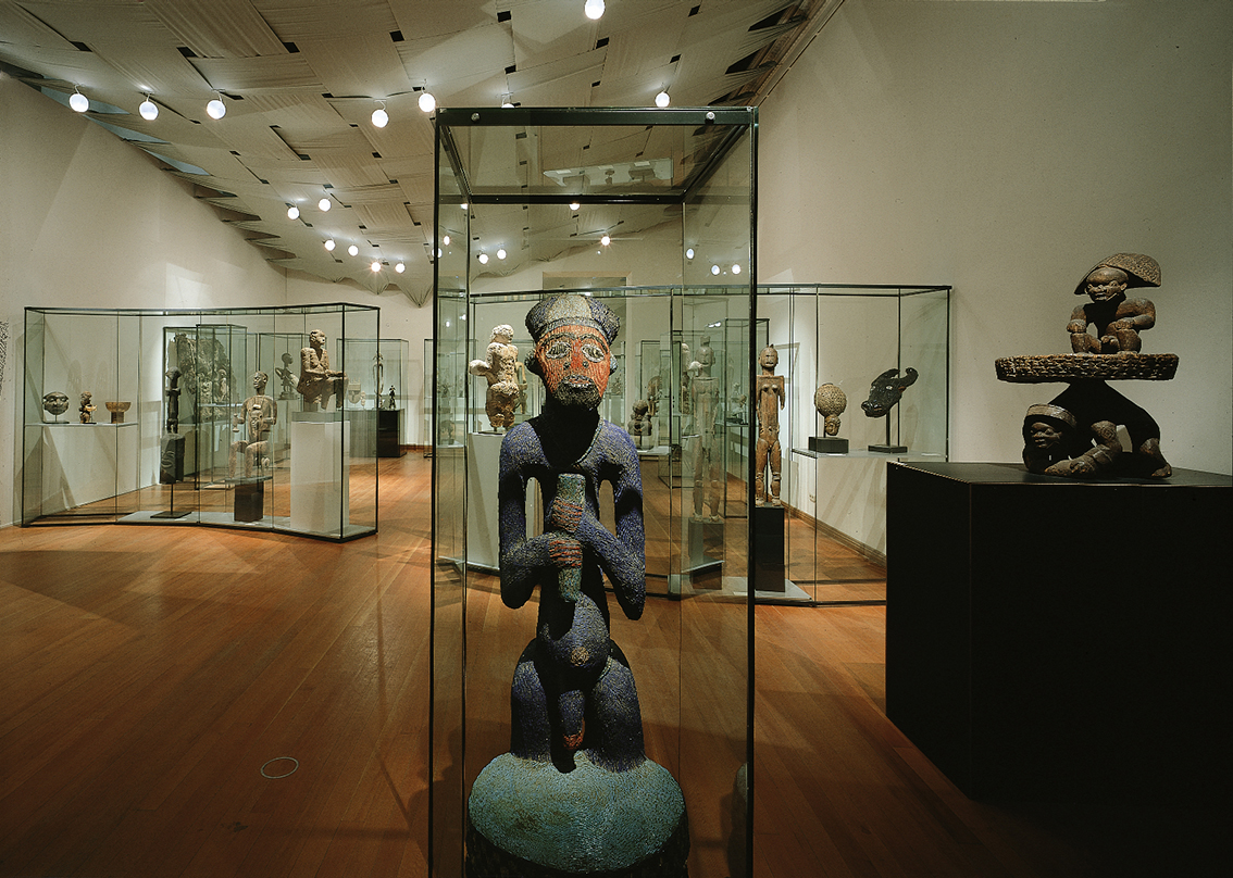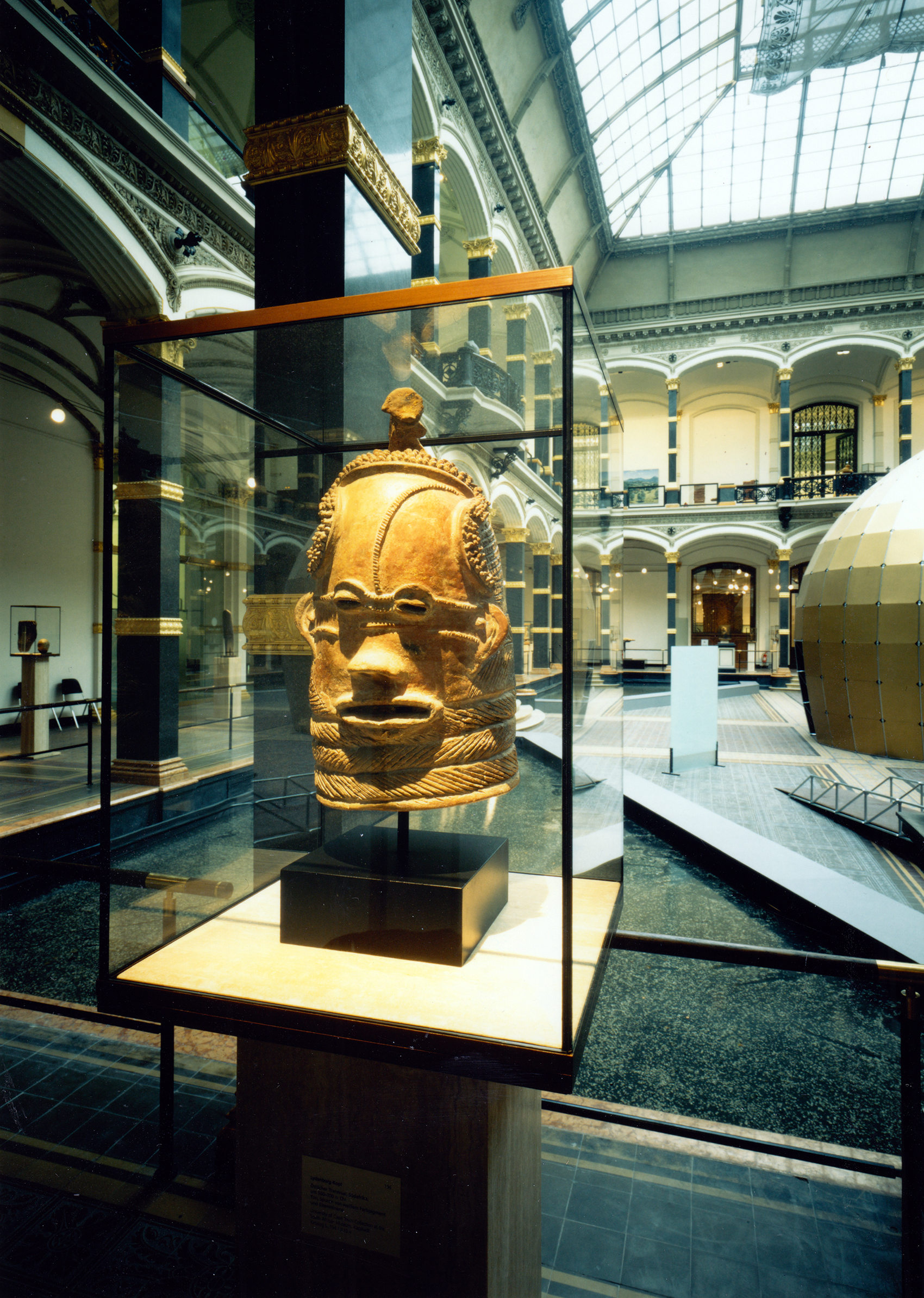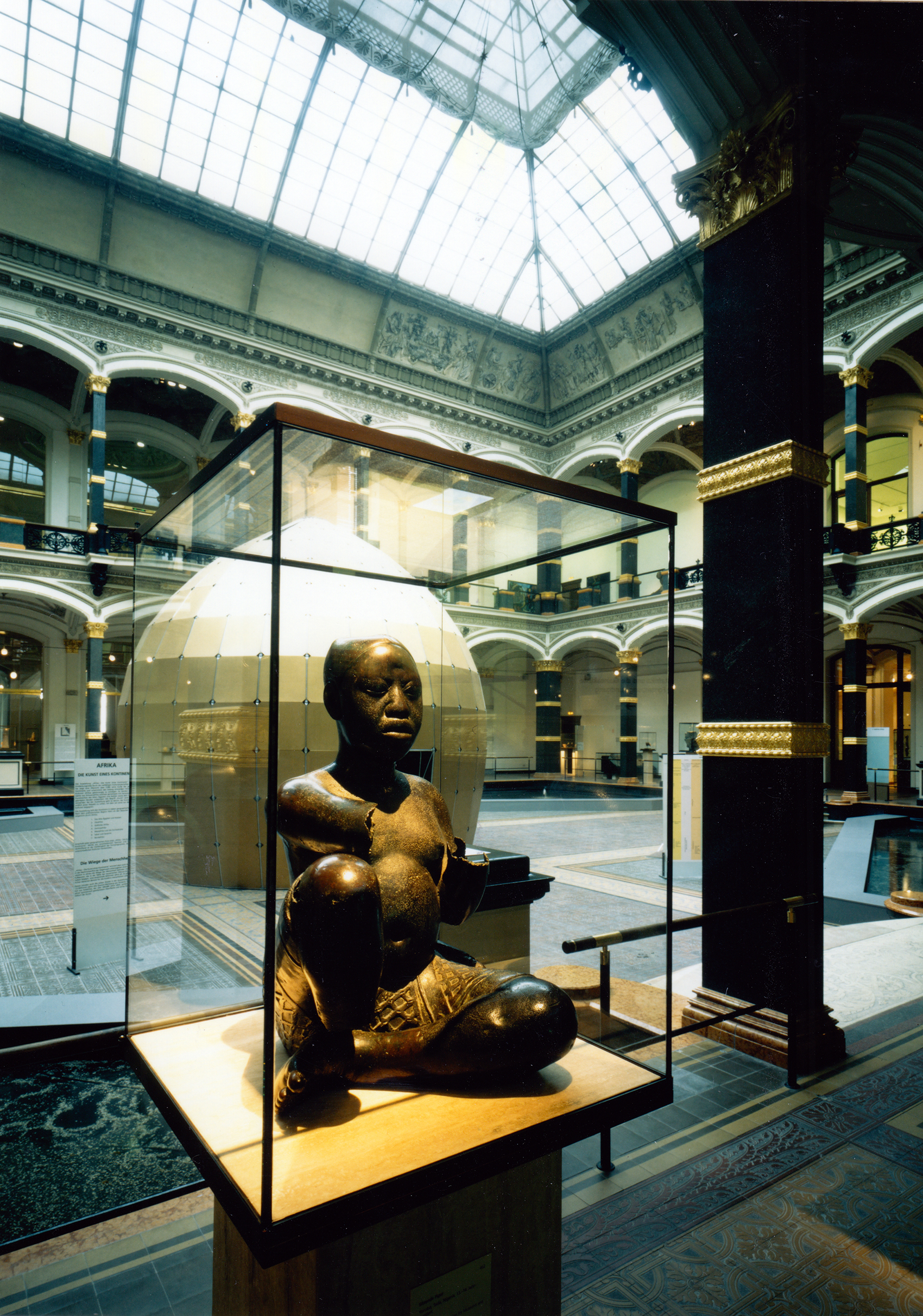 Der Lichthof blieb der Präsentation der weltweit ältesten Stücke vorbehalten, an denen Spuren menschlichen Tuns zu erkennen sind. Die Gestaltung einer »Urhütte« orientierte sich an westafrikanischen Vorbildern, aber auch an der Form des Eis. Hatte man die Hütte besichtigt, kam man in den Teil der Schau, die das alte Ägypten thematisierte, um danach in einem stimmigen Rundgang alle Regionen Afrikas zu besichtigen.