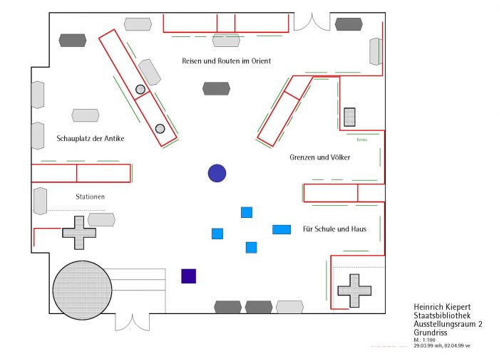 Der Leiter der Kartenabteilung Lothar Zögner und seine Frau Gudrun Zögner hatten mit ihrem Ausstellungskonzept fünf wichtige Etappen im Schaffen und Leben Heinrich Kieperts herausgestellt. Mit dem für die Kartenabteilung entwickelten Stellwandsystem konnten fünf Kabinette zu einem Ausstellungsablauf gefügt werden. In den durch Vitrinen ergänzten Kabinetten fanden die einzelnen Themen genügend Raum. Die verengten, auf einem Halbkreis gelegenen Ein- und Ausgänge führten immer wieder zu den prächtigen Globen, deren Segmente der Geograf und Kartograf Kiepert für unterschiedliche Größen und Zwecke erarbeitet und gezeichnet hat.