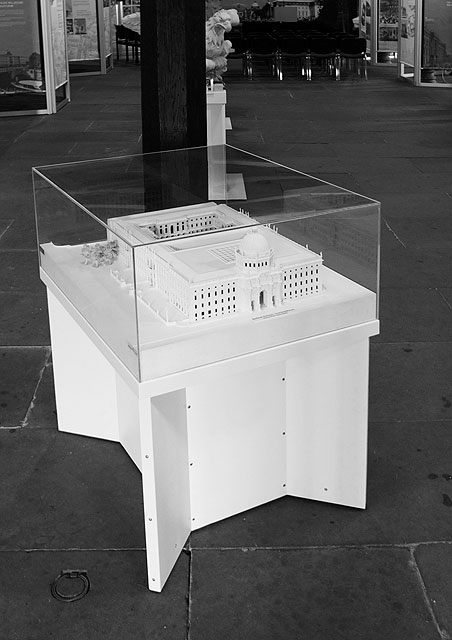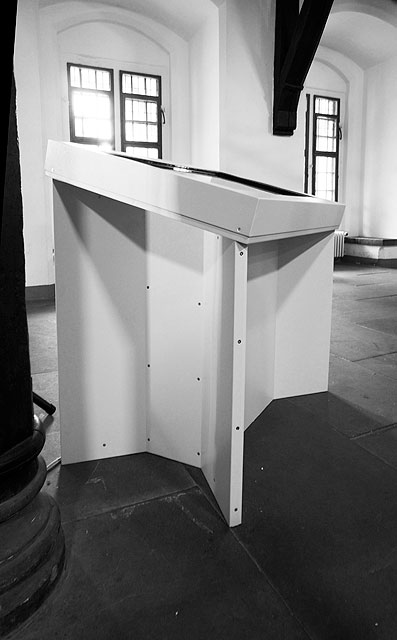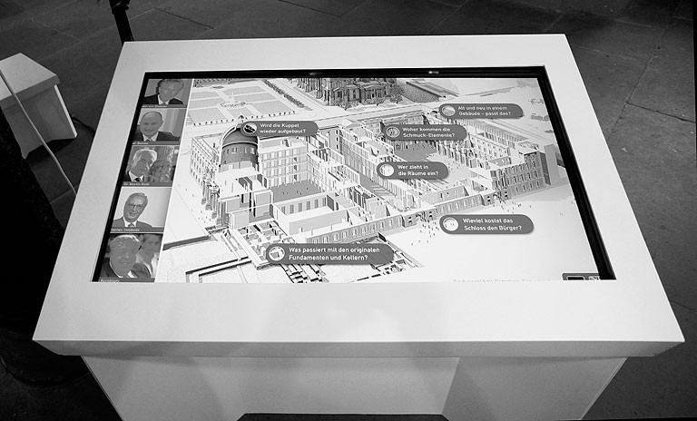 Anlässlich einer Spenden-Tournee des Fördervereins Berliner Schloss e.V. durch die Rathäuser deutscher Großstädte, entwickelten wir ergänzend zur bereits vorhanden Display-Ausstellung eine Ausstellungsmöbelserie. Neben Hockern, Podesten und Vitrinengestellen bildet der Entwurf einer Multimedia-Station mit Touchfunktion das Herzstück des Ensembles. Hier kann sich das Publikum spielerisch informieren, aber auch gezielt nach Inhalten suchen und vertiefend in die Geschichte des Berliner Schlosses und die Wiederaufbauplanungen als Humboldtforum eintauchen. Die Möbel sind wanderausstellungstauglich: Sie wurden aus robustem pulverbeschichtetem Blech hergestellt, lassen sich leicht zerlegen und wieder zusammensetzten.