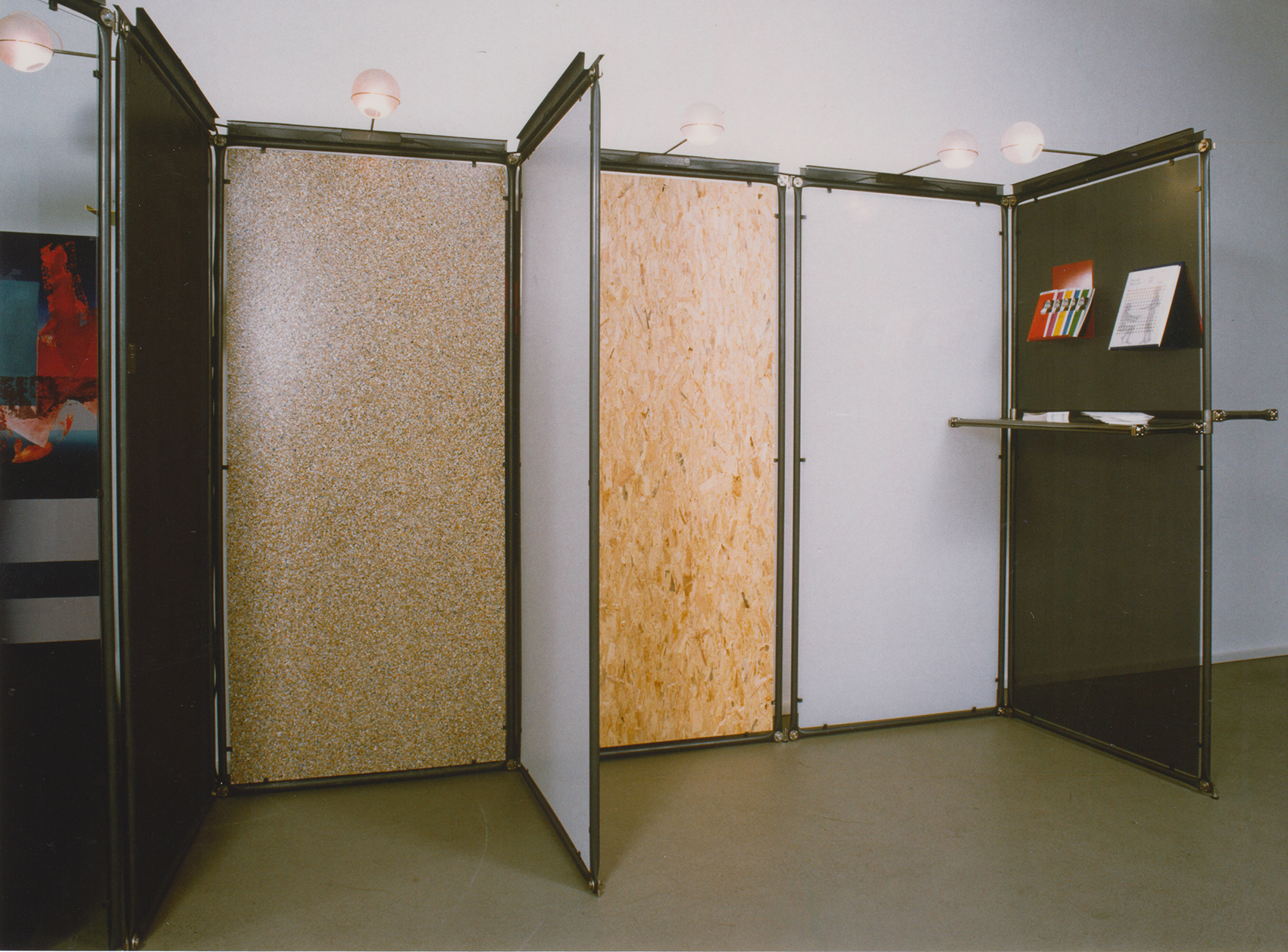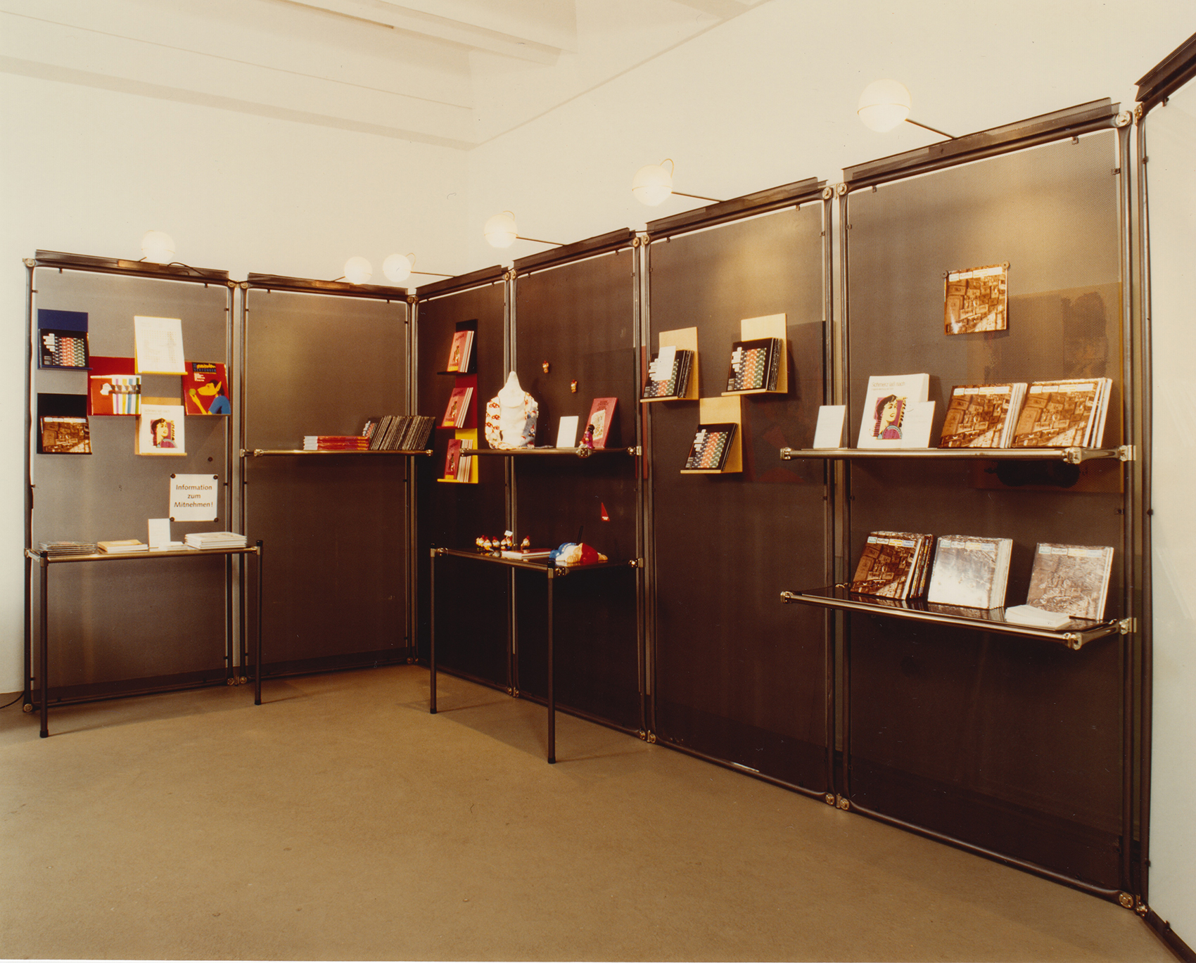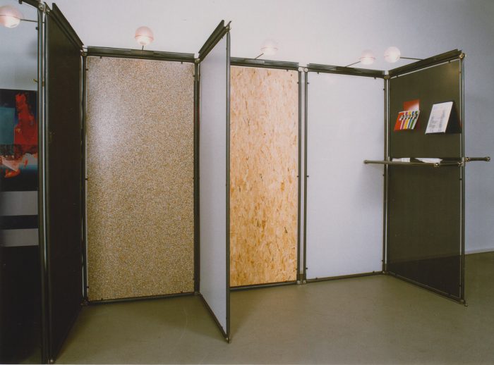 Für die Bien & Giersch Projektagentur GmbH, Berlin, entwickelten wir ein Ausstellungssystem mit verschiedenen Füllungen und aufgesetzter Beleuchtung. Basis waren Rohre mit einem Durchmesser von 28 mm im System 180©. In den oben liegenden Kanal können Kabel oder ähnliches eingelegt werden. Diese Kanäle dienen auch der Bilderabhängung und Befestigung von ausrichtbaren Kugelleuchten.