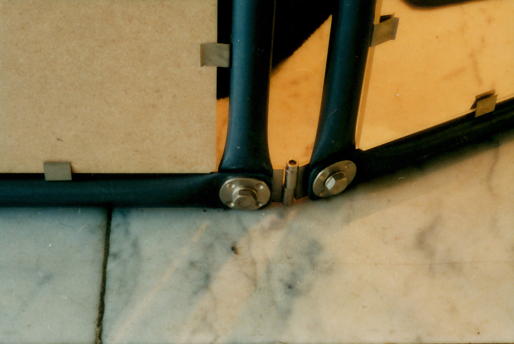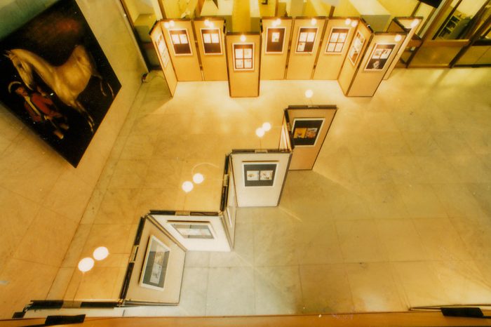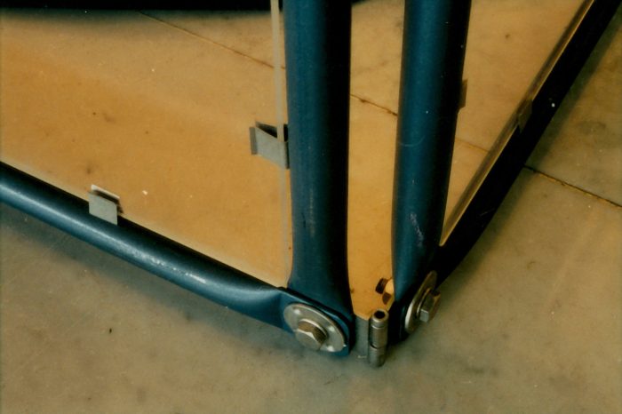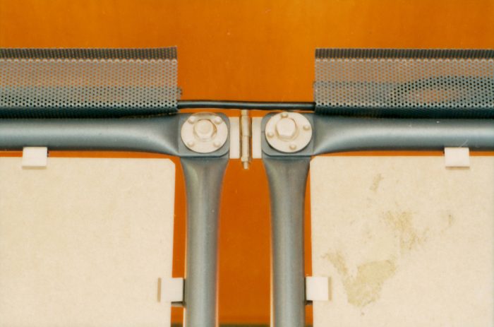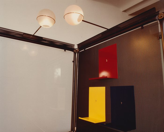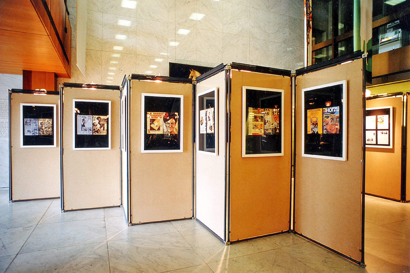 Für die Bien & Giersch Projektagentur GmbH, Berlin, entwickelten wir ein Ausstellungssystem mit verschiedenen Füllungen und aufgesetzter Beleuchtung. Basis waren Rohre mit einem Durchmesser von 28 mm im System 180©. In den oben liegenden Kanal können Kabel oder ähnliches eingelegt werden. Diese Kanäle dienen auch der Bilderabhängung und Befestigung von ausrichtbaren Kugelleuchten.