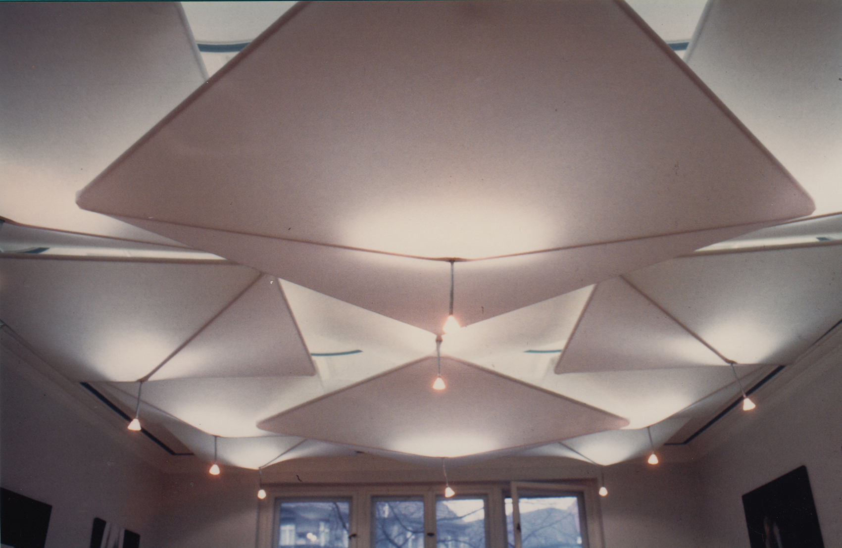 Nach der Herstellung der ersten professionellen textilen Lichtdecken in der Villa Grisebach wurde das Büro Steiner verschiedenerseits aufgefordert, ähnliche Produkte zu entwerfen und herstellen zu lassen. Die hier gezeigte Lichtdecke in einem Empfangsraum ist ›dreistöckig‹. Drei jeweils um 45 Grad gegeneinader verschobene Quadrate aus System 180 setzen jeweils in der Seitenmitte des darüber liegenden an.