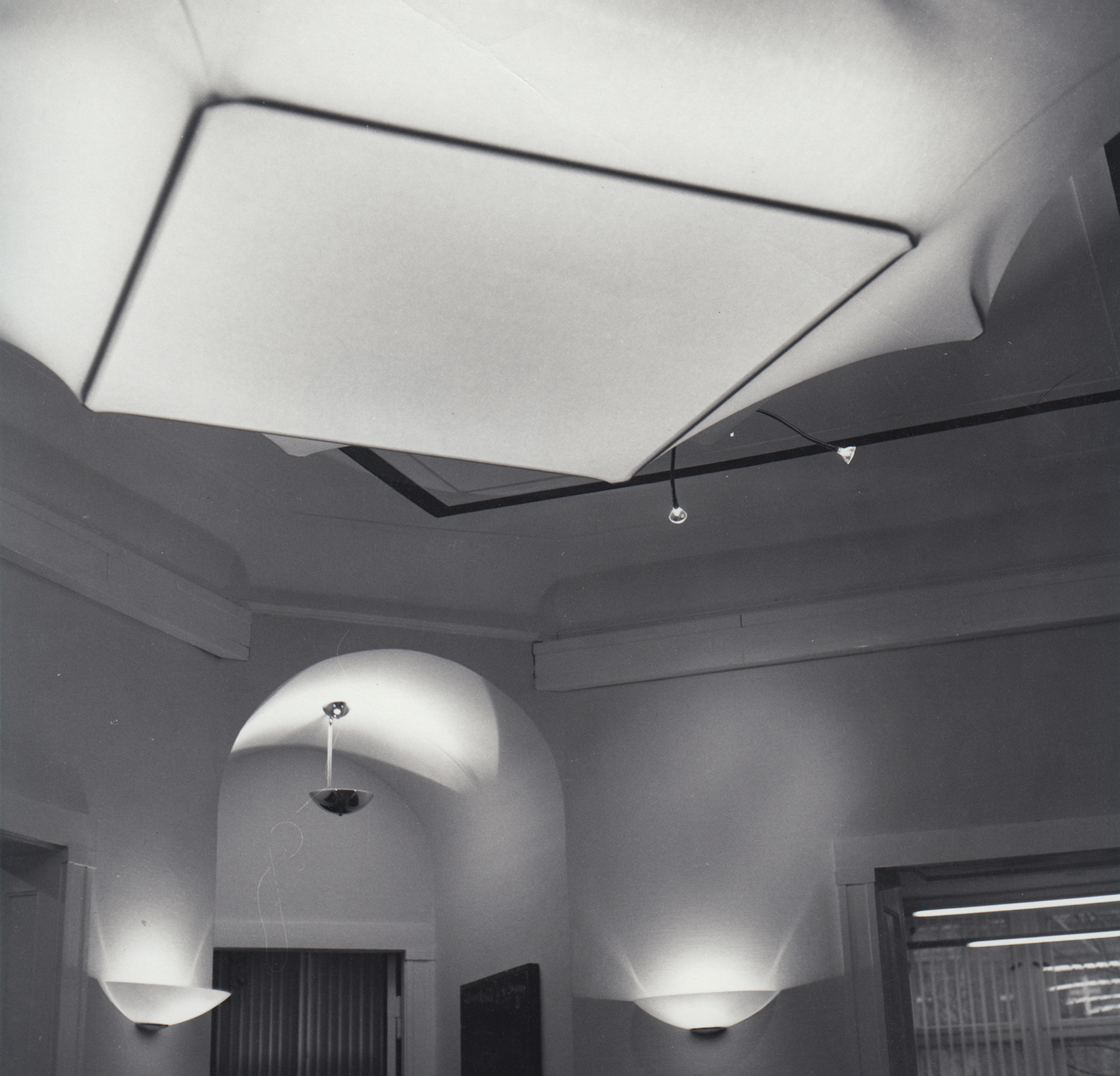 An den Ecken zeigen sich die Schatten der näher an die Haut aus gebleichtem Nessel (Shirting) reichenden Unterkonstruktion. Leuchtstofflampen in Stabform hinter der Stoffabspannung erzeugen diffuses, gleichmässiges Licht. Halogenlampen mit Schwanenhälsen setzen Lichtakzente an den Wänden.