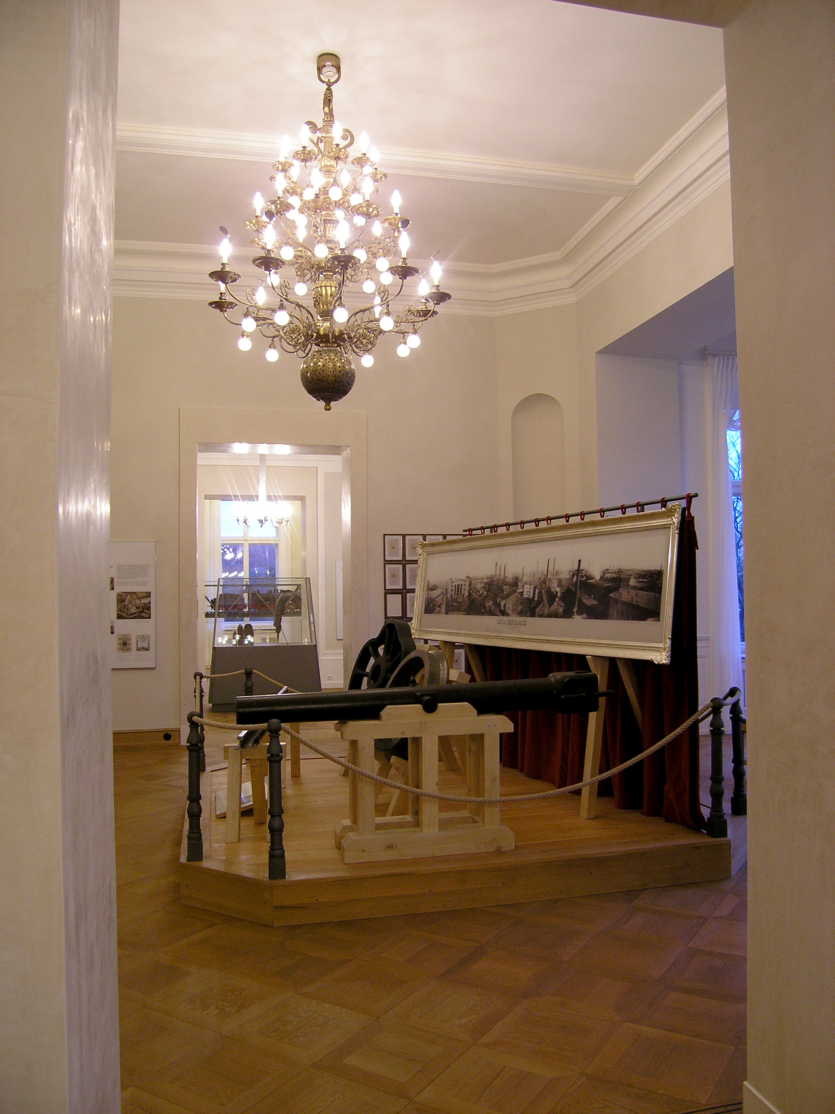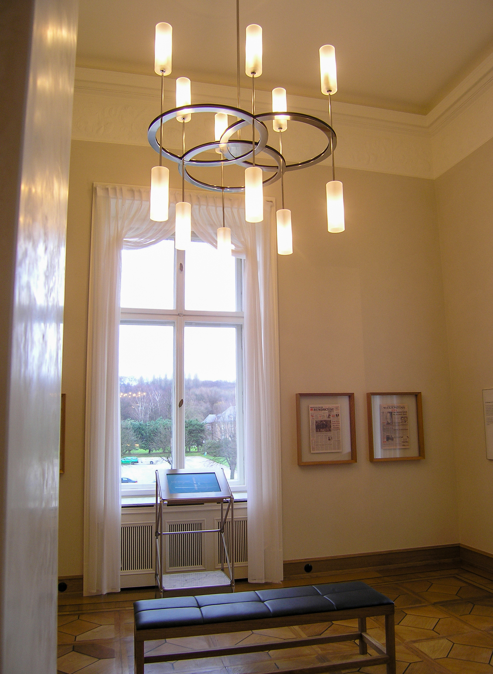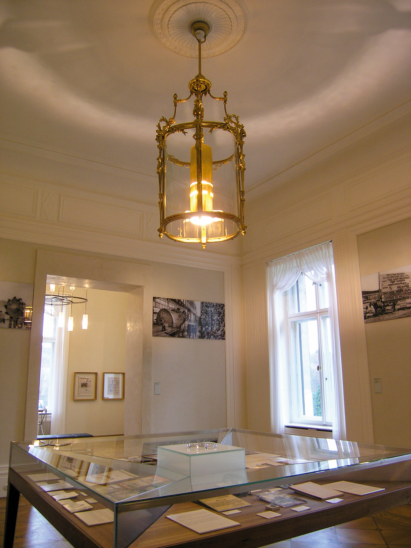 Ein zentrales Moment des 2004 gewonnenen Wettbewerbs zur Neugestaltung der ›Historischen Ausstellung Krupp‹ und der Ausstellung zur Alfried Krupp von Bohlen und Halbach-Stiftung im einstigen Gästehaus der Villa Hügel war der Dialog zwischen natürlichem und künstlichem Licht. Licht blieb auch bei der Realisierung der Historischen Ausstellung Krupp – Dauerausstellung ein zentrales Moment. Die Lichtobjekte sollten an der richtigen Stelle in den einzelnen Räumen die Zeit des jeweiligen Themas aufgreifen. Auf Dachböden und in Kellern der Villa Hügel waren Fragmente vieler Leuchter zu finden, andere konnten neu interpretiert werden. Die meisten Kronleuchter sind mit Niedervolt-Stiftsockellampen ausgestattet; eigens geblasene Kugeln und Kerzen aus teilmattiertem Quarzglas halfen, möglichst viel Licht auf die Wände zu lenken. Sowohl was Einsatz der Energie als auch sachgerechte Beleuchtung und integrales Design betrifft wurden Standards gesetzt.