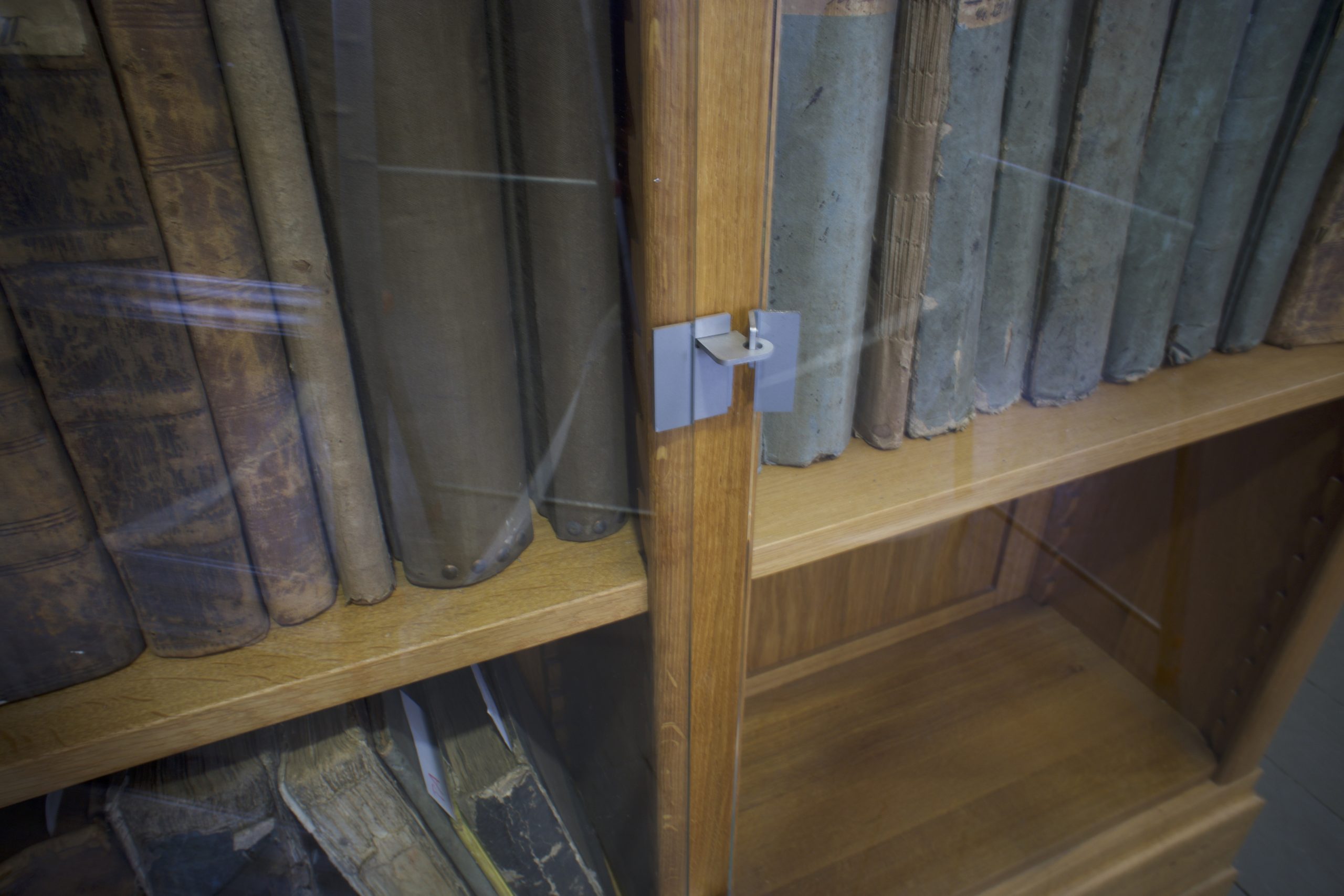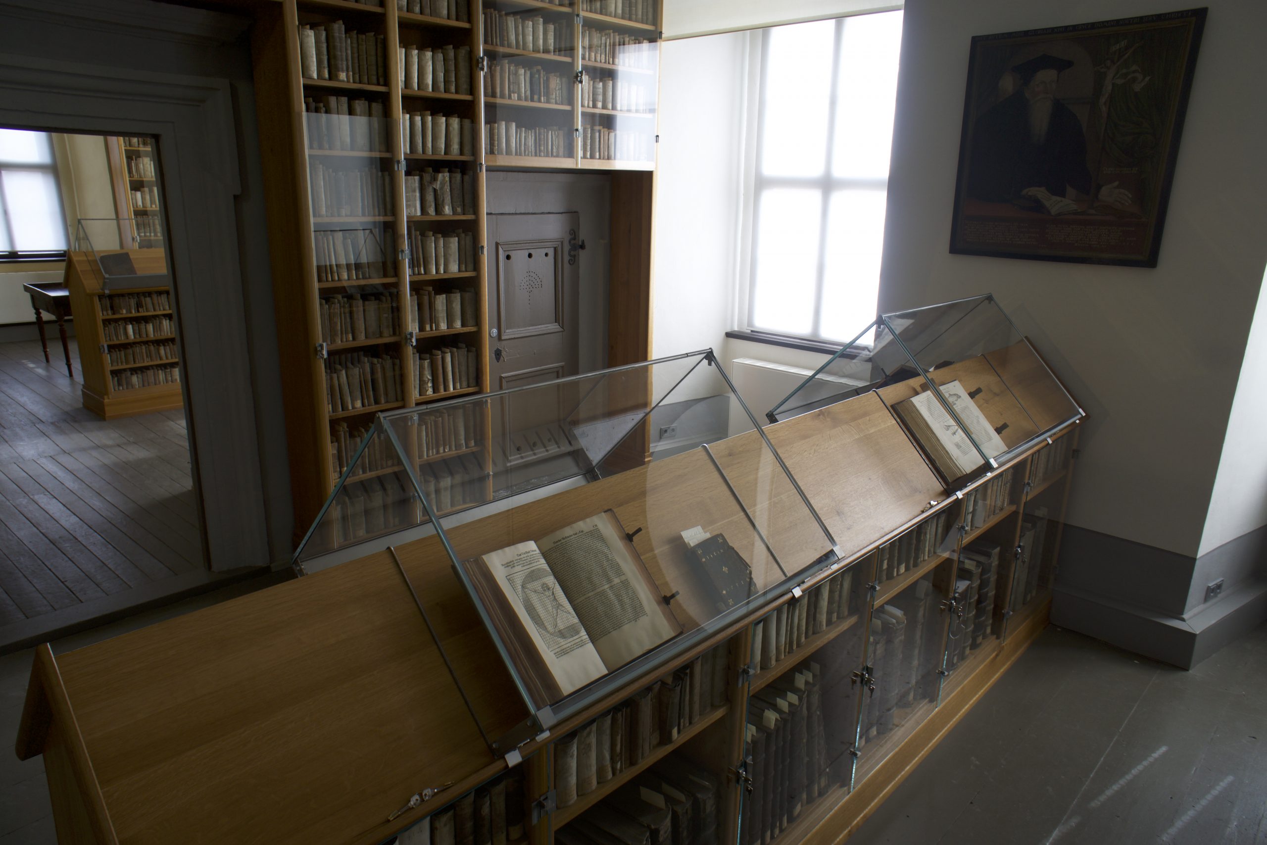 Auch die Bibliotheksräume im Torhaus mit allen Schätzen sollen dauerhaft für die Öffentlichkeit zugänglich sein. Die Bibliotheksräume sind mit hochwertigen, rezenten Bibliotheksregalen und Lesepulten mit Regalunterbau aus massiver Eiche ausgestattet. Anfang 2016 entwickelten wir drei verschiedenartige Mustertüren als mechanische Sicherung der Bücher.