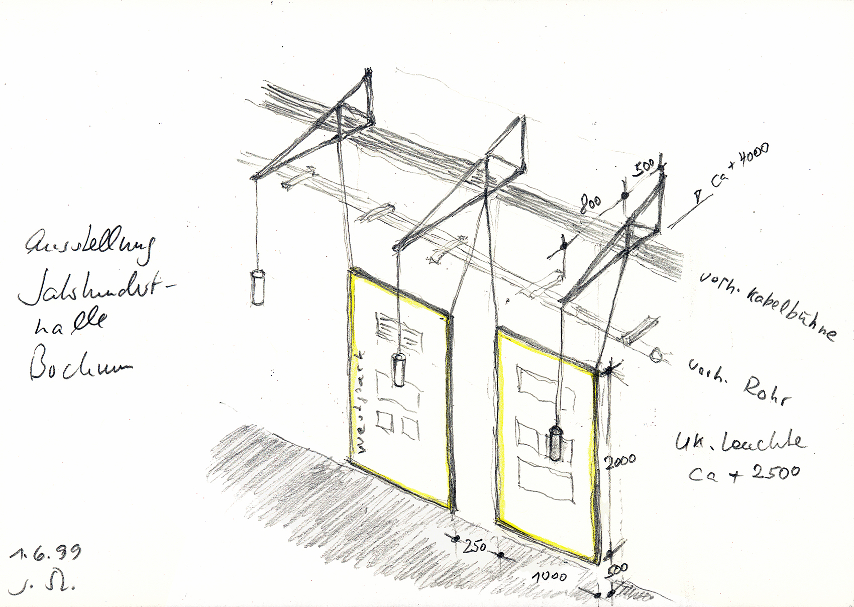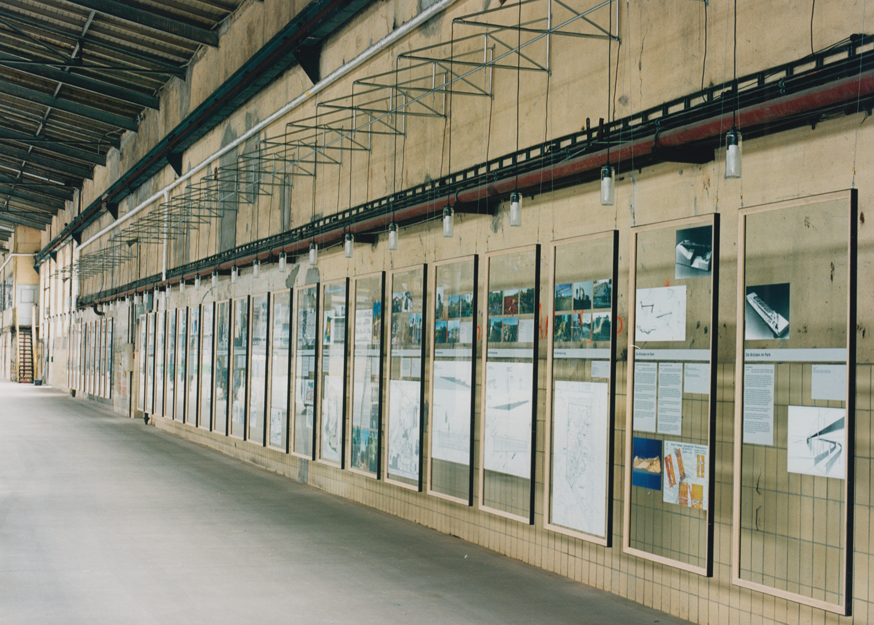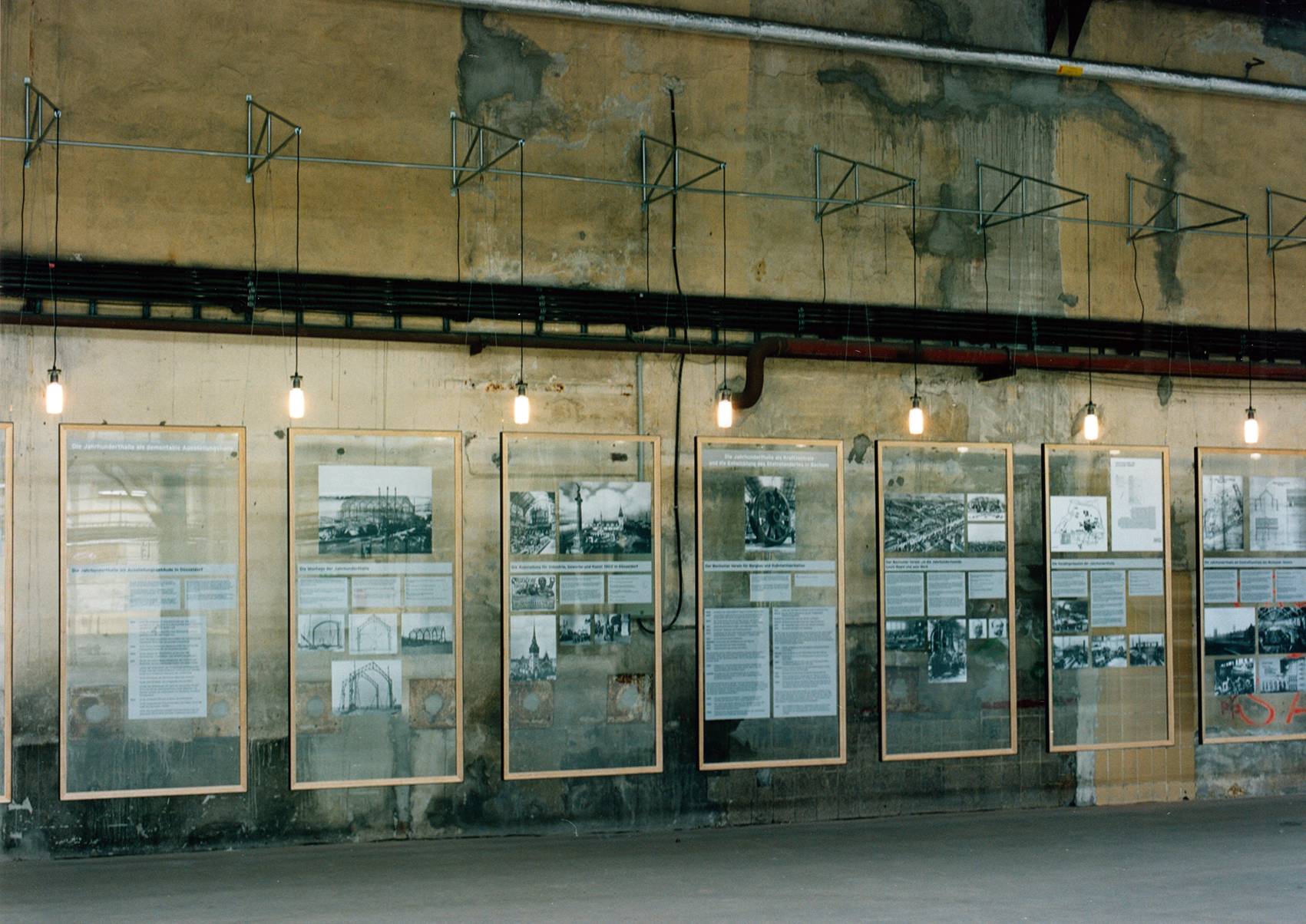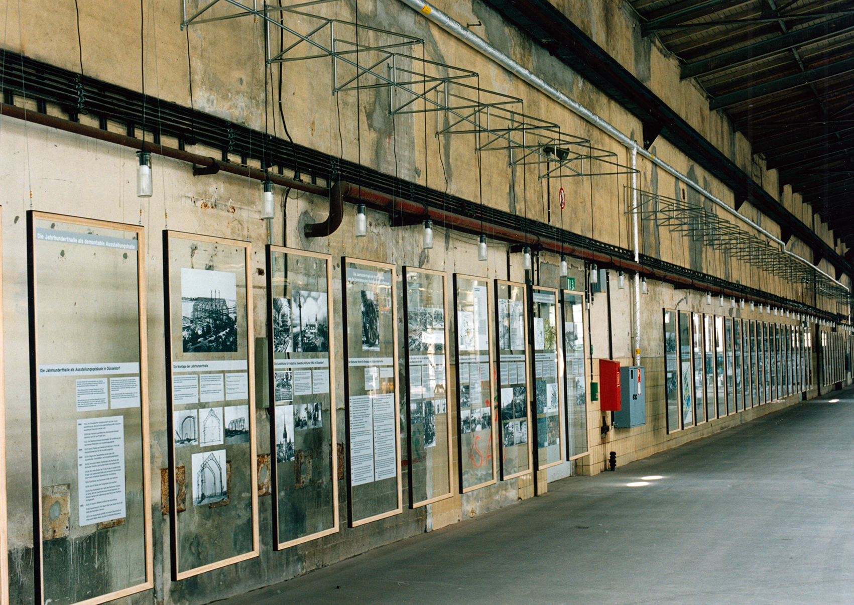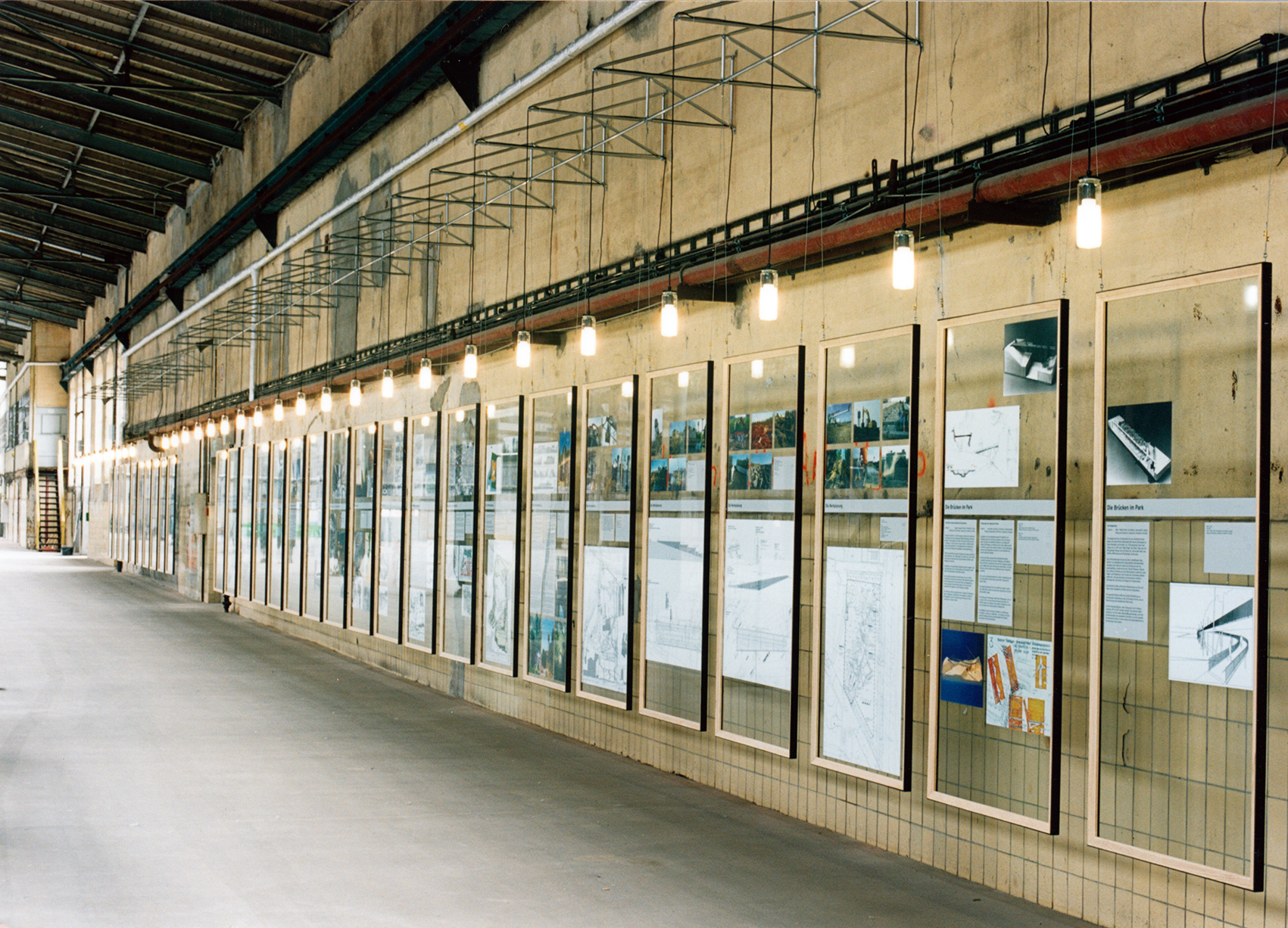 Das ehemals industriell genutzte innerstädtische Gelände rund um die Jahrhunderthalle ist immer noch in einem tiefgreifenden Umnutzungs- und Umgestaltungsprozess begriffen. Das bewog im Jahr der Abschlusspräsentation der Internationalen Bauausstellung Emscher Park die Landesentwicklungsgesellschaft, das Bonner Büro der Partnerschaft Prof. Sieverts, Traummann, Knye-Neczas, Stadtplaner und Architekten, mit der Konzeption einer Ausstellung zu beauftragen, die das Büro Steiner gestaltete. Der Bau blieb unverändert. Lediglich feine Rohrkonsolen wurden an die Wand gedübelt und daran Rahmen und Beleuchtung abgehängt. In Stahlrahmen legten wir zwei Glasplatten ein, die hintere mit Fotos, Dokumenten und Texten kaschiert, die vordere zum Schutz.