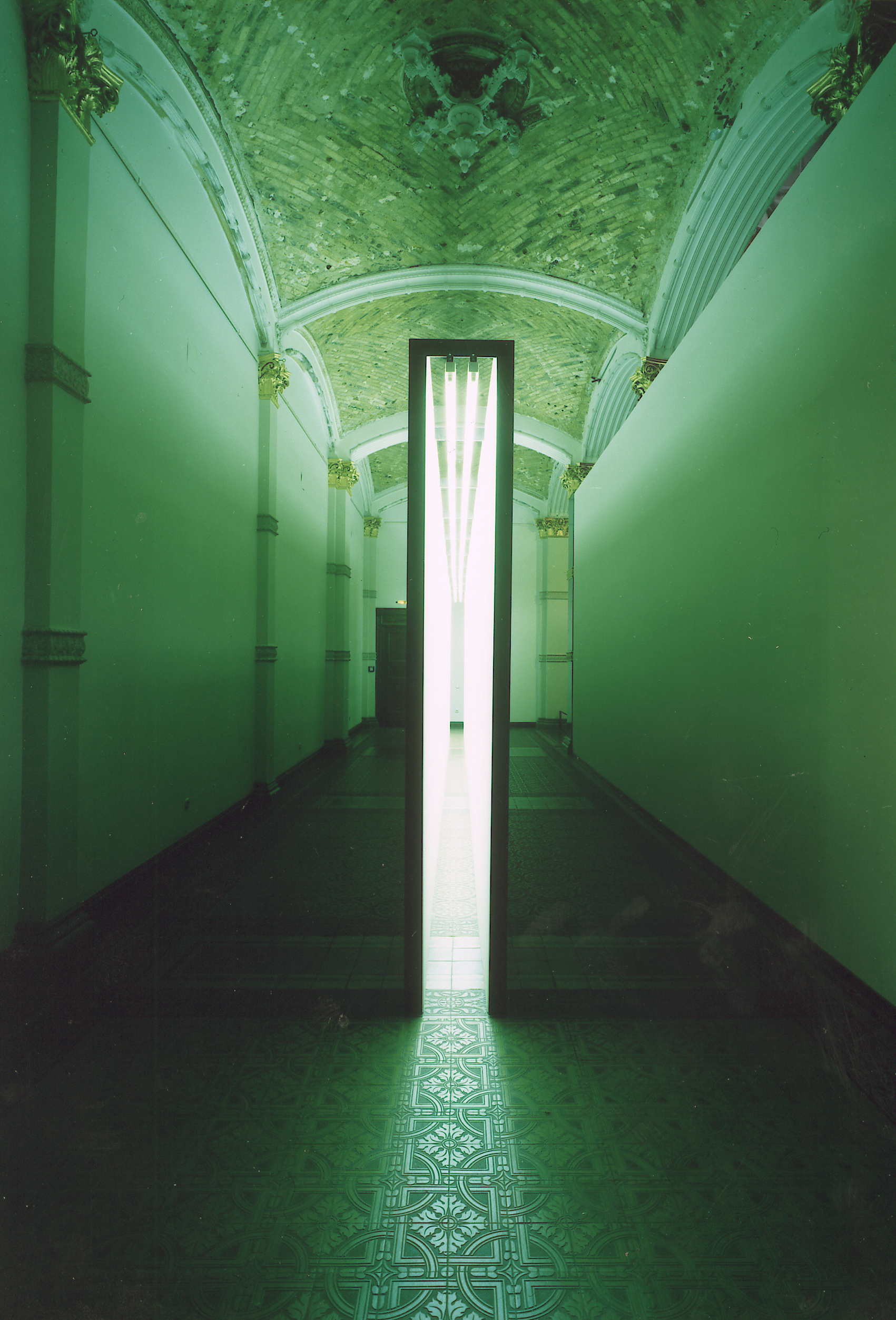 Zwischen den Flachstahlrahmen wurden mit Gipskarton belegte Holzrahmen geschraubt. Die doppelte Lichtleiste aus grün leuchtenden Leuchstofflampen bot denjenigen, die sich durch den engen Korridor zwängten, einen überwältigenden optischen Eindruck: Hatte sich das Auge auf die Lichtfarbe im Korridor eingestellt, verschob sich beim Heraustreten das Farbspektrum, sodass man glaubte, sich im Irrealen zu befinden.