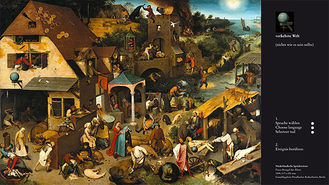 Das Erstaunen ist groß, im Dachgeschoss des Neuen Palas auf der Burg Altena einen Zeltraum zu betreten, mit einer Allee von 26 gleichen Vitrinen, über denen jeweils ein Schlagwort leuchtet und dazu passende Originalobjekte zusammen mit einer vertiefenden Erläuterung würdig präsentiert werden. Man geht durch die Doppelreihe der Gehäuse auf einen Touch Screen zu, auf dem das Bild »Niederländische Sprichwörter« von Pieter Bruegel dem Älteren aus dem Jahr 1559 zu sehen ist. Einzelne der über hundert Szenen lassen sich anwählen, um dann am rechten Rand isoliert gezeigt, bezeichnet und erläutert zu werden. Der Zusammensetzung des Publikums kommt entgegen, dass deutsch, englisch und niederländisch anwählbar sind. Zwei Herangehensweisen, sprachliche Begriffe aus dem Mittelalter und der frühen Neuzeit ins Heute zu übersetzen, befruchten sich gegenseitig.