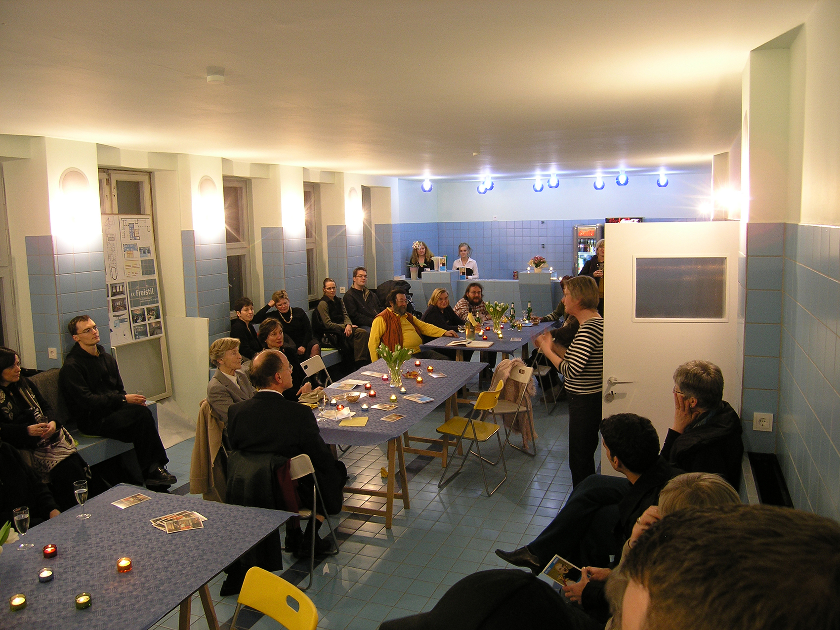 Gabriele Berger, Eigentümerin des stillgelegten Stadtbads Steglitz aus dem Jahr 1908, wünschte sich in einem ehemaligen Schulungsgebäudeteil ein Café, bei dem wir uns ein Schwimmbecken als gestalterische Leitlinie vornahmen. An drei Seiten bieten geflieste Bänke Platz auch für viele Gäste. An der Stirnseite mit Küchen- und Tresenkomponenten dienen drei ›Startblöcke‹ als Stehtische oder Platz zur Aufstellung von Angeboten. Die eingelegten Streifen am Boden, das Mobiliar aus Edelstahl, die Überlaufgitter hinter den Bänken täuschen manch einem Gast vor, er befinde sich in einem umgenutzten Bad. Auch weil Vorhandenes wie Türen und Fenster liebevoll aufgearbeitet wurde, ist ein besonderes Beispiel einer themenorientierten Gastronomie entstanden.