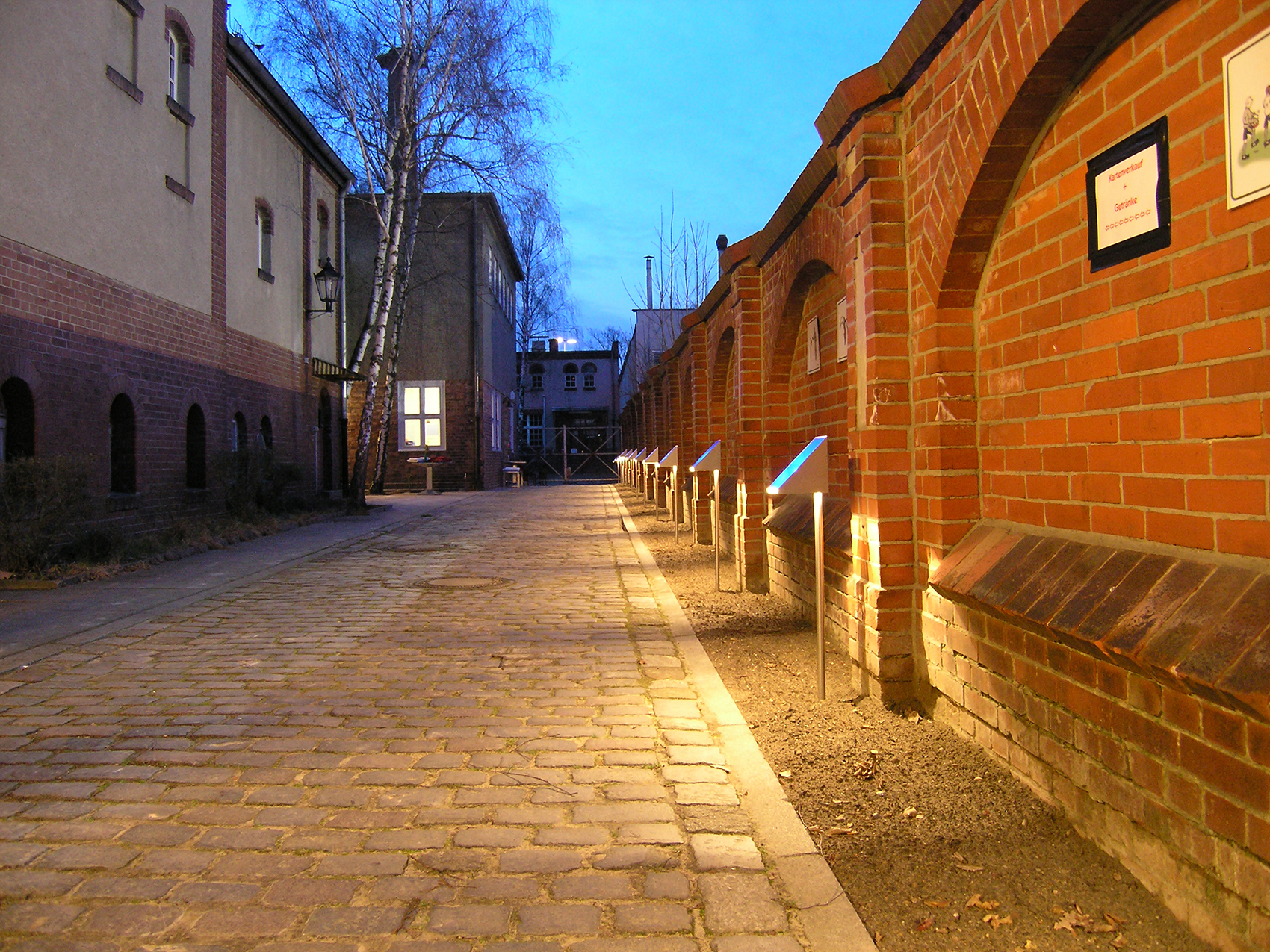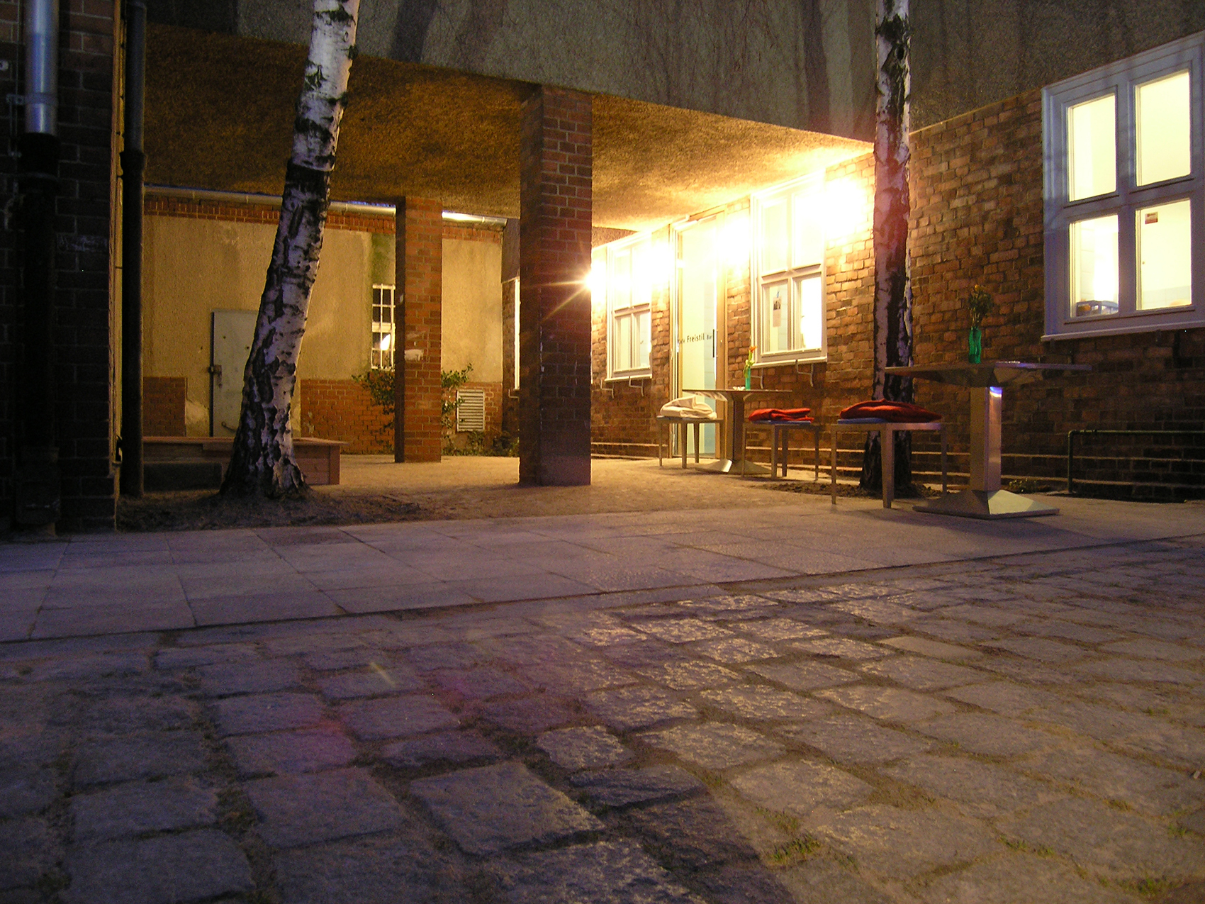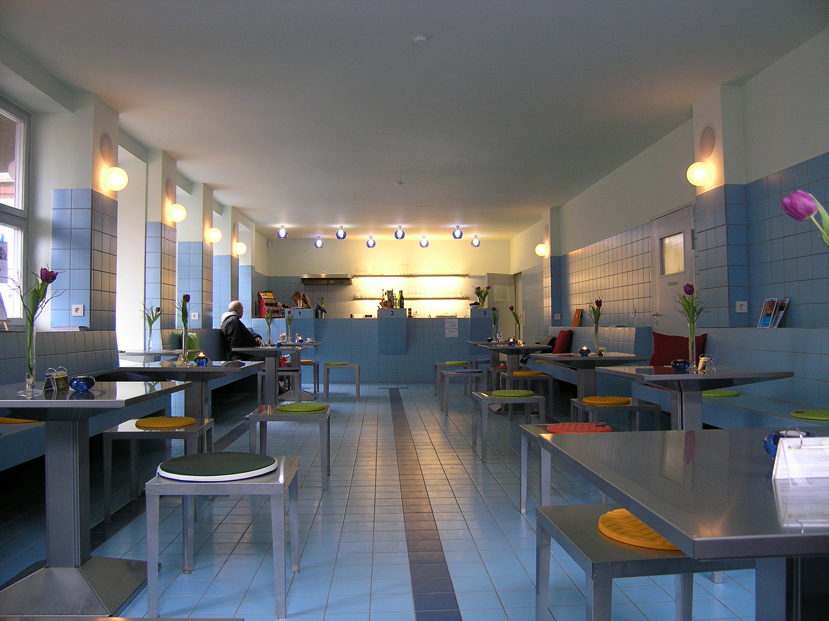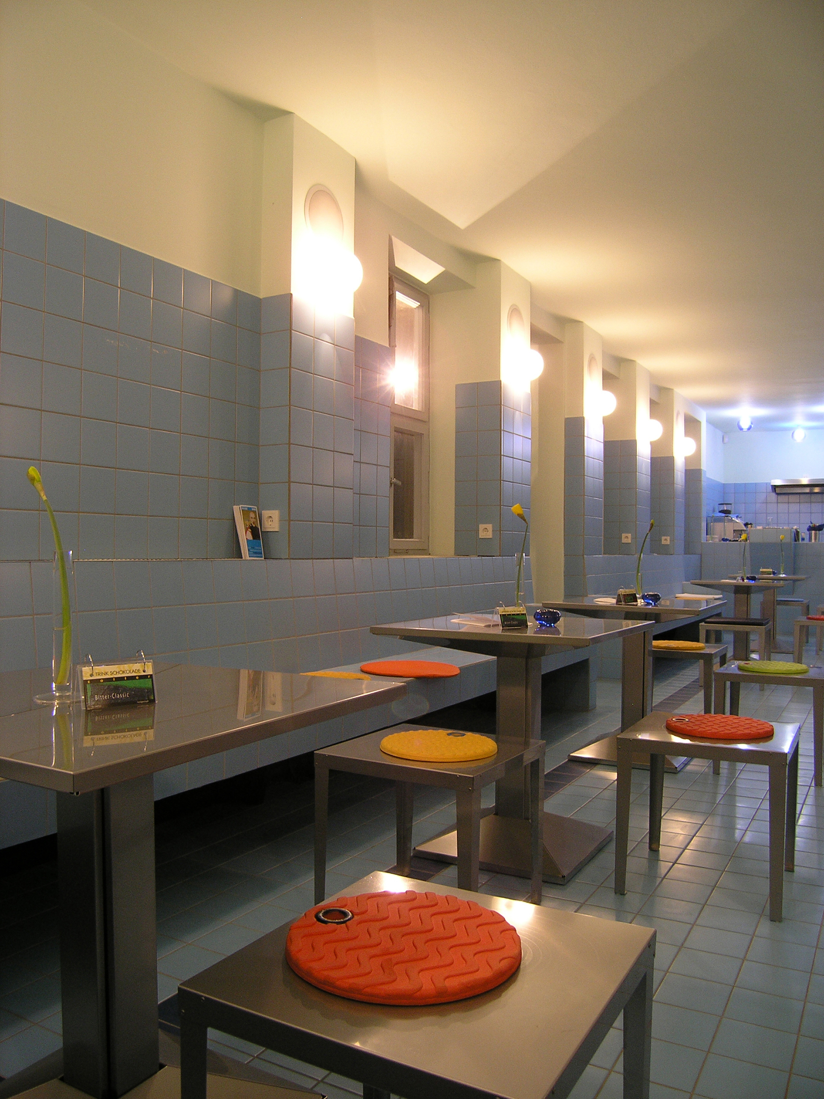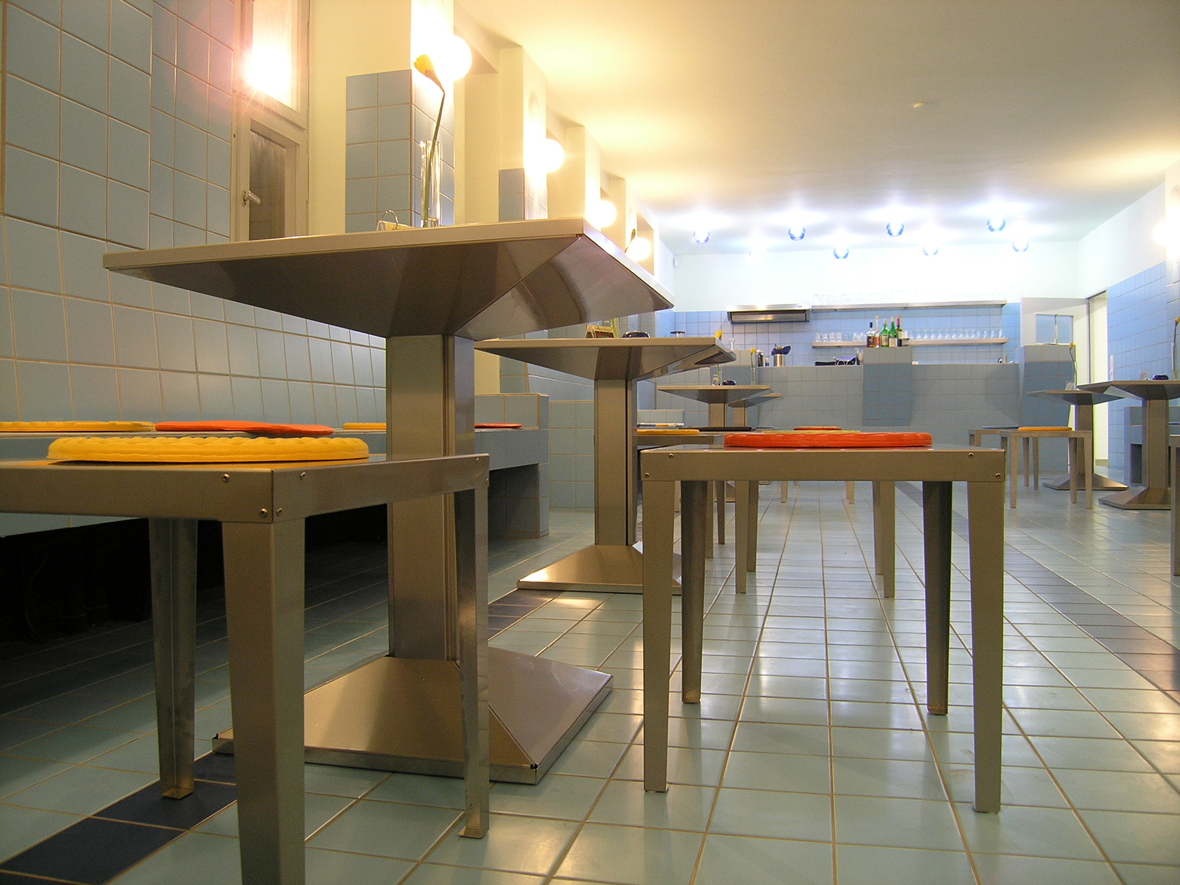 Der Tisch und die stapelbaren Hocker aus gefaltetem Edelstahlblech sind besonders leicht. Die beiden Typen Beleuchtungskörper im Innenraum unterscheiden sich in Größe, Farbe und Lage: Über dem Tresen hängen blaue Kugeln, die in diesem Bereich ein eher kühles Licht für die dort Arbeitenden erzeugen. Im Gastraum ragen mattierte Kugeln aus der Wand und geben ein diffus-warmes Licht. Beide Leuchten lassen sich mit stromsparenden Lampen betreiben. Die Außenbeleuchtung dient der blendfreien Beleuchtung des Bodens und färbt die Längswand des Stadtbades in sanftem blau.