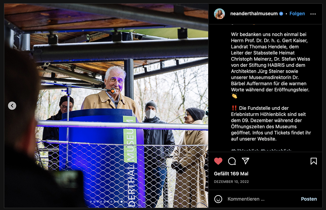Am 8. Dezember 2022 wurde der ›Höhlenblick‹ als Hauptattraktion unweit vom Neanderthal Museum eröffnet. Das Publikum kann nun hoch hinauf bis zur Stelle, an dem 1856 Teile der weltberühmten Gebeine des Neanderthalers gefunden wurden.