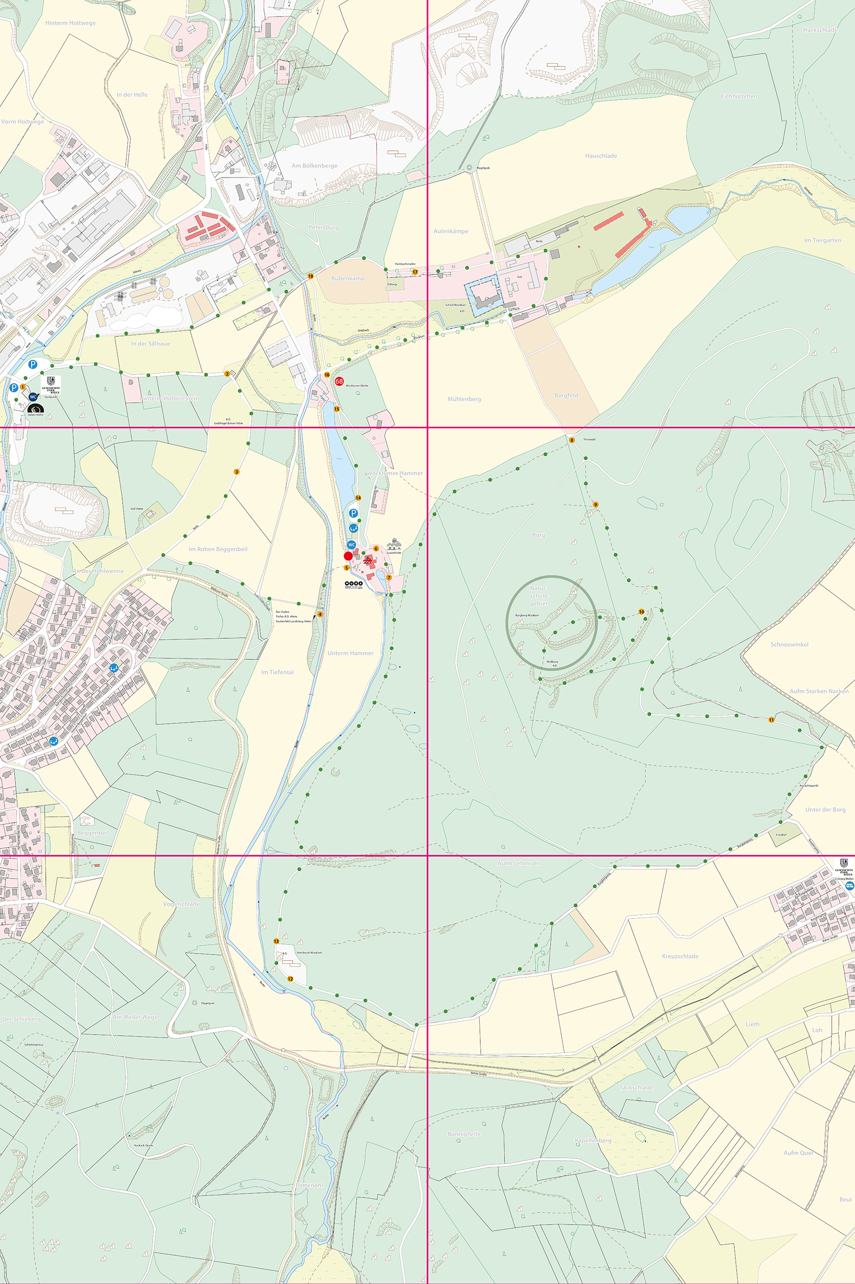 Bevor das Publikum die Luisenhütte in Balve-Wocklum besucht, meldet es sich im gegenüber liegenden Insthaus an. Bis vor einiger Zeit war hier die Kasse in der Hüttenschänke untergebracht. Heute gilt pay what you want: auf dem Tresen der Gaststätte ist ein Behälter aus Acrylglas mit Schlitz aufgestellt, damit das Personal dezent nachvollziehen kann, was eingelegt wird. Der Vorraum, der zu einem Büro hoch- und zu den Toiletten hinunterführt, wurde als richtiger Ort für eine interaktive Informationskarte der Umgebung auserkoren. Der »Rundweg Geschichtspark Balve« kann in drei Sprachen angewählt werden und wird durch Leuchtpunkte angezeigt – der Weg mit kleinen grünen Punkten, wichtige Situationen mit orangenen größeren Kreisen, die auch auf einer Liste am rechten Rand erläutert werden. Die Karte ist als Hinterglasdruck konzipiert und demnach unbrennbar. Der Plan zeigt ein Kartenbild im Maßstab 1:1750, einzelne Glasplatten zeigen einen Ausschnitt von 1000 × 1000 Metern. Sie sind 570 x 570 mm groß und lassen eine 1,4 Millimeter breite Fuge zur nächsten Platte.
