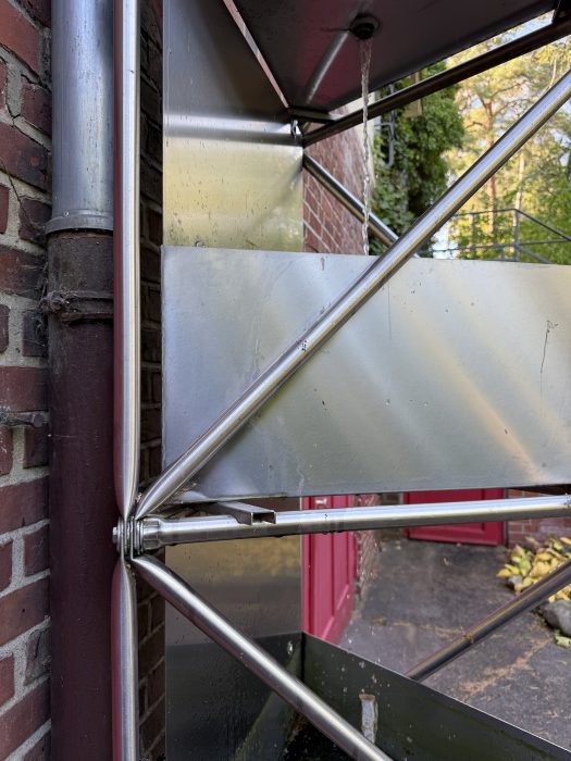 Über Jahre plagten Waschbären die Bewohner des Hauses Heerstraße 97 in Berlin-Westend. Kammerjäger und Dachdecker bemühten sich in regelmäßigen Abständen um Abhilfe. Ein Problem war hausgemacht: Die Wasserkaskade an der Nordostecke des Hauses ist eine bequeme Aufstiegshilfe, die von den Tieren gern benutzt wurde.