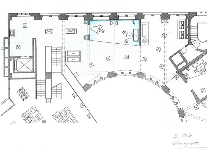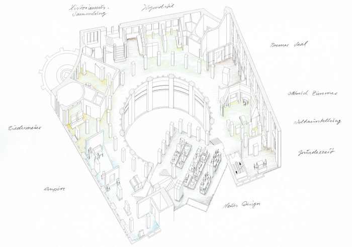 Bei der jetzigen, dritten Phase des Wettbewerbs, haben wir den Wunsch berücksichtigt, den Haupteingang an der bisherigen Stelle in der Südostecke des Museums zu belassen. Die selbstgestellte Forderung, einen Rundgang durch die Abteilungen des Museums gewährleisten zu können, hat unser Konzept weitgehend bestimmt. Grundlage ist hierbei nicht eine strenge und formale chronologische Reihenfolge, sondern die Abfolge einzelner Themen, die jeweils einen Teilbereich hervorheben und sich logisch in die Reihung, die durch den Rundgang vorgegeben wird, einpassen.